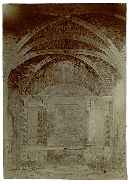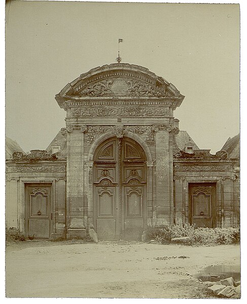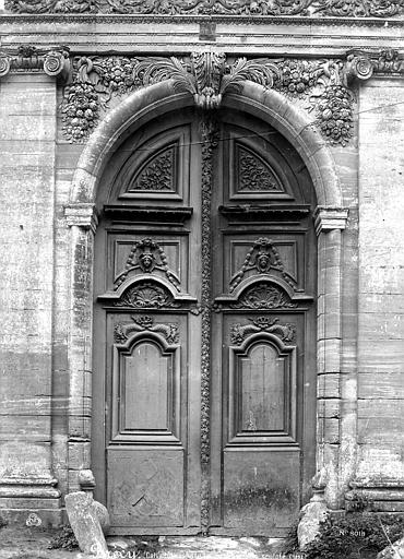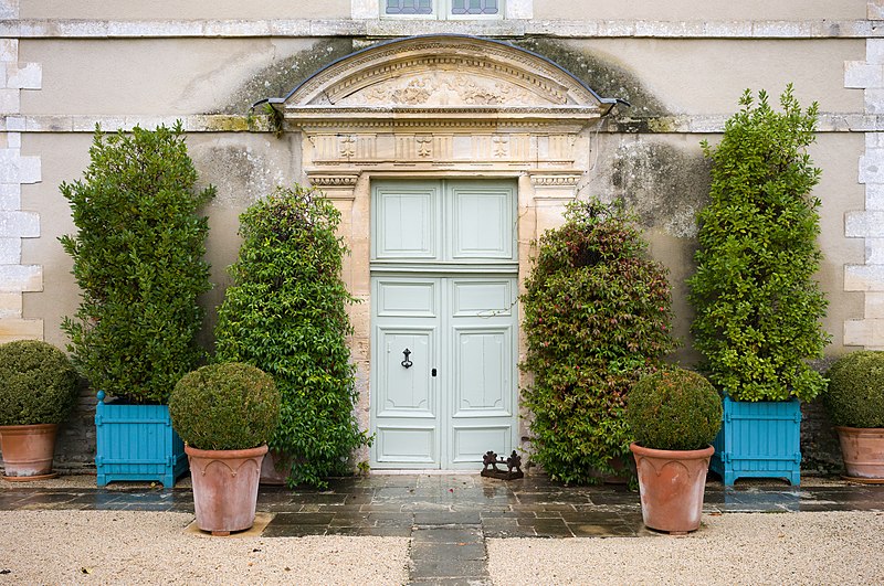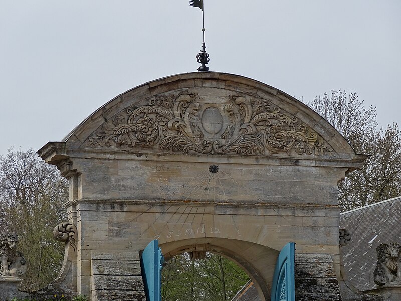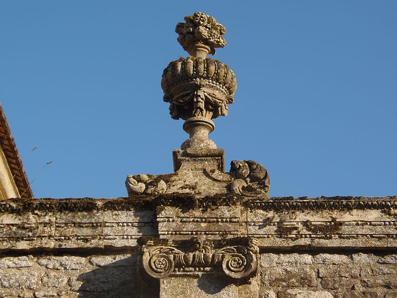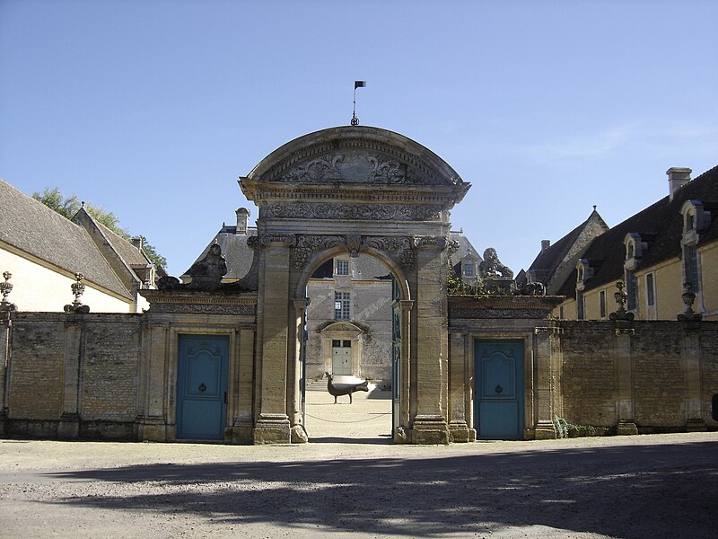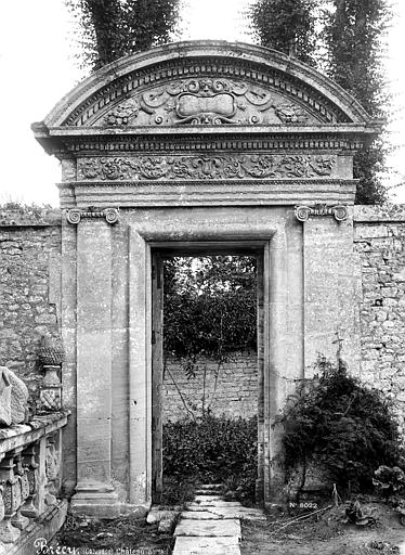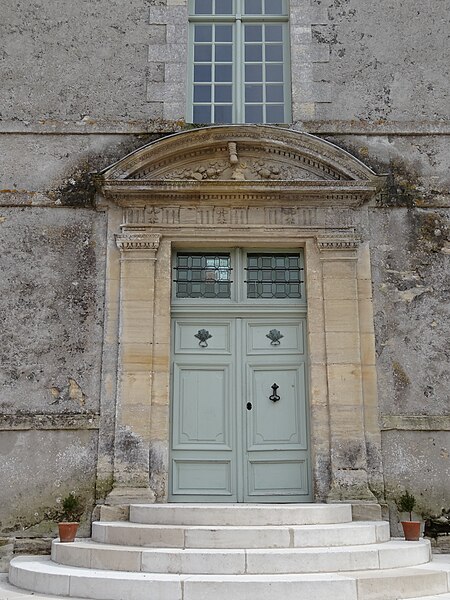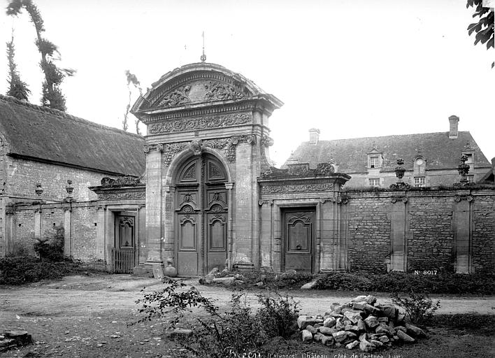 Le portail monumental, daté du XVIIe siècle et richement sculpté dans le style Louis XIII, ouvre sur une cour fermée par deux bâtiments perpendiculaires à l'habitation ; il comporte une grande porte charretière flanquée de deux portes piétonnes. La porte centrale en plein cintre est encadrée de pilastres aux chapiteaux ioniques, surmontée d'un entablement orné de motifs végétaux et d'une corniche à denticules et oves ; le fronton, décoré des mêmes motifs, a vu son écusson armorié gratté pendant la Révolution. Les deux portes latérales à linteau droit reprennent des décors similaires et sont coiffées d'une sculpture représentant un lion bicéphale ; les murs de part et d'autre sont rythmés par des pilastres surmontés de pots à feu.
