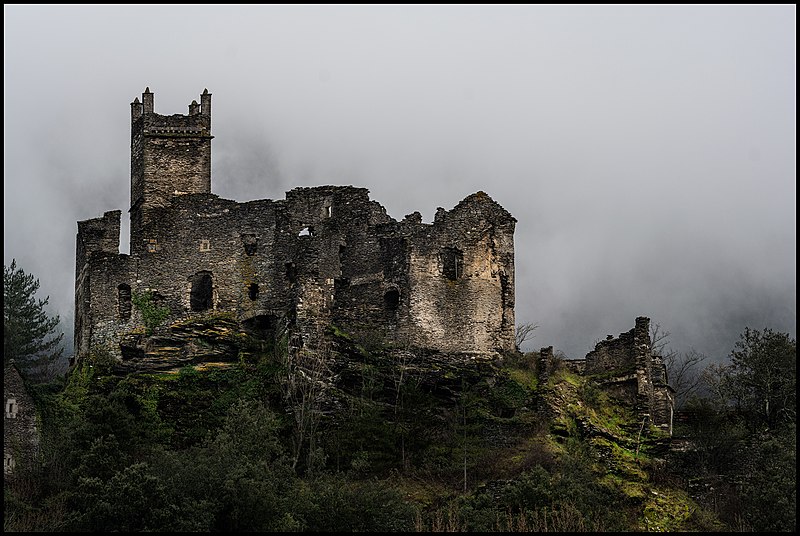 Le monument est implanté sur un rocher de schiste qui explique sa forme elliptique et sa faible superficie ; il est séparé de la montagne par un large fossé taillé dans le roc. Le donjon carré atteint 15 mètres de hauteur ; ses murs, épais d’environ 1,30 mètre, créent des salles de petite dimension (4,80 m sur 4,30 m). Voûtés à tous les étages, les niveaux conservent des trous de boulin témoignant d’anciens planchers en bois. L’accès principal se situe à l’ouest au pied du donjon ; une porte ouvre sur le premier étage et une autre, au second étage orientée au sud, présente un encadrement en granite indiquant une modification postérieure. Au XVIIe siècle, cet étage était résidentiel et comportait une loggia.