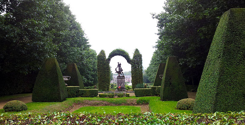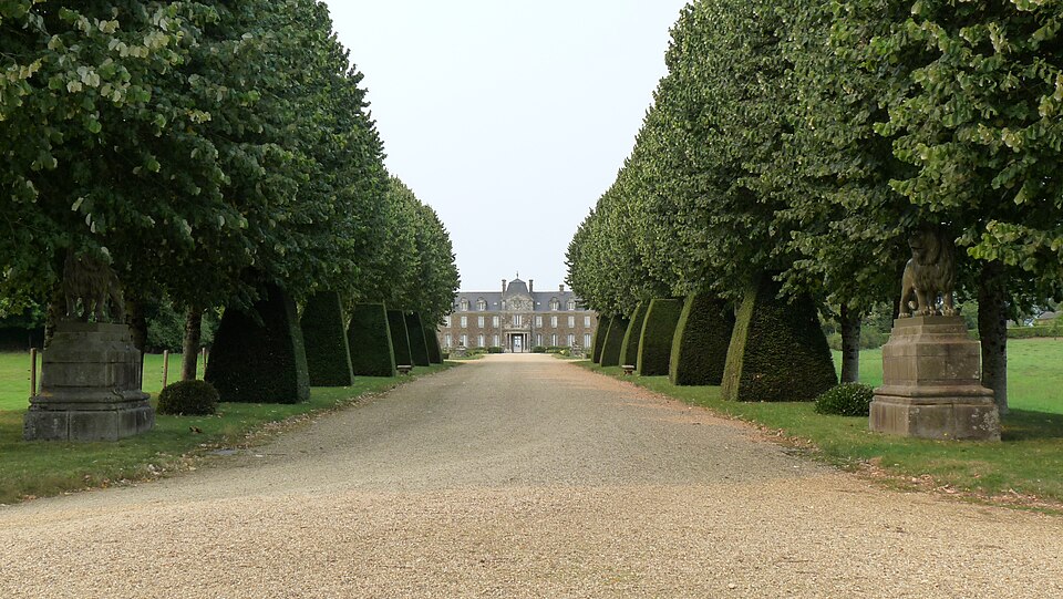 Face aux difficultés de franchissement d'une dénivellation de huit mètres entre la route et le château, Édouard André conçut une arrivée en hémicycle de 20 mètres de rayon centrée sur une conciergerie inspirée de Bagatelle et reliée par des balustrades de granit à deux grilles d'entrée venues du parc du puits artésien de Grenelle à Paris. L'allée d'arrivée descend par deux rampes en fer à cheval depuis une statue de Philémon sous une voûte de charmes, traverse des éléments décoratifs — lions en fonte sur stèles de granit, rangées d'ifs taillés, colonnes de granit surmontées de vases, rond-point à lampadaires — et s'encadre par des parterres à la française disposés de part et d'autre. Ces parterres sont délimités au sud par des douves en quart de cercle bordées de bornes de granit reliées par des chaînes et par des balustrades, et divisés en quatre compartiments séparés par une allée transversale; les petits compartiments accueillent un vase tandis que les grands, proches du château, présentent un bassin miroir de style Louis XIV.