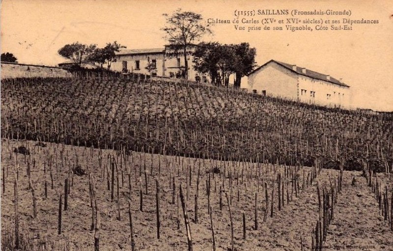 Le château de Carles se situe à Saillans (Gironde), le long de la route départementale D 18E1 au nord du bourg. Les témoignages et les vestiges témoignent de plusieurs campagnes de construction : certaines sources attribuent l'édifice au XVIe siècle, construit par la famille des Carles, tandis que d'autres évoquent un développement du site dès le début du XIVe siècle, marqué par des éléments défensifs médiévaux. L'ensemble présente un plan en L, avec un corps de logis principal et, à l'angle ouest, une aile. La structure semble résulter de deux phases distinctes : un corps de bâtiment accompagné d'une tour ronde, puis des adjonctions à l'est comprenant des mâchicoulis, une tour ronde nord-est et une tour-pavillon carrée à contreforts, couronnée d'un chemin de ronde crénelé. Sur la façade nord subsistent de grosses tours rondes percées de meurtrières, tandis que la façade sculptée est d'époque plus récente. À l'origine, le domaine comprenait une vaste cour entourée de communs, une chapelle, un pigeonnier, une glacière, des parterres et de grands arbres dessinant allées et quincunces ; ces dépendances ont été largement démolies après la Révolution. Le site a joué un rôle durant la guerre de Cent Ans et connut des épisodes militaires importants, mentionnés par les récits de l'époque. La famille des Carles, grande famille bordelaise, a laissé plusieurs personnages notables, dont des chanoines et magistrats ; Lancelot de Carles, évêque de Riez et poète familier de la Pléiade, y figure parmi les plus connus. Au XVIe siècle la demeure perdit progressivement sa fonction militaire et se fit une réputation intellectuelle et littéraire : le château a notamment accueilli Montaigne et La Boétie, et Marguerite de Carles, veuve d'Étienne de La Boétie, en hérita en 1567. Le domaine passa ensuite à d'autres familles, puis, au XVIIIe siècle, revint au comte de Saujon ; sa petite‑fille Marie‑Charlotte Hippolyte de Campet de Saujon, épouse du comte de Boufflers, y anima un cercle mondain et intellectuel réputé. À la Révolution le château et ses dépendances furent vendus comme biens nationaux et en grande partie rasés par le nouveau propriétaire, qui transforma l'essentiel en vignoble. À la fin du XIXe siècle, Guillaume Chastenet de Castaing racheta la propriété et entreprit des restaurations intérieures, décorant notamment deux pièces de carreaux de faïence provenant de maisons démolies en Tunisie et au Maroc, et aménagea la terrasse sud en y plantant des cyprès. Les travaux se sont poursuivis entre les deux guerres par Jacques Chastenet ; les générations suivantes ont concentré leurs efforts sur l'amélioration du vignoble et de la vinification. Le parc et le jardin complètent encore aujourd'hui le cadre du château, qui fait l’objet d’une inscription au titre des monuments historiques depuis le 18 décembre 1991.