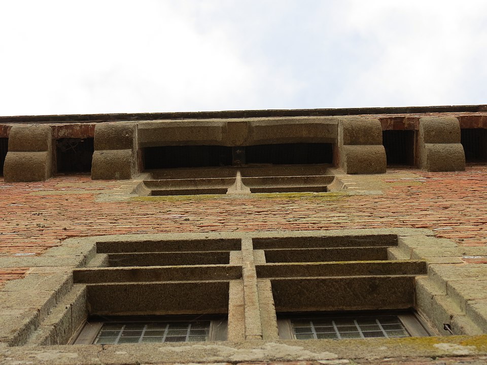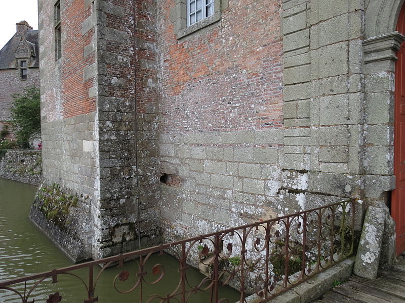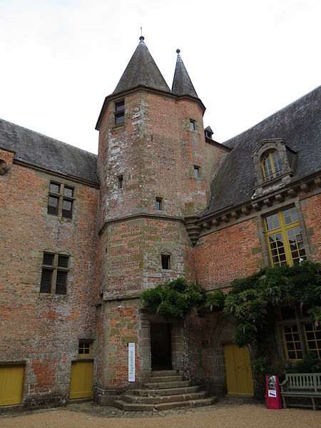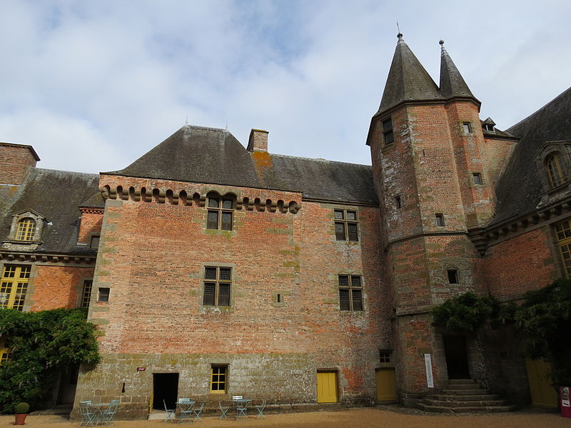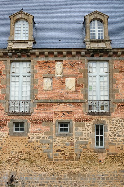 L’ensemble forme un quadrilatère irrégulier en briques, schiste et granit, flanqué de tours et ceint de fossés en eau. Le châtelet d’entrée, pavillon à deux étages cantonné de tourelles et exécuté en briques rouges et noires, illustre la transition entre le gothique et la Renaissance. Le donjon, corpulent et carré, conserve son couronnement de mâchicoulis sur corbeaux de granit et s’insère dans l’aile nord‑ouest du logis. Les façades unitaires des ailes du XVIe siècle reposent sur un vocabulaire sobre : bandeaux de granit, corniches à modillons, lucarnes identiques et décors de briques alternant tons roses et noirs. La brique, abondante sur place en raison des argiles locales, est mise en œuvre de façon décorative et structurante au château.