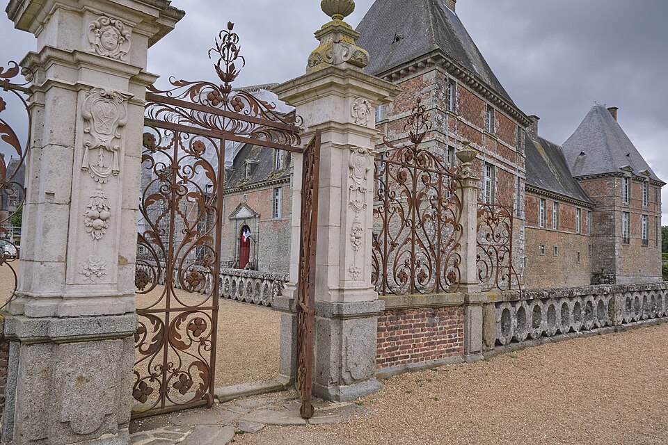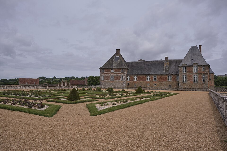 À l’intérieur, les communs occupent le rez‑de‑chaussée tandis que les pièces d’apparat se trouvent au premier étage. L’escalier d’honneur en briques, daté du XVIIe siècle, et l’escalier monumental construit à la fin du XVIe siècle desservent les appartements privés et publics. Parmi les salles remarquables figurent une antichambre ornée d’un plafond peint du XVIe siècle et d’une peinture de chasse sur la hotte, une chambre dite « Louis XI » présentant une cheminée du XVe siècle et des boiseries du XVIIe siècle, ainsi que plusieurs salons aux lambris et meubles des XVIIe‑XVIIIe siècles. La salle des fêtes, vaste salle longitudinale, occupe l’aile de la galerie et a été destinée à des représentations théâtrales ; la salle à manger, aménagée au XVIIIe siècle, conserve une cheminée mêlant marbre, granit et calcaire.