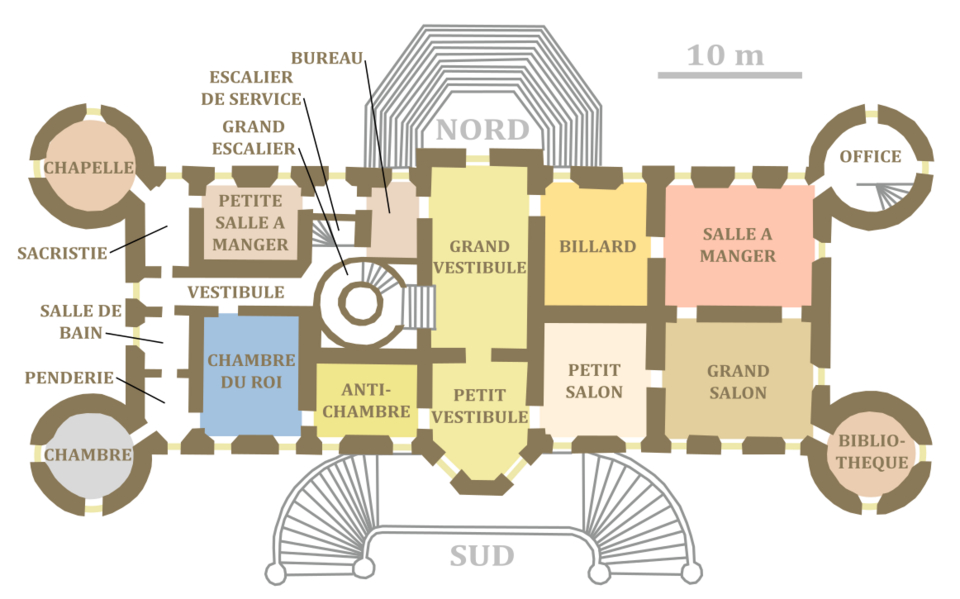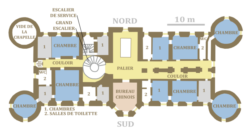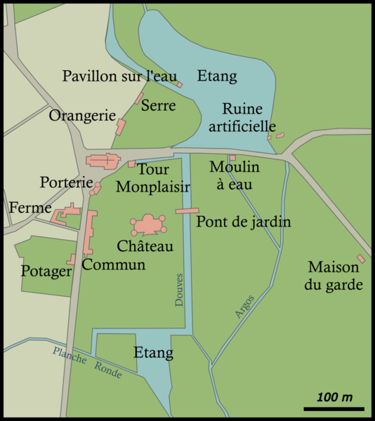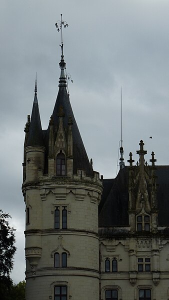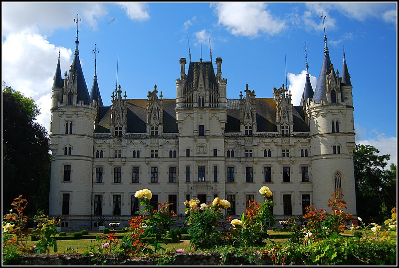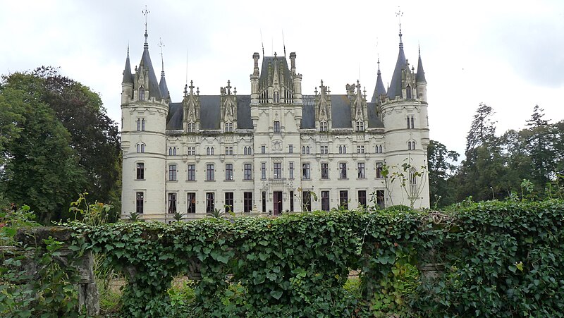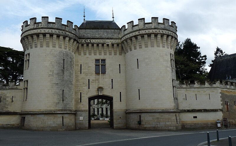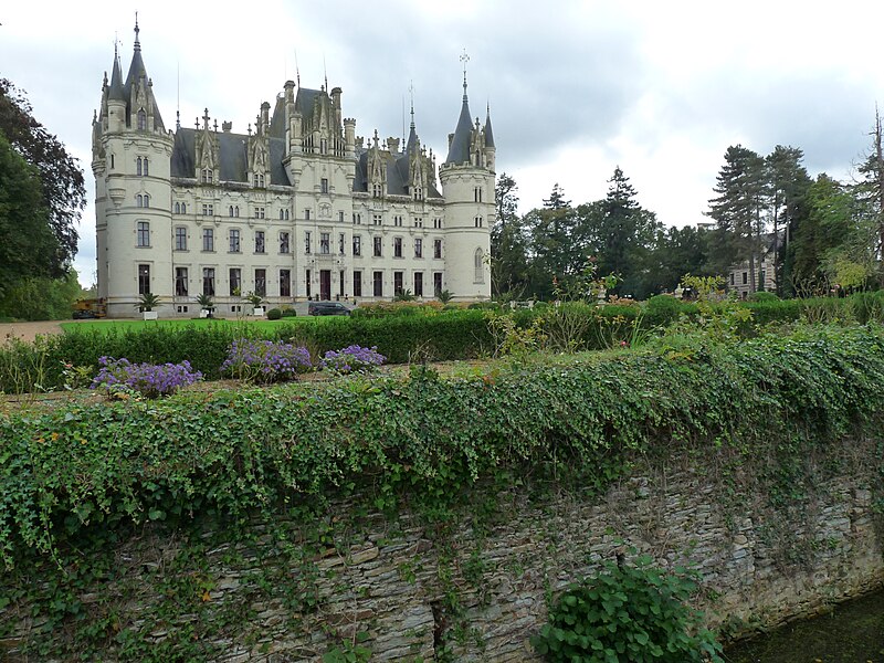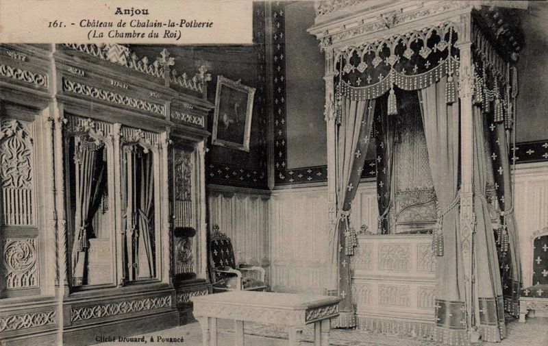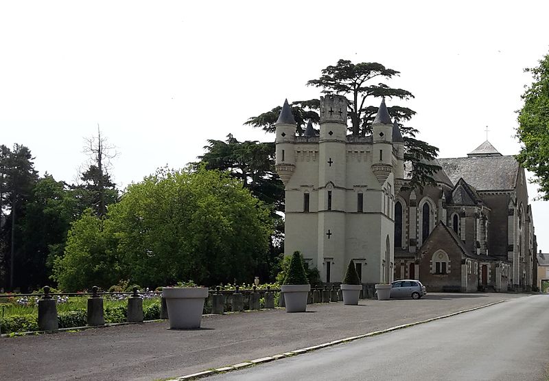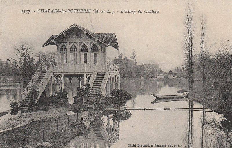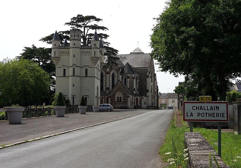 Le château de Challain-la-Potherie est un ensemble néo-gothique élevé entre 1847 et 1854 par l'architecte angevin René Hodé à partir de projets initialement sollicités auprès de Louis Visconti. Le domaine comprend le château lui‑même, les communs, l'orangerie, des serres, une porterie, la tour dite Monplaisir, des fabriques et des ruines artificielles dans le parc ; la fabrique et son embarcadère sur l'étang ont été démolis en 1979. Une forteresse existe à Challain probablement depuis le XIe siècle ; l'édifice actuel remplace une demeure médiévale conservée pendant la durée des travaux puis démolie. Commandé par Louise‑Ida Le Roy de La Potherie et son mari François Albert de La Rochefoucauld, comte de Bayers, le château relève d'un goût néo‑gothique de type troubadour et affiche la mémoire familiale tout en conservant une organisation intérieure classique. Visconti proposa un projet que Hodé reprit et agrandit ; le gros‑œuvre extérieur fut achevé en 1851 et les décors intérieurs en 1854. Après la mort du comte, la comtesse fit poursuivre les travaux et aménager le parc et les dépendances : communs (1859‑1860), pont de jardin (1862), orangerie et serres (1866), tour de Monplaisir (1875), porterie d'entrée (1882) et autres éléments décoratifs ou de loisirs. Le chantier mobilisa un grand nombre d'ouvriers et connut une brève interruption lors de la révolution de 1848. Le château a ensuite connu de multiples propriétaires ; il a servi de colonies de vacances pour la ville de Choisy‑le‑Roi, accueilli un club privé, été acquis par une société liée à l'Église de l'Unification, puis transformé en chambres d'hôtes haut de gamme par la famille Nicholson en 2002. L'édifice a fait l'objet de protections au titre des monuments historiques, avec des inscriptions partielles en 1979 et 1980, des protections étendues en 2004 et des classements complémentaires en 2019. Architectoniquement, le château présente un plan rectangulaire flanqué de tours d'angle et un donjon central ; il est bâti en tuffeau avec soubassements et perrons en granit, et ses façades largement sculptées, nombreuses travées et nombreuses fenêtres lui ont valu le surnom de « petit Chambord » ou « Chambord angevin ». L'ornementation extérieure associe lucarnes, fausses créneaux, tourelles et une profusion de culots sculptés par Jacques Granneau, qui représentent personnages, animaux et motifs variés. Challain illustre le style troubadour : le décor néo‑gothique est plaqué sur une structure symétrique et néoclassique, les façades et la distribution restant régies par des principes classiques tandis que les toitures et les ornements évoquent le Moyen Âge. L'intérieur comprend un sous‑sol technique, deux étages nobles, un étage en surcroît et des combles, soit six niveaux, et près de 120 pièces réparties sur des niveaux de grande surface. Le rez‑de‑chaussée surélevé réunit les pièces d'apparat autour d'un axe nord‑sud : vestibules, grand salon, salle à manger, billard, bibliothèque et chapelle, ornés de voûtes et de décors néo‑gothiques. Des aménagements techniques modernes pour l'époque figurent dans l'édifice : chauffage central, verrière zénithale éclairant l'escalier, parquets particuliers et mécanismes de portes innovants, intégrés à un décor historicisant. Les étages accueillent appartements privés et logements de domestiques ; face à la largeur importante du corps de logis, l'architecte résolut les problèmes de circulation et de structure par des piliers centraux et la multiplication de petites pièces. La décoration du rez‑de‑chaussée, réalisée par une équipe comprenant Jacques Granneau, le tapissier Didier et le fabricant Jean‑Paul Mazaroz, associe lambris sculptés, boiseries, papiers peints à motifs médiévaux et motifs héraldiques rappelant les La Rochefoucauld et les La Potherie. Le parc, aménagé dans l'esprit du jardin à l'anglaise sur environ trente hectares, joue sur la variété d'arbres et de bosquets, l'ouverture de perspectives et la présence de deux étangs, dont l'un provient d'une retenue médiévale liée à un moulin. Des fabriques ponctuaient les promenades — pont de jardin, tour Monplaisir qui servait aussi de château d'eau, fausse ruine gothique et pavillons —, certains éléments ayant été détruits ou modifiés au XXe siècle. Les dépendances comprennent un vaste commun construit en 1859‑1860 regroupant logements, écuries et remises, la ferme dite « Basse‑Cour », un potager restauré selon les plans d'origine et une orangerie reliée au domaine par un souterrain aujourd'hui condamné. Le château de Challain constitue l'œuvre la plus ambitieuse de René Hodé et a servi de modèle à d'autres réalisations locales, illustrant sa prédilection pour un gothique régional et décoratif plutôt que pour une reconstitution historisante stricte.