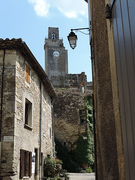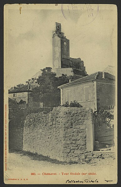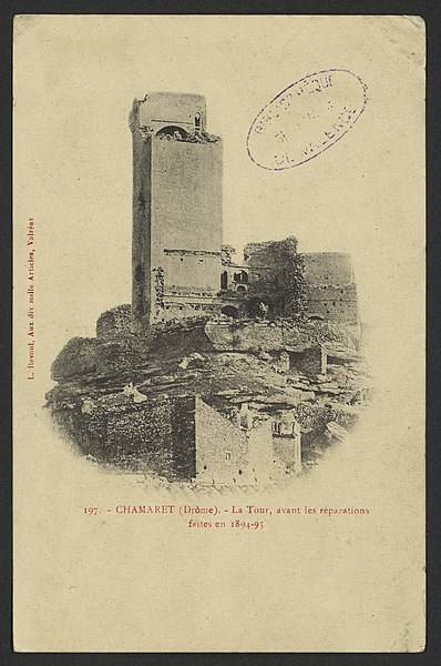 Le château de Chamaret, situé sur la commune de Chamaret dans la Drôme, est attesté dans le cartulaire de Richerenches en 1157 ; sa construction aurait commencé en 1136 sous Dodon Ier et s'achever en 1157 sous Dodon II. Le plateau des Puys est occupé dès la période romaine : des tombes antiques ont été découvertes lors de la restauration de la fin du XIXe siècle et des monnaies de l'époque d'Agrippa ont été mises au jour lors de sondages. Perché sur la rive gauche du Lez, le site, aménagé en éperon barré et séparé du plateau par un vaste fossé, se prêtait naturellement à l'édification d'une forteresse. La famille de Chamaret fit édifier la forteresse ; le partage de ses biens en 1254 entraîna l'extension du château et la construction d'un second logis, la tour sud aujourd'hui appelée « le Pigeonnier », attribuée à Amalric de Chamaret. À cette époque le site se trouva divisé en deux ensembles confrontés : l'aîné conserva la forteresse primitive, le cadet la nouvelle tour, et une muraille fut édifiée entre les deux tours. Pour rechercher protection, Amalric prêta hommage à l'évêque de Saint‑Paul‑Trois‑Châteaux tandis que son frère fut inféodé aux Adhémar en 1255 ; l'évêque et les Adhémar partagèrent alors la suzeraineté. Au XIIIe siècle, puis aux XIVe et XVe siècles, de nombreux différends opposèrent l'évêque et les Adhémar, l'évêque étant finalement évincé de la co‑seigneurie à la fin du XVe siècle ; la terre de Chamaret resta liée à la baronnie de Grignan jusqu'à la Révolution. Les Adhémar, seuls seigneurs au XVIe siècle, transformèrent le second logis en colombier. Les guerres de Religion firent changer plusieurs fois la forteresse de mains et, tout au long du XIXe siècle, le site servit de carrière de pierres aux habitants du village. Des effondrements et dommages successifs l'ont affecté : une partie des murs s'écroula en 1669 et la chapelle fut démantelée, la partie nord du château s'effondra en 1696 et le tremblement de terre de 1772 l'endommagea encore. Une restauration partielle de la tour et la consolidation des murs de soutènement furent réalisées en 1894‑1895 grâce au legs de Xavier Sylvestre ; la tour fut remise en état, réaménagée et une cloche y fut installée à la demande du légateur. Les travaux de 1895 firent également apparaître, sous la tour actuelle, des fondations plus anciennes interprétées comme les vestiges d'une specula romaine. Inscrit à l'inventaire supplémentaire des Monuments historiques en 1992, le site fit l'objet d'une opération d'archéologie préventive en 1995 et la municipalité fit restaurer la tour sud‑ouest, dite le Pigeonnier, par l'atelier valentinois Aries. Il subsiste des vestiges des deux enceintes de fortification, deux corps d'habitation — dont l'un jouxte le donjon — et une tour de plan carré renforcée d'un contrefort. La tour, haute de 30 mètres, offre un belpanorama sur la plaine de Valréas et les montagnes et son intérieur a été entièrement refait lors des restaurations. L'hypothèse la plus répandue la présente comme une tour à signaux : sa façade aveugle, dépourvue de meurtrières et d'ornement, la rendrait impropre à la fonction de donjon et compatible avec un usage de communications. La chapelle castrale, dédiée à Saint‑Barthélemy et située au sud‑est du donjon, comprenait une nef de deux travées terminée par une abside semi‑circulaire voûtée en cul‑de‑four. La tour dite « du Colombier » constitue la partie la mieux conservée du vieux manoir et peut se visiter.