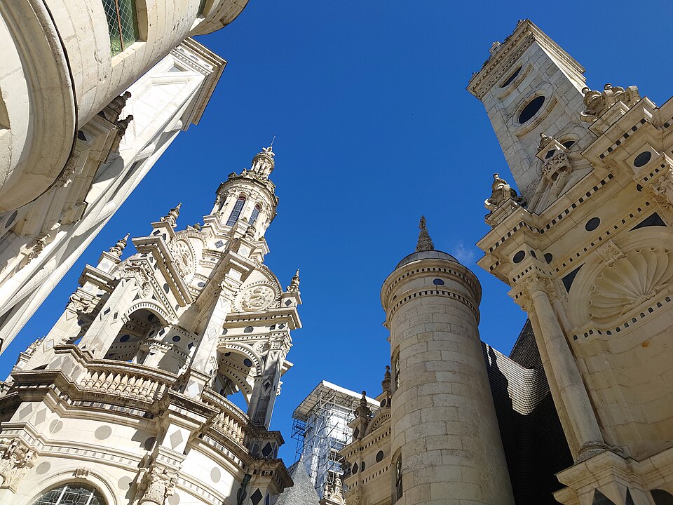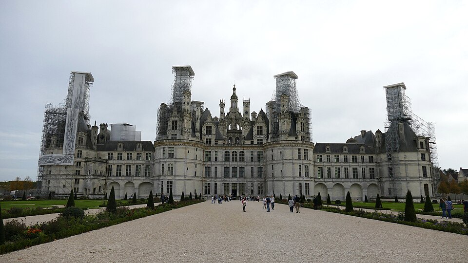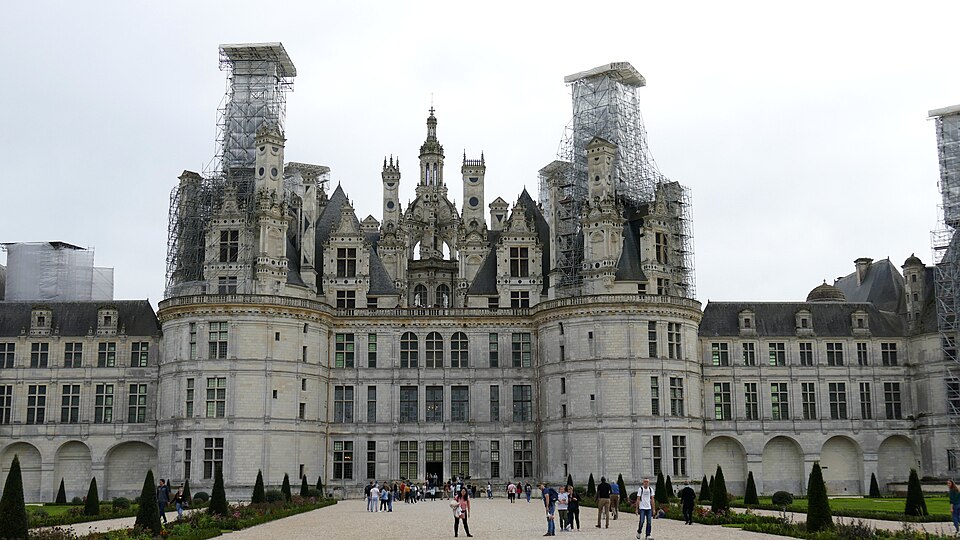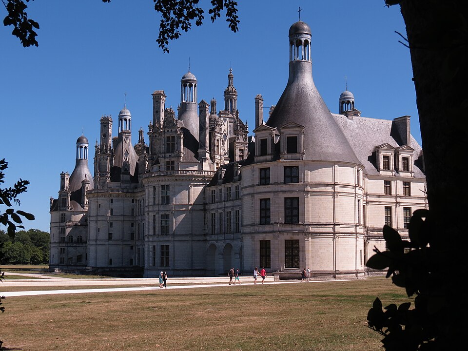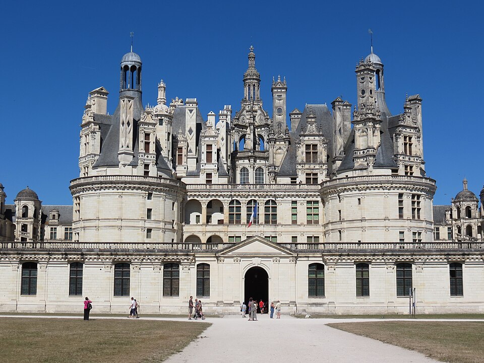 Le domaine de Chambord tient son origine de la décision de François Ier, prise à partir de 1519, de remplacer l’ancienne forteresse des comtes de Blois par un château destiné à la chasse. Les limites actuelles du domaine, fixées par Gaston d’Orléans, propriétaire de 1626 à 1660, en font le seul domaine royal conservé dans sa délimitation du XVIIe siècle. Le parc, clos par un mur de 32 kilomètres, couvre 5 433 hectares et comporte six entrées, ce qui en fait le plus vaste parc forestier clos d’Europe. Les travaux de construction se déroulent principalement entre 1519 et 1547, avec des interruptions, et plusieurs maîtres maçons se succèdent tandis que Pierre Nepveu assure une longue supervision du chantier. Le projet primitif prévoyait un donjon carré flanqué de quatre tours ; il évolue ensuite par l’adjonction de deux ailes et d’une enceinte. La paternité du plan initial reste incertaine, mais la participation probable de Léonard de Vinci et la collaboration de Dominique de Cortone sont souvent évoquées, notamment pour l’escalier à double révolution. Les étapes importantes mentionnées comprennent l’achèvement du donjon au milieu des années 1530, l’élévation des ailes et la construction de galeries, la mort de François Ier en 1547 interrompant les travaux. En décembre 1539, le château accueille l’empereur Charles Quint, moment marquant de la mise en valeur du chantier. Après des périodes d’abandon et des travaux de consolidation au XVIe siècle, Gaston d’Orléans entreprend des restaurations et des aménagements du parc au début du XVIIe siècle. Sous Louis XIV, Jules Hardouin‑Mansart intervient dans les années 1680 pour restaurer et achever des parties hautes, voûter la chapelle, établir des combles brisés et organiser l’esplanade et les communs. Le château sert ensuite de résidence intermittente et de demeure de gouverneurs ; il subit pillages et dégradations pendant la Révolution mais échappe à la destruction. Au XIXe siècle, le domaine est acquis en 1821 pour être offert au comte de Chambord, qui finance des campagnes de travaux, réorganise le parc et ouvre le château au public. L’État achète le domaine en 1930 ; au XXe siècle Chambord sert de refuge pour les œuvres des musées nationaux pendant la Seconde Guerre mondiale et fait l’objet de vastes campagnes de restauration après-guerre. Ces restaurations ont notamment reconstruit des combles, restauré la tour de la chapelle, le logis de François Ier et les offices, et repris des aménagements du parc comme le creusement du canal. Le domaine bénéficie de protections nationales et internationales : inscription au patrimoine mondial de l’UNESCO en 1981 et classement au sein de la vallée du Val de Loire et de réseaux de protection. L’architecture de Chambord mêle références médiévales — enceinte et grosses tours — et motifs de la Renaissance ; la silhouette du château, ses terrasses hérissées de cheminées et sa ornementation en font un chef-d’œuvre reconnu. Le plan centré du donjon repose sur une croix grecque organisée autour d’un escalier central à double révolution ; l’ensemble comprend cinq niveaux habitables, des appartements et une terrasse couronnée d’une tour-lanterne. Le bâtiment présente des dimensions et éléments remarquables : 156 mètres de façade, 56 mètres de hauteur, 426 pièces, 77 escaliers, 282 cheminées et environ 800 chapiteaux sculptés. La pierre principale utilisée, le tuffeau, nécessite des interventions régulières, et des carrières voisines fournissent des pierres de remplacement adaptées. Au XXIe siècle, des épisodes récents incluent l’inondation de 2016 liée à la crue du Cosson, la restitution des jardins à la française entre 2016 et 2017 rendue possible par un mécénat privé, et l’exposition commémorant les 500 ans du château en 2019. Le domaine accueille aujourd’hui expositions, spectacles et manifestations, reste l’un des monuments les plus visités de France et fait l’objet d’une gestion et d’un entretien continus pour préserver son caractère exceptionnel.