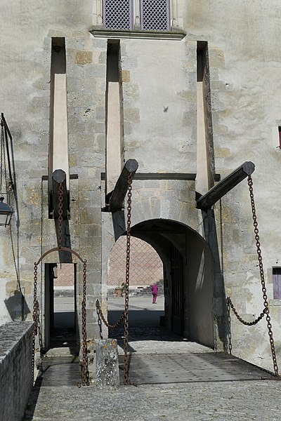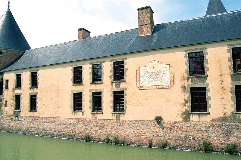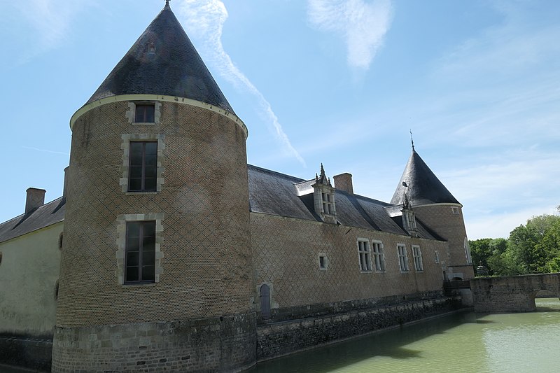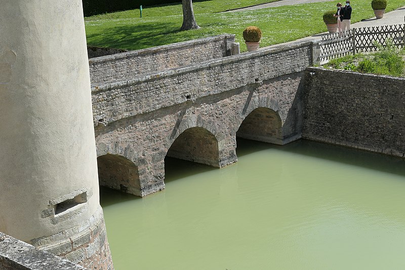 L'enceinte du château a la forme d'un trapèze entouré de fossés en eau ; une grosse tour cylindrique occupe chacun des angles. Trois côtés sont occupés par des bâtiments bas : à l'ouest le corps de logis principal avec deux ailes en retour d'équerre, les écuries et un appartement moderne, ainsi que les cuisines et services ; le quatrième côté est fermé par un pavillon d'entrée isolé des autres constructions. Le châtelet d'entrée, pavillon rectangulaire flanqué de deux tourelles — dont l'une abrite l'escalier — présente en rez‑de‑chaussée un passage voûté percé d'une porte charretière et d'une poterne, tandis que l'étage était consacré à de nombreuses chambres de domestiques. La tour flanquante gauche conserve un sous‑sol voûté en berceau annulaire reposant sur un pilier central en brique.