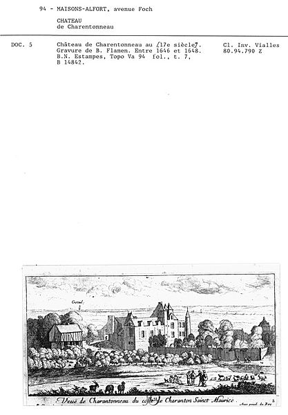 Le château de Charentonneau, dit aussi château Gaillard, se dressait à Charentonneau, commune de Maisons‑Alfort (Val‑de‑Marne). Son nom apparaît dès la fin du XIIe siècle sous la forme latinisée Carentoniolo. En 1281 le domaine, dépendant de l'abbé de Saint‑Maur, comprenait un logis, un moulin et des maisons. En 1377 Charles V acquiert une maison près du pont de Charenton appartenant à Nicolas Braque et l'offre au chancelier Philippe de Mézières ; cette demeure a été interprétée comme une maison de plaisance plutôt que comme le château. En 1444 le fief, avec un manoir proche du pont, est vendu par les Lormoy à Nicolas Duru, huissier au Parlement. Aux XVe et XVIe siècles la seigneurie passe entre diverses familles nobles, dont les Alligret, et comporte une chapelle dédiée à saint Jean. Au XVIIe siècle l'abbaye des Vaux‑de‑Cernay cède une part du domaine à Louis de Falcony, propriétaire également d'Alfort et d'une ferme à Maisons‑Ville. Une estampe d'Albert Flamen exécutée vers le milieu du XVIIe siècle représente le château et son domaine. En 1671 René Gaillard achète le domaine à Falcony; sa famille, prenant parfois le nom de Gaillard‑Charentonneau, en reste propriétaire jusqu'à la Révolution. Au XVIIIe siècle la seigneurie abrite une prévôté et le château est décrit par Jean‑Aymar Piganiol de La Force; les archives signalent aussi des procès et des dégradations du jardin. En 1789 le château est jugé « en mauvais état » lors des États‑Généraux; la propriété comprend jardins, bosquets, îles, un moulin neuf et une ferme. Pendant la Révolution le château est saisi et vendu comme bien national; à la fin du XVIIIe siècle les bâtiments ont été fortement remaniés. Sous le Consulat et l'Empire le domaine appartient successivement au maréchal Sérurier puis, en 1808, au baron Rodier‑Salièges. En 1833 le château et ses dépendances passent aux familles Pastré et Jouët‑Pastré, puis le domaine est progressivement morcelé et loti à partir de la fin du XIXe siècle. En 1897 les propriétaires fondent la Société civile du domaine de Charentonneau pour organiser la vente des parcelles. L'orangerie, dont il subsiste deux murs percés d'arcades en plein‑cintre ornées de mascarons, est inscrite à l'inventaire supplémentaire des monuments historiques en 1929. Le moulin du domaine, édifié sous Louis XV et élevé sur deux étages, fut endommagé par un incendie en 1883; il ne subsiste aujourd'hui que deux piliers qui enjambaient la Marne. Au XXe siècle le parc est morcelé pour être urbanisé; une partie accueille la Résidence du Château Gaillard et la chapelle Saint‑Gabriel, l'autre forme le quartier Charentonneau. Les bâtiments du château furent démantelés dans les années 1950; seules deux arcades de l'orangerie ont été conservées. Pendant l'hiver 1958‑1959 le domaine sert de décor au tournage du film Archimède le clochard, où le château et l'orangerie apparaissent encore entourés d'immeubles en construction. L'ensemble du domaine, compris entre voies et parcelles loties, appartient depuis 1956 aux copropriétaires des constructions qui l'ont remplacé. Sur le plan architectural, le corps de logis des XVIIe‑XVIIIe siècles était simple dans sa composition, bâti en pierre, brique et moellons, avec un avant‑corps, un balcon soutenu par deux colonnes, une petite tourelle et une toiture à longs pans. Une galerie intérieure ornée de peintures, de niches et de statues mythologiques complétait les enrichissements décoratifs; l'orangerie présentait des baies en arcs en plein‑cintre dont les clés étaient sculptées de mascarons. L'enceinte comprenait des fossés, une ferme, plusieurs dépendances et un pigeonnier circulaire coiffé d'un clocheton, le tout organisé autour d'une cour et d'un parc.