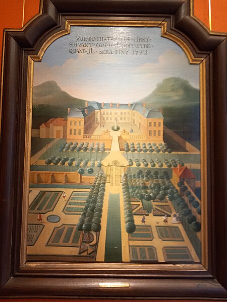 Le château de Cirey, situé à Cirey-sur-Blaise dans la Haute-Marne, témoigne d'aménagements et d'une vie se déployant sur trois siècles. Édifié au milieu du XVIIe siècle à l'emplacement d'un château féodal rasé en 1633, il présente un pavillon central flanqué de deux ailes. Lorsque Voltaire s'y installe, invité par la marquise Émilie du Châtelet, il le transforme : il fait ajouter une aile en 1734-1735 et fait réaliser une porte extérieure sculptée d'après un dessin de sa main, ornée de motifs marins et de deux faces de Neptune. Voltaire y aménage un théâtre privé sous les combles où les invités jouent ses pièces ; les travaux de restauration récents ont restitué le rideau peint en trompe-l'œil et les banquettes, faisant de cette petite salle un exemple rare de théâtre privé du XVIIIe siècle. Mme du Châtelet entreprend également des remaniements intérieurs et des transformations du jardin, modifiant ouvertures, cheminements et plantations. Au XIXe siècle, l'aile ajoutée par Voltaire est complétée par une aile en retour et une chapelle est décorée par le peintre Constant Ménissier pour la famille Damas. Sur l'emplacement des anciens communs du XVIIe siècle sont bâties une grande cave voûtée en anse de panier et une fruiterie. Autour d'une cour rectangulaire, les communs regroupent les écuries (1860), le poulailler, le pigeonnier, le grenier à bois, le bâtiment du fermier, la maison du berger, des granges et des étables. Le parc conserve des fabriques et aménagements du XIXe siècle, dont un pont métallique (1880) et un chalet décoré de bois découpé. La halle de l'ancien haut fourneau a été reconstruite en 1855, et le bâtiment du directeur de la forge illustre l'architecture rurale de la fin du XVIIIe siècle par ses moellons enduits et ses percements réguliers. Des pavillons d'entrée datent de 1915. Les parties du logis datant des XVIIe et XVIIIe siècles — le salon, la salle de billard, la salle à manger, le théâtre aménagé par Voltaire, le vestibule, l'escalier et les autres parties voûtées — ont été classées monument historique (21 septembre 1981 et 9 septembre 2002). La chapelle et l'aile du XIXe siècle ont été inscrites à l'Inventaire supplémentaire des monuments historiques le 21 septembre 1981. Les caves, la fruiterie, l'écurie et la sellerie, les bâtiments de la ferme (grange, poulailler, soues, pigeonnier, chenil, maisons du berger et du fermier), l'ensemble du parc et ses fabriques, la glacière, le lavoir et son bief, l'orangerie, le logis et la halle de l'ancienne forge ont été inscrits le 26 décembre 2001. Propriété privée, le château est ouvert à la visite par ses propriétaires et a servi de lieu de tournage pour l'émission Secrets d'Histoire consacrée à Voltaire, diffusée en juillet 2019.