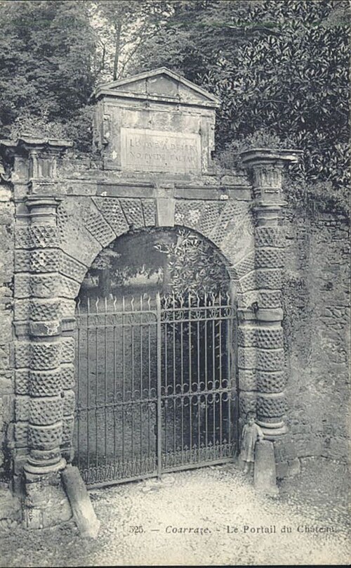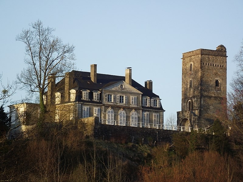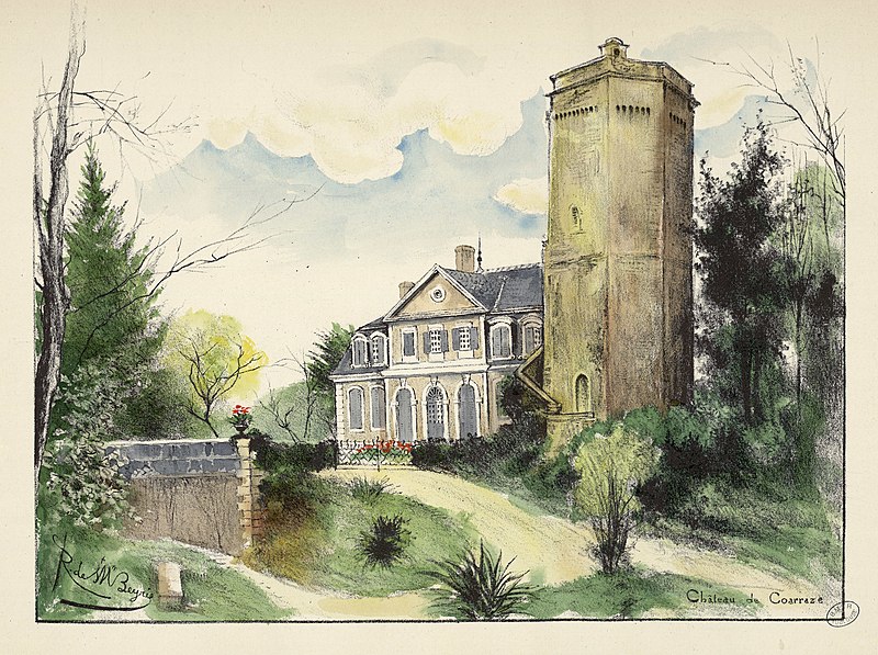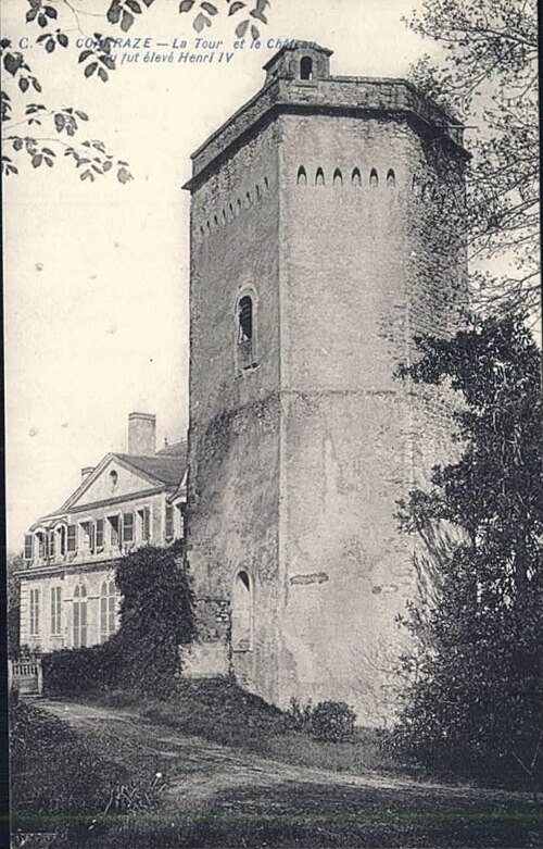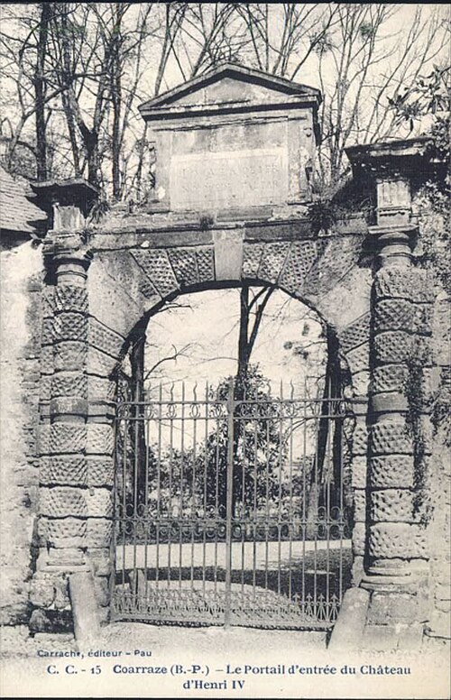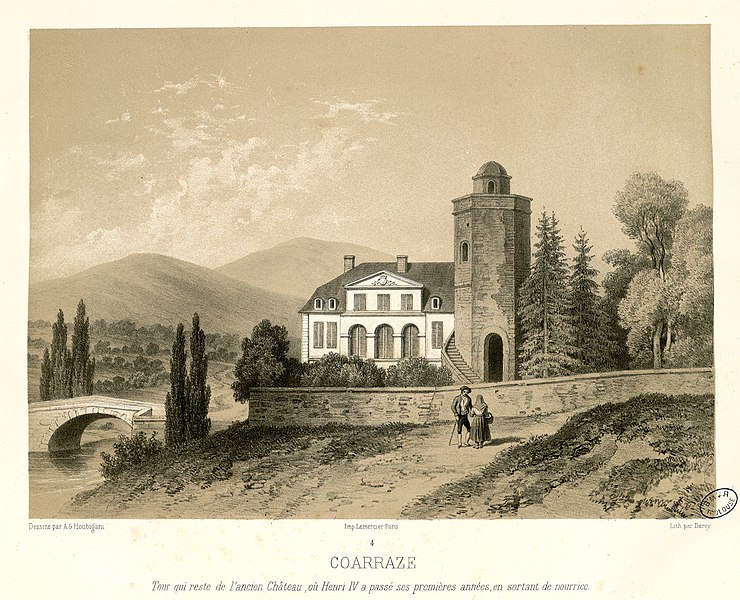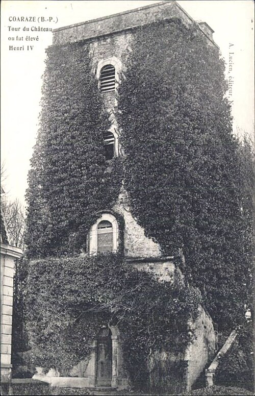La seigneurie de Coarraze, attestée dès le XIIe siècle, occupe une colline dominant le gave de Pau. Le site a successivement accueilli plusieurs châteaux ; le donjon du XIVe siècle en constitue le vestige le plus ancien encore visible. À la fin du XVe siècle, la terre passe à Gaston de Foix, comte de Carmaing ; ses exactions conduisent Jean d'Albret à faire raser le château au début du XVIe siècle, puis à en prendre possession. La famille d'Albret-Miossens reconstruit un nouvel édifice vers 1520, dans le style de la Renaissance. Le jeune Henri, futur Henri IV, passe une partie de sa petite enfance au château sous la garde de Suzanne de Bourbon, baronne de Miossens et de Coarraze, et y revient à plusieurs reprises. Le bâtiment est accidentellement incendié en 1684 et reste à l'abandon pendant plus de vingt ans. Jean de Montaut, conseiller au Parlement de Navarre, rebâtit l'édifice actuel en 1755. L'ensemble repose sur des sous-sols voûtés apparents au nord, offrant trois niveaux, et présente un avant-corps central en léger ressaut surmonté d'un fronton triangulaire. Une corniche marquée sépare le rez-de-chaussée de l'étage, au-dessus duquel s'ouvrent des combles mansardés ; la toiture a été refaite au XIXe siècle. À l'intérieur, un escalier monumental côté nord dessert les chambres supérieures, tandis qu'un salon côté sud, orné d'un rare papier peint chinois à motifs de branchages et d'oiseaux, constitue la pièce maîtresse. Le parc, organisé en terrasses, contient une ancienne glacière ; au nord se trouvent de grandes écuries voûtées d'arêtes surmontées de greniers à foin et, en contrebas vers l'entrée, les communs. Outre le donjon médiéval, le domaine conserve des vestiges du second château, dont le portail d'entrée monumental. Acquis par la famille de Dufau en 1863, le domaine reste une propriété privée appartenant à leurs descendants et s'ouvre au public lors de visites et de manifestations, notamment pendant les Journées du patrimoine. L'ensemble du domaine bâti et non bâti, le château avec ses dépendances ainsi que la partie organisée du domaine clos de murs, avec son portail et ses jardins, est inscrit au titre des monuments historiques par arrêté du 24 juin 2011.