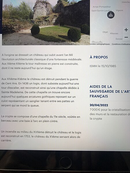 Le château de Comborn, perché sur un éperon rocheux dominant un méandre de la Vézère, est connu depuis le XIe siècle. Des substructions et des parties souterraines semblent remonter à cette époque, tandis que l'essentiel des vestiges appartient aux XIVe et XVe siècles. Le donjon, dont ne subsiste que le premier niveau, et la tour carrée datent du XIe siècle ; cette dernière a été réaménagée au XVe siècle et pourvue d'un escalier. Dans la boucle du mur d'enceinte subsistent les nervures d'une voûte de chapelle, et la crypte conserve une chapelle du XIe siècle voûtée en berceau avec une baie en arc en plein cintre. Des fouilles menées en 2002 ont montré que le site est occupé depuis l'Antiquité. Occupé dès le IXe siècle comme oppidum, il fut le berceau de la vicomté de Comborn et accueillit les vicomtes de Limoges aux XIIe et XIIIe siècles. Avant l'an mil, le château existait en bois ; la première construction en pierre, notamment la tour maîtresse à quatre niveaux, date du XIe siècle, dont seul le premier niveau subsiste. Trois salles souterraines datent du XIIe siècle. Le site a été endommagé pendant les XIIIe et XIVe siècles, dans le contexte de la guerre de Cent Ans. À partir de 1436, Jean Ier, vicomte de Comborn, fit reconstruire un logis important et une chapelle, cette dernière étant consacrée à sainte Madeleine en 1455 ; leurs vestiges sont encore visibles. La seigneurie passa ensuite par héritage aux familles de Pompadour, de Pierre-Buffière, puis, dès 1649, au marquis du Saillant. Le château a connu au moins un incendie ultérieur ; des remises en état de l'habitation datent du XVIIIe siècle (les dates 1735 et 1753 sont citées dans les sources), période durant laquelle certains éléments du XVe siècle furent réutilisés. Le logis reconstruit au XVIIIe siècle présente les caractéristiques d'une demeure noble rurale du Limousin, avec grands et petits appartements, fournil et pigeonnier, comme l'attestent différents inventaires. Le château a subi quelques pillages au XIXe siècle, sans autres constructions majeures depuis cette époque. Propriété privée, il a fait l'objet d'importants travaux de sauvegarde et de restauration entre 2020 et 2024. Le site a été retenu en 2019 pour un soutien financier du ministère de la Culture, de la Fondation du patrimoine et de la mission Stéphane Bern, et a reçu en 2022 des aides destinées à la restauration de mobilier et à la sauvegarde de la chapelle. Le château de Comborn est partiellement inscrit au titre des monuments historiques par arrêté du 15 octobre 1985 : sont inscrits les vestiges médiévaux (donjon, tour carrée, chapelle et crypte, salles souterraines, muraille d'enceinte) ainsi que les façades et toitures du corps de logis du XVIIIe siècle. Pendant une vingtaine d'années, jusqu'en 2024, le site a accueilli diverses animations culturelles — contes et légendes, conférences, visites guidées, spectacles et concerts. Parmi les personnages associés au château figurent Honoré-Gabriel Riqueti, comte de Mirabeau, qui y séjournait lors de visites à sa sœur la marquise du Saillant ; Jean-Baptiste Sirey, entré en possession du lieu par mariage en 1800 et dont la famille conserva le château jusqu'en 2000 ; et le peintre Philippe-Auguste Jeanron, mort au château, dont la famille est inhumée à Orgnac.
