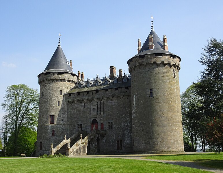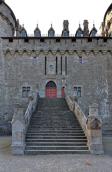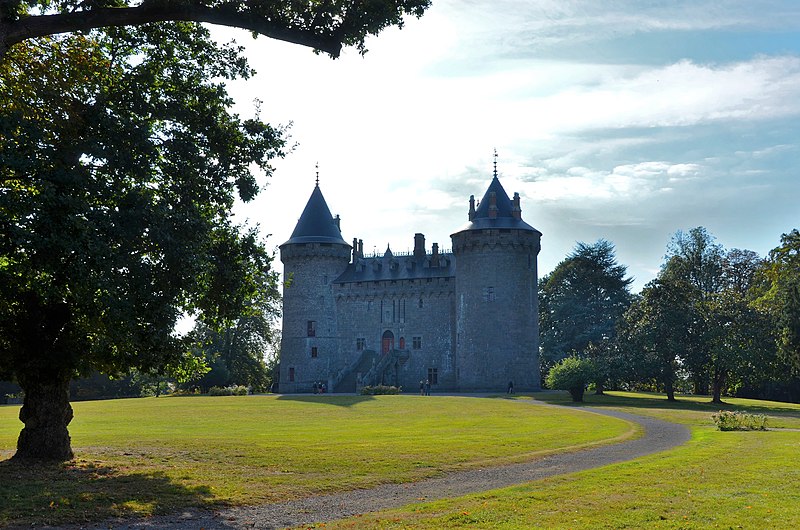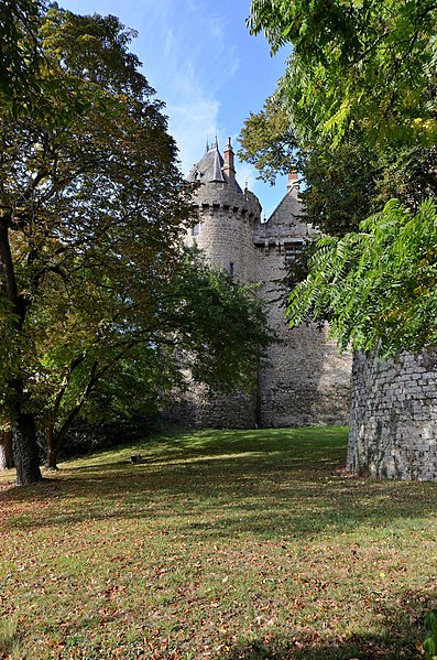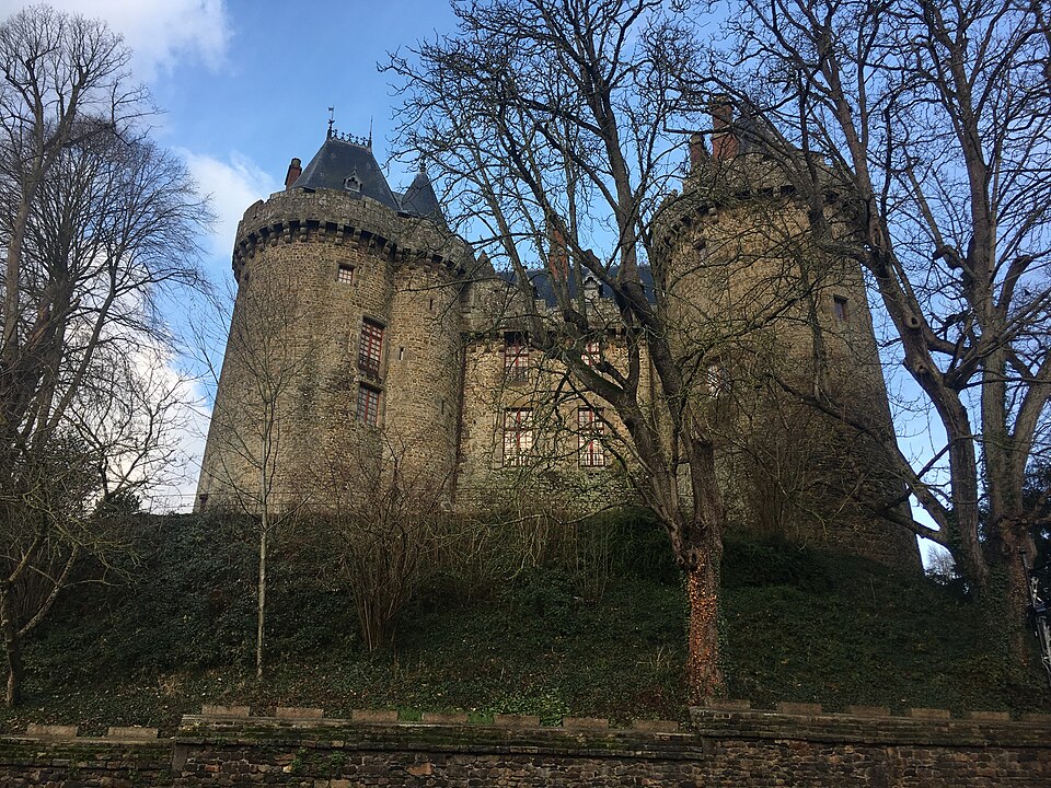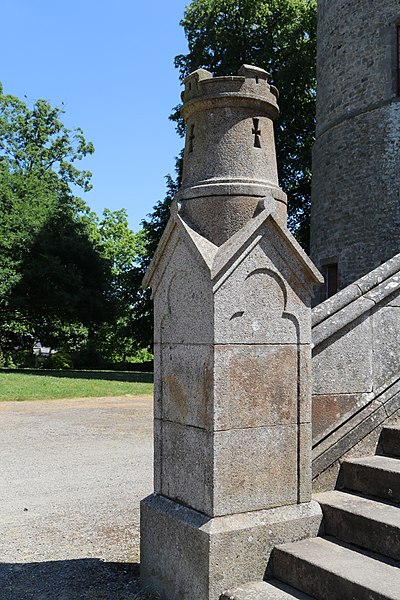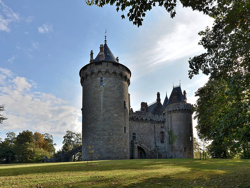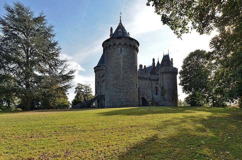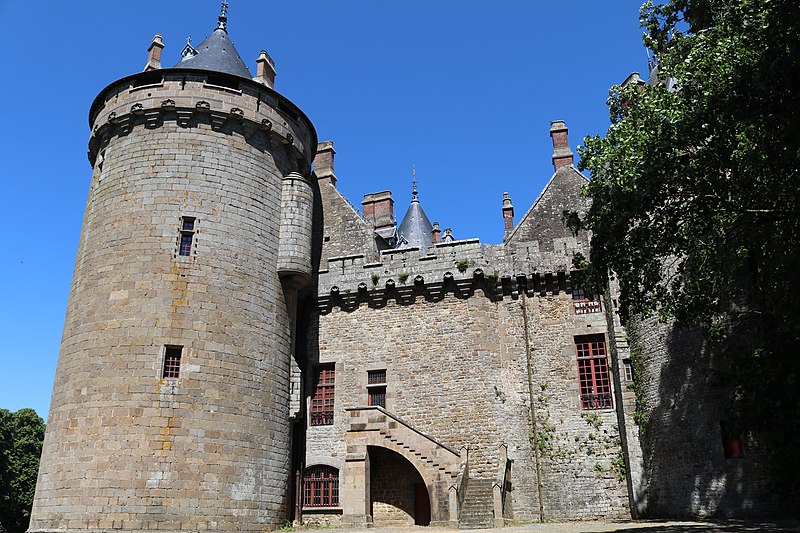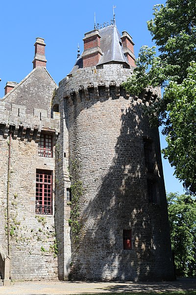 Le château de Combourg est une forteresse située à Combourg, en Ille‑et‑Vilaine, dominant un étang que François‑René de Chateaubriand qualifia de « Lac Tranquille ». Classé partiellement au titre des monuments historiques (façades et toitures, salle des gardes et vestibule depuis août 1966) et inscrit dans son ensemble depuis décembre 1926, il occupe un escarpement au nord‑ouest de l'étang, à mi‑distance de Rennes et de Saint‑Malo. Les origines du site remontent au début du XIe siècle : l'archevêque de Dol Guiguené fit édifier un premier château pour son frère Rivallon, premier seigneur de Combourg. Au fil des siècles la seigneurie passa entre diverses familles et la majeure partie des bâtiments actuelle date des XIVe et XVe siècles, la tour dite du Croisé ou donjon étant pour sa part datée de la première moitié du XIIIe siècle. Le corps de logis forme un quadrilatère de puissants bâtiments en granite appareillé, munis de créneaux et de mâchicoulis, et cantonné à ses angles de tours rondes à toitures coniques ; une cour rectangulaire s'ouvre au centre. Les mâchicoulis de la courtine nord et de la tour nord‑ouest présentent des encorbellements à quatre ressauts, ceux de la tour nord‑est en ont trois et supportent des linteaux ornés de trilobes simulés inscrits dans des arcatures brisées. L'intérieur a été largement réaménagé au XIXe siècle : la grande salle des gardes a été transformée en salons, une chapelle subsiste à l'entrée du vestibule d'honneur et un escalier monumental en bois a été créé lors des travaux. Après une longue période d'abandon et des dommages subis pendant la Révolution, la famille de Chateaubriand acquit le château en 1761 ; René‑Auguste de Chateaubriand y établit sa famille et son fils François‑René y passa une partie de sa jeunesse. Confisqué et pillé à la fin du XVIIIe siècle puis restitué en 1796 à Louis Geoffroy, le domaine demeura en quasi‑désert pendant près d'un siècle avant d'être restauré dans la seconde moitié du XIXe siècle par Geoffroy de Chateaubriand. Geoffroy confia les opérations à l'architecte Ernest Trihle, élève de Viollet‑le‑Duc, qui transforma l'édifice dans un esprit troubadour, fit créer un grand escalier et confia l'aménagement du parc aux frères Bühler. Ces interventions modifièrent certaines dispositions anciennes, remplacèrent la chapelle de la tour dite du Maure, la salle des gardes et la cour intérieure par des pièces de réception et une cour ornée de pierre blanche de style Renaissance. Malgré la disparition du fossé et du pont‑levis au profit d'un grand perron au nord, la disposition générale des bâtiments conserve l'organisation du XVe siècle, avec un plan polygonal cantonné de quatre tours. Le domaine est resté dans la famille par descendance et appartient aujourd'hui à des membres de la branche de La Tour du Pin Verclause. Le château fut utilisé comme hôpital militaire au cours de la Première Guerre mondiale, transformant des salons et la chapelle en salles pour blessés, comme l'atteste un témoignage de 1915. Les visiteurs illustres et les écrivains ont contribué à la renommée du lieu : Chateaubriand y a laissé des récits et souvenirs, et De Gaulle le visita en 1949. Le site et son parc présentent de nombreux éléments remarquables — blason des Chateaubriand, tours (Tour Sybil, Tour du Croisé, Tour du Maure), girouette, lac, calèches et arbres d'alignement — et conservent des objets et vestiges exposés sur place. Une découverte effectuée lors des restaurations, un chat momifié emmuré au XVIe siècle, est visible sous vitrine dans la chambre où Chateaubriand a séjourné enfant et a alimenté la légende locale du « chat fantôme ». Chateaubriand rapporte aussi des récits de fantômes et décrit la « chambre rouge », tandis que la tradition évoque la présence d'un seigneur à jambe de bois associé aux escaliers du château. Le monument a servi de décor pour le cinéma et la télévision, notamment pour Combourg, visage de pierre (1948), Culture drone, le château de Combourg (2013) et le téléfilm Sur la dalle (2024). Des études et inventaires patrimoniaux documentent l'histoire et l'architecture du site.