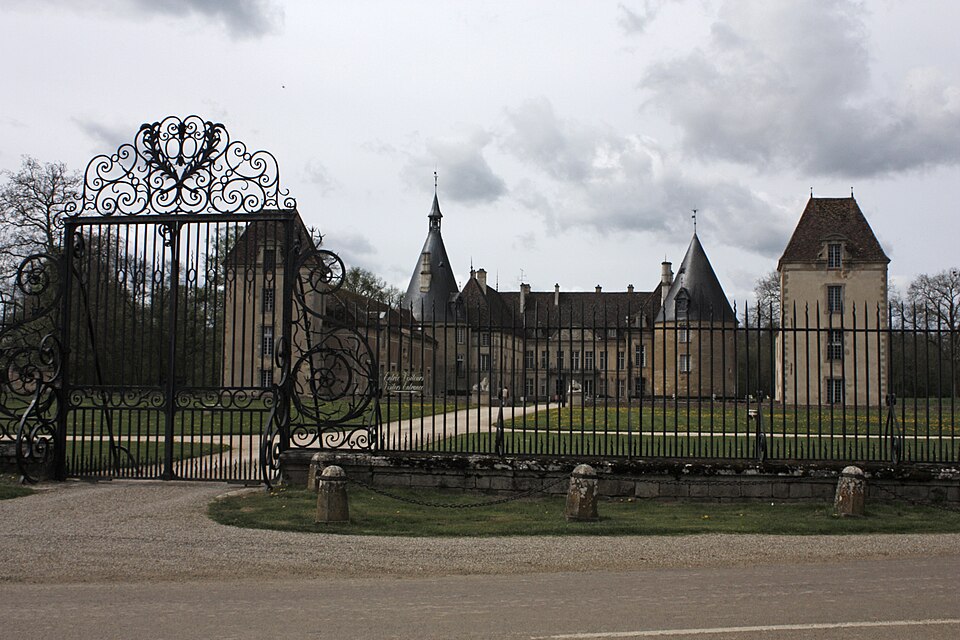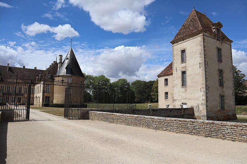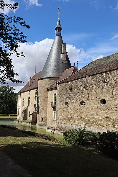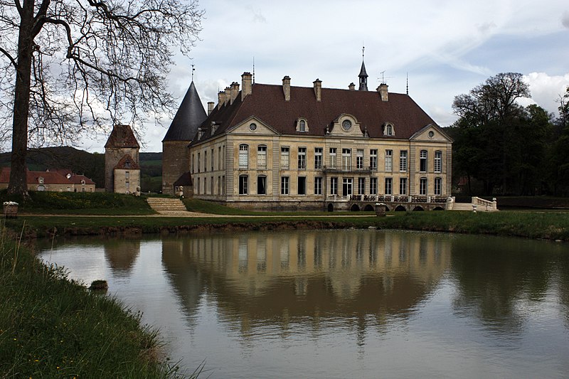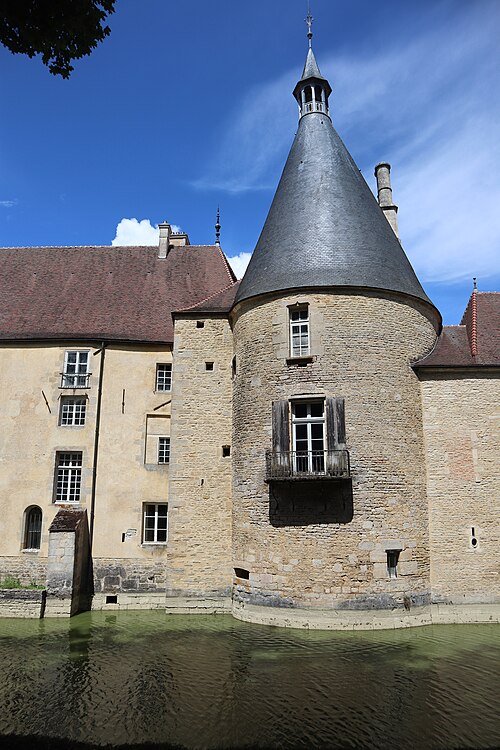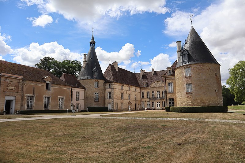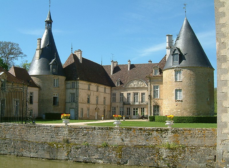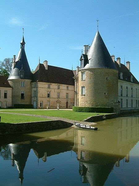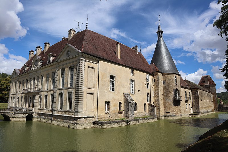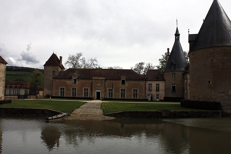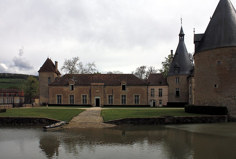 Le château de Commarin se situe sur la commune de Commarin, près de Châteauneuf, en Côte-d'Or (Bourgogne-Franche-Comté), à 40 km à l'ouest de Dijon. Il est classé au titre des monuments historiques depuis le 21 septembre 1949. À l'emplacement d'une ancienne villa romaine, une maison forte existe dès le XIIe siècle; le château du XIVe siècle a laissé les douves et deux tours rondes. Jacques de Cortiambles, chambellan de Philippe le Hardi, transforme au début du XVe siècle la fortification en une enceinte carrée cantonnée de tours rondes, entourée de douves et précédée d'une basse-cour; de cette époque subsistent deux tours rondes et une chapelle voûtée d'ogives. Au XVIe siècle, la chapelle reçoit des décorations et un triptyque pour Girard de Vienne, et une série de tapisseries héraldiques et alchimiques est installée. Au début du XVIIe siècle, Charles Ier de Vienne rebâtit l'aile est, abat l'aile nord et fait ériger en 1622–1623 une grande écurie et deux pavillons aux angles de la basse-cour; le portail d'accès de cette basse-cour est transféré au XIXe siècle à l'entrée des communs. De 1702 à 1713, l'architecte dijonnais Philippe Paris reconstruit le corps principal et l'aile ouest après l'effondrement d'une tour d'angle sud; les tours du côté sud sont détruites et les enceintes fortifiées supprimées. En 1717, Charles II de Vienne et Anne de Chastellux comblent le fossé entre le logis et la basse-cour et font édifier un petit pavillon entre la tour nord-est et l'écurie. L'écurie est reconstruite en 1744 par l'entrepreneur Edme Nicolas Machureau pour Marie-Judith de Vienne, qui entreprend ensuite des travaux d'entretien et de décoration intérieure. Au XIXe siècle, le jardin régulier cède la place à un parc à l'anglaise, la chapelle est restaurée entre 1851 et 1854, et le décor intérieur est modifié dans les années 1850–1860 par des artisans parisiens sur les plans de l'architecte Dusillon, qui rebâtit également l'écurie. Le château a donc été reconstruit aux XVIIe et XVIIIe siècles tout en conservant des éléments des XIVe et XVe siècles. Le bâtiment présente une ordonnance régulière d'inspiration classique : un corps de logis central au fronton richement décoré est flanqué de deux ailes — dite Louis XIII à l'est et Louis XIV à l'ouest — chacune terminée par une grosse tour ronde du XIVe siècle. Une écurie prolonge l'aile est et l'ensemble est ceint de larges douves prolongées de deux pièces d'eau. Le domaine comprend un parc à l'anglaise de cinq hectares, de beaux communs et de larges perspectives. L'intérieur se distingue par un mobilier et des décors des XVIIe et XVIIIe siècles qui témoignent des familles qui ont habité le lieu, et la collection de tapisseries héraldiques et alchimiques du XVIe siècle y est particulièrement remarquable. L'iconographie extérieure comporte un écu aux armes des Vienne et des Fauche de Domprel surmontant la porte de l'aile est, un haut-relief de cheval, un aigle héraldiquement associé à la famille de Vienne, des niches à bustes à l'antique dans l'escalier et une licorne en ronde-bosse près de la porte d'entrée. La porte cochère, en plein cintre, s'inscrit entre deux travées de colonnes encadrant une niche concave; ces colonnes portent un fronton triangulaire interrompu par un édicule à fronton cintré surmonté de l'aigle des Vienne, et la devise familiale "Tout bien à Vienne" est gravée sur la frise de l'entablement. Le château a appartenu successivement aux familles de Cortiambles, Jaucourt de Dinteville, Vienne, Damas d'Antigny puis Vogüé; il a échappé aux guerres et aux pillages de la Révolution et n'a jamais été vendu. Pierre de Commarin, dernier héritier direct de la lignée originelle, mourut en 1346 sans héritier; le domaine passa ensuite à Jean Ier de Cortiambles, puis par alliances successives aux familles citées. Le château conserve ainsi, dans son architecture et ses collections, la mémoire des familles qui l'ont façonné au fil des siècles.