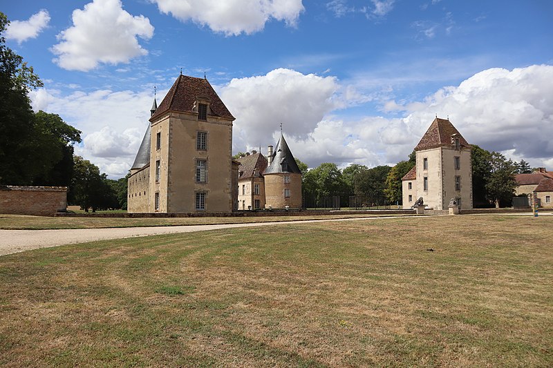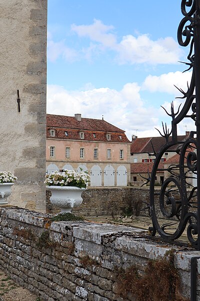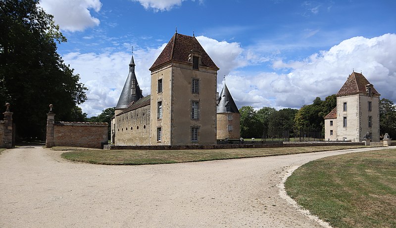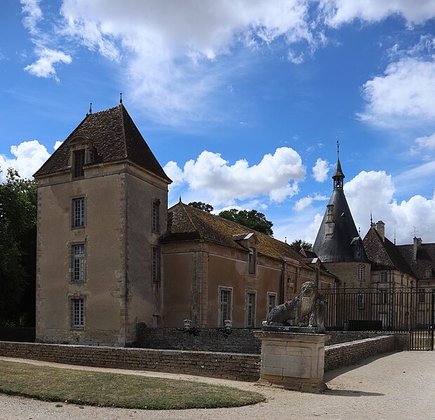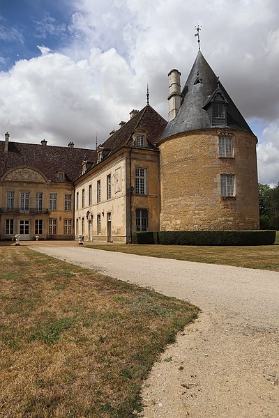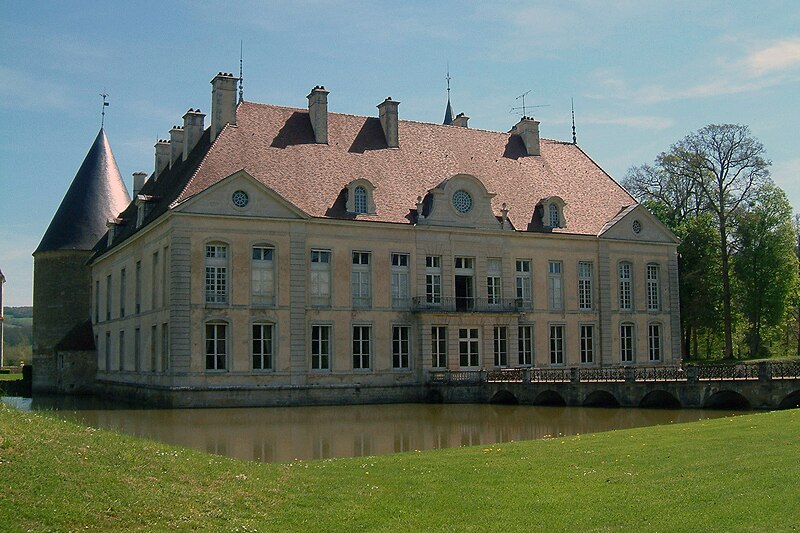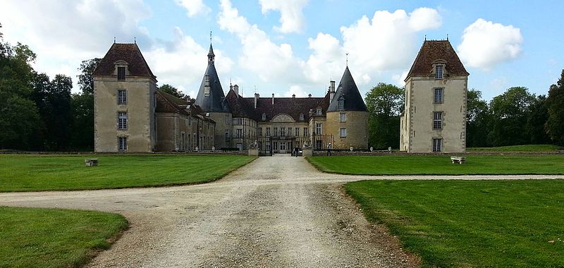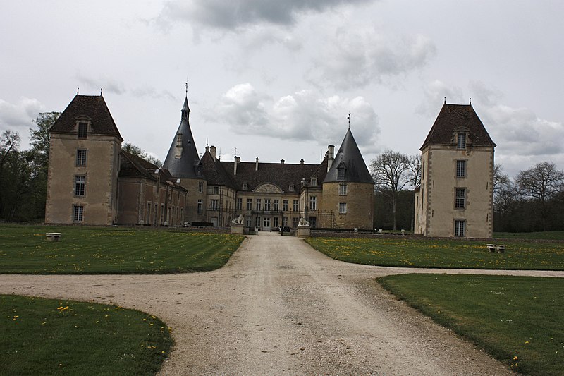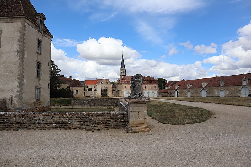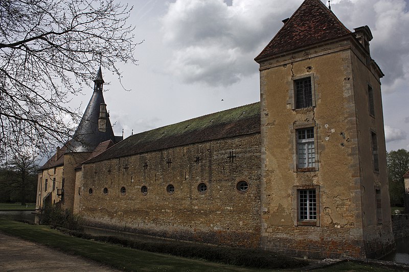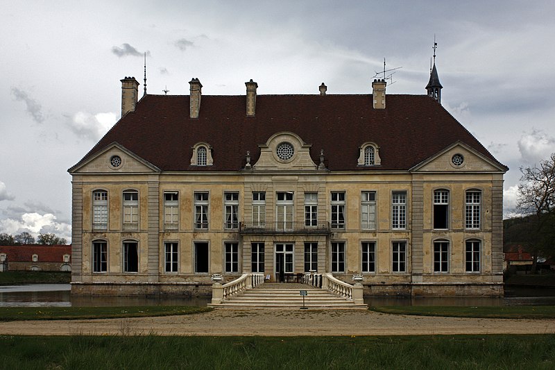 Le château de Commarin se situe sur la commune de Commarin, près de Châteauneuf, en Côte-d'Or (Bourgogne-Franche-Comté), à 40 km à l'ouest de Dijon. Il est classé au titre des monuments historiques depuis le 21 septembre 1949. À l'emplacement d'une ancienne villa romaine, une maison forte existe dès le XIIe siècle; le château du XIVe siècle a laissé les douves et deux tours rondes. Jacques de Cortiambles, chambellan de Philippe le Hardi, transforme au début du XVe siècle la fortification en une enceinte carrée cantonnée de tours rondes, entourée de douves et précédée d'une basse-cour; de cette époque subsistent deux tours rondes et une chapelle voûtée d'ogives. Au XVIe siècle, la chapelle reçoit des décorations et un triptyque pour Girard de Vienne, et une série de tapisseries héraldiques et alchimiques est installée. Au début du XVIIe siècle, Charles Ier de Vienne rebâtit l'aile est, abat l'aile nord et fait ériger en 1622–1623 une grande écurie et deux pavillons aux angles de la basse-cour; le portail d'accès de cette basse-cour est transféré au XIXe siècle à l'entrée des communs. De 1702 à 1713, l'architecte dijonnais Philippe Paris reconstruit le corps principal et l'aile ouest après l'effondrement d'une tour d'angle sud; les tours du côté sud sont détruites et les enceintes fortifiées supprimées. En 1717, Charles II de Vienne et Anne de Chastellux comblent le fossé entre le logis et la basse-cour et font édifier un petit pavillon entre la tour nord-est et l'écurie. L'écurie est reconstruite en 1744 par l'entrepreneur Edme Nicolas Machureau pour Marie-Judith de Vienne, qui entreprend ensuite des travaux d'entretien et de décoration intérieure. Au XIXe siècle, le jardin régulier cède la place à un parc à l'anglaise, la chapelle est restaurée entre 1851 et 1854, et le décor intérieur est modifié dans les années 1850–1860 par des artisans parisiens sur les plans de l'architecte Dusillon, qui rebâtit également l'écurie. Le château a donc été reconstruit aux XVIIe et XVIIIe siècles tout en conservant des éléments des XIVe et XVe siècles. Le bâtiment présente une ordonnance régulière d'inspiration classique : un corps de logis central au fronton richement décoré est flanqué de deux ailes — dite Louis XIII à l'est et Louis XIV à l'ouest — chacune terminée par une grosse tour ronde du XIVe siècle. Une écurie prolonge l'aile est et l'ensemble est ceint de larges douves prolongées de deux pièces d'eau. Le domaine comprend un parc à l'anglaise de cinq hectares, de beaux communs et de larges perspectives. L'intérieur se distingue par un mobilier et des décors des XVIIe et XVIIIe siècles qui témoignent des familles qui ont habité le lieu, et la collection de tapisseries héraldiques et alchimiques du XVIe siècle y est particulièrement remarquable. L'iconographie extérieure comporte un écu aux armes des Vienne et des Fauche de Domprel surmontant la porte de l'aile est, un haut-relief de cheval, un aigle héraldiquement associé à la famille de Vienne, des niches à bustes à l'antique dans l'escalier et une licorne en ronde-bosse près de la porte d'entrée. La porte cochère, en plein cintre, s'inscrit entre deux travées de colonnes encadrant une niche concave; ces colonnes portent un fronton triangulaire interrompu par un édicule à fronton cintré surmonté de l'aigle des Vienne, et la devise familiale "Tout bien à Vienne" est gravée sur la frise de l'entablement. Le château a appartenu successivement aux familles de Cortiambles, Jaucourt de Dinteville, Vienne, Damas d'Antigny puis Vogüé; il a échappé aux guerres et aux pillages de la Révolution et n'a jamais été vendu. Pierre de Commarin, dernier héritier direct de la lignée originelle, mourut en 1346 sans héritier; le domaine passa ensuite à Jean Ier de Cortiambles, puis par alliances successives aux familles citées. Le château conserve ainsi, dans son architecture et ses collections, la mémoire des familles qui l'ont façonné au fil des siècles.