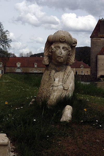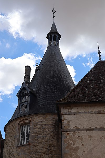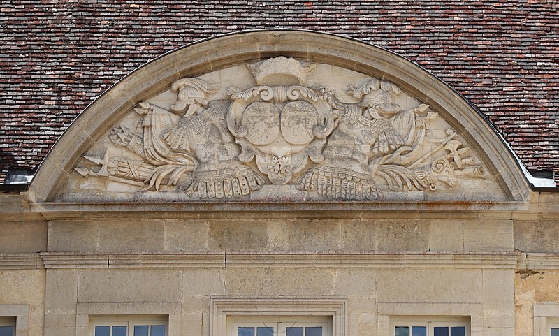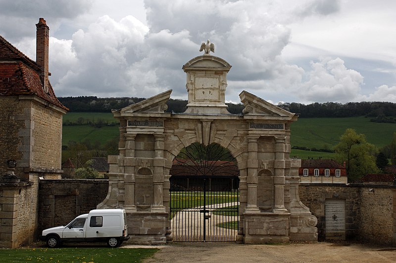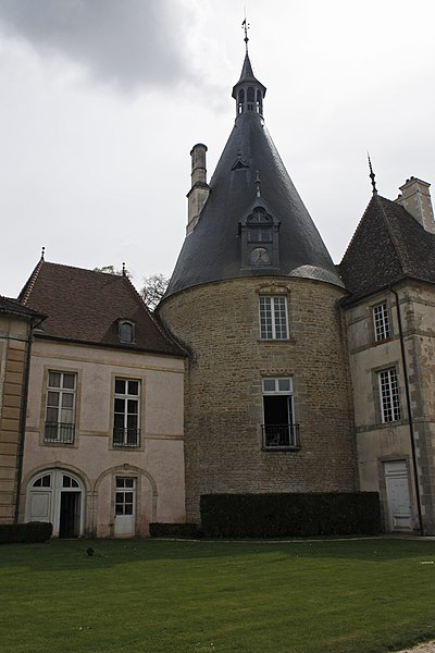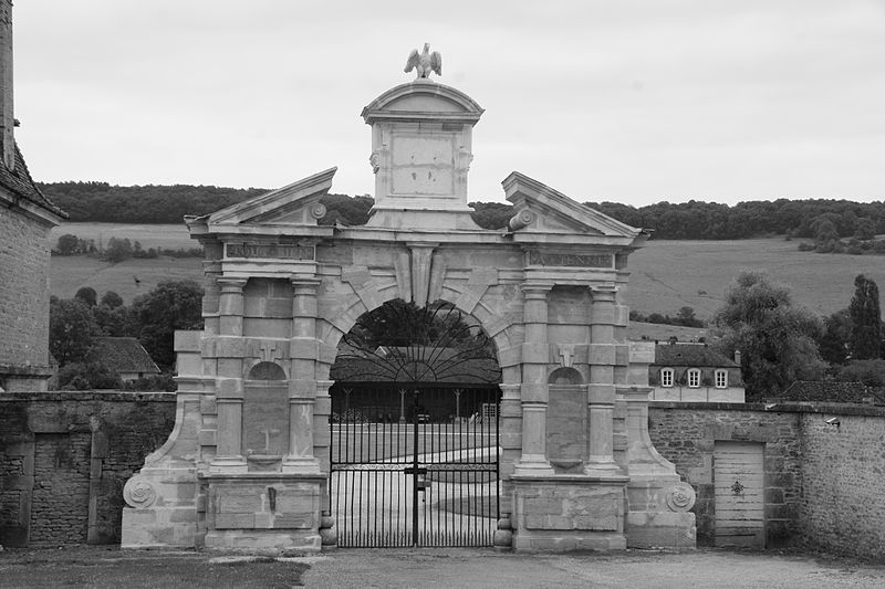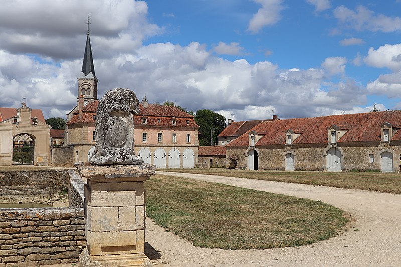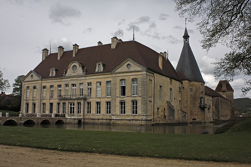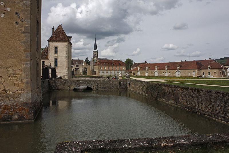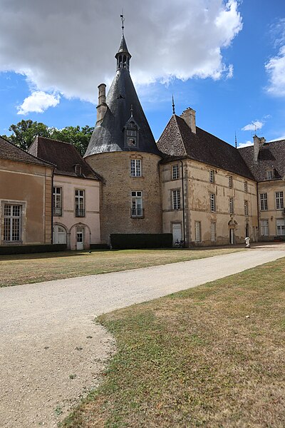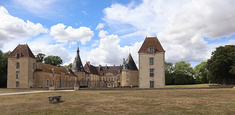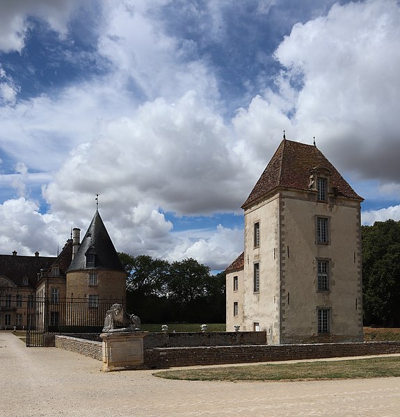 Le château de Commarin se situe sur la commune de Commarin, près de Châteauneuf, en Côte-d'Or (Bourgogne-Franche-Comté), à 40 km à l'ouest de Dijon. Il est classé au titre des monuments historiques depuis le 21 septembre 1949. À l'emplacement d'une ancienne villa romaine, une maison forte existe dès le XIIe siècle; le château du XIVe siècle a laissé les douves et deux tours rondes. Jacques de Cortiambles, chambellan de Philippe le Hardi, transforme au début du XVe siècle la fortification en une enceinte carrée cantonnée de tours rondes, entourée de douves et précédée d'une basse-cour; de cette époque subsistent deux tours rondes et une chapelle voûtée d'ogives. Au XVIe siècle, la chapelle reçoit des décorations et un triptyque pour Girard de Vienne, et une série de tapisseries héraldiques et alchimiques est installée. Au début du XVIIe siècle, Charles Ier de Vienne rebâtit l'aile est, abat l'aile nord et fait ériger en 1622–1623 une grande écurie et deux pavillons aux angles de la basse-cour; le portail d'accès de cette basse-cour est transféré au XIXe siècle à l'entrée des communs. De 1702 à 1713, l'architecte dijonnais Philippe Paris reconstruit le corps principal et l'aile ouest après l'effondrement d'une tour d'angle sud; les tours du côté sud sont détruites et les enceintes fortifiées supprimées. En 1717, Charles II de Vienne et Anne de Chastellux comblent le fossé entre le logis et la basse-cour et font édifier un petit pavillon entre la tour nord-est et l'écurie. L'écurie est reconstruite en 1744 par l'entrepreneur Edme Nicolas Machureau pour Marie-Judith de Vienne, qui entreprend ensuite des travaux d'entretien et de décoration intérieure. Au XIXe siècle, le jardin régulier cède la place à un parc à l'anglaise, la chapelle est restaurée entre 1851 et 1854, et le décor intérieur est modifié dans les années 1850–1860 par des artisans parisiens sur les plans de l'architecte Dusillon, qui rebâtit également l'écurie. Le château a donc été reconstruit aux XVIIe et XVIIIe siècles tout en conservant des éléments des XIVe et XVe siècles. Le bâtiment présente une ordonnance régulière d'inspiration classique : un corps de logis central au fronton richement décoré est flanqué de deux ailes — dite Louis XIII à l'est et Louis XIV à l'ouest — chacune terminée par une grosse tour ronde du XIVe siècle. Une écurie prolonge l'aile est et l'ensemble est ceint de larges douves prolongées de deux pièces d'eau. Le domaine comprend un parc à l'anglaise de cinq hectares, de beaux communs et de larges perspectives. L'intérieur se distingue par un mobilier et des décors des XVIIe et XVIIIe siècles qui témoignent des familles qui ont habité le lieu, et la collection de tapisseries héraldiques et alchimiques du XVIe siècle y est particulièrement remarquable. L'iconographie extérieure comporte un écu aux armes des Vienne et des Fauche de Domprel surmontant la porte de l'aile est, un haut-relief de cheval, un aigle héraldiquement associé à la famille de Vienne, des niches à bustes à l'antique dans l'escalier et une licorne en ronde-bosse près de la porte d'entrée. La porte cochère, en plein cintre, s'inscrit entre deux travées de colonnes encadrant une niche concave; ces colonnes portent un fronton triangulaire interrompu par un édicule à fronton cintré surmonté de l'aigle des Vienne, et la devise familiale "Tout bien à Vienne" est gravée sur la frise de l'entablement. Le château a appartenu successivement aux familles de Cortiambles, Jaucourt de Dinteville, Vienne, Damas d'Antigny puis Vogüé; il a échappé aux guerres et aux pillages de la Révolution et n'a jamais été vendu. Pierre de Commarin, dernier héritier direct de la lignée originelle, mourut en 1346 sans héritier; le domaine passa ensuite à Jean Ier de Cortiambles, puis par alliances successives aux familles citées. Le château conserve ainsi, dans son architecture et ses collections, la mémoire des familles qui l'ont façonné au fil des siècles.
