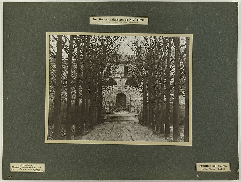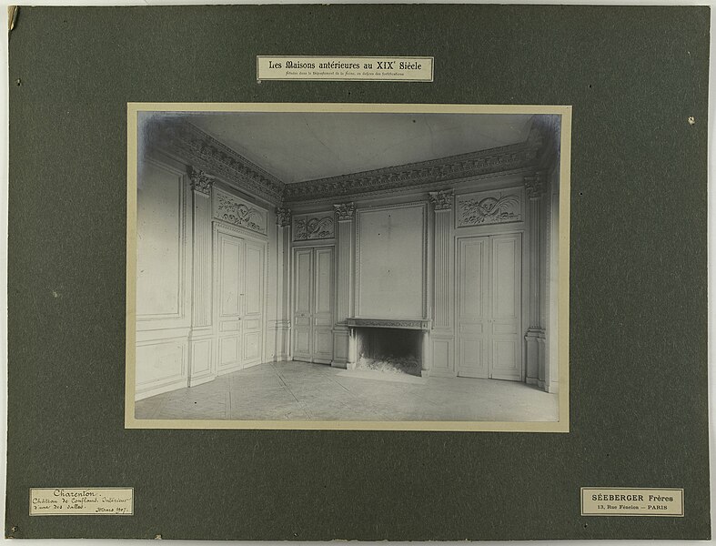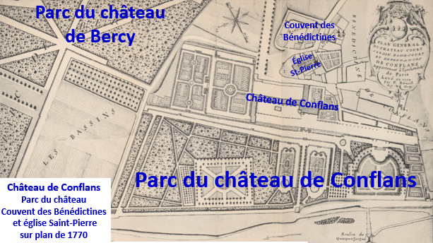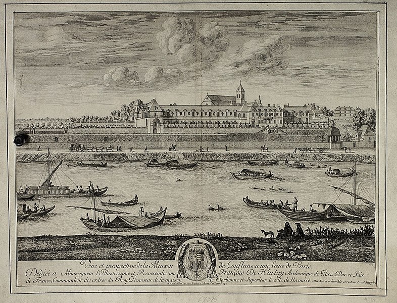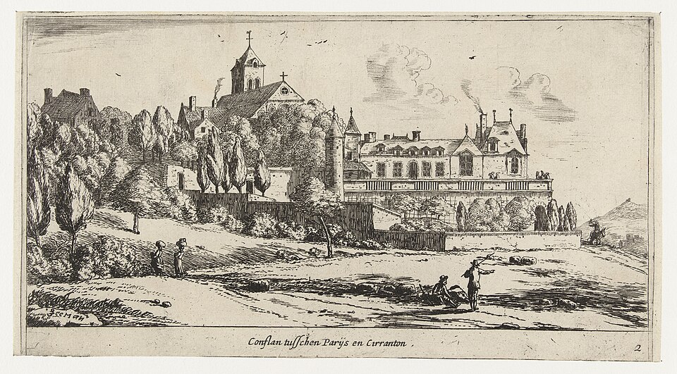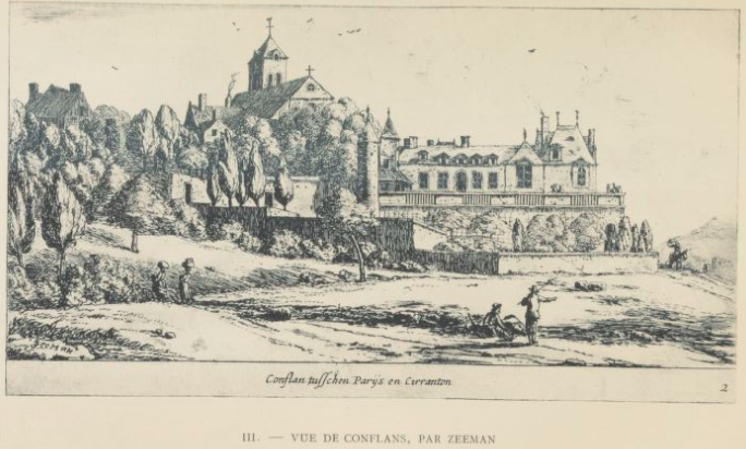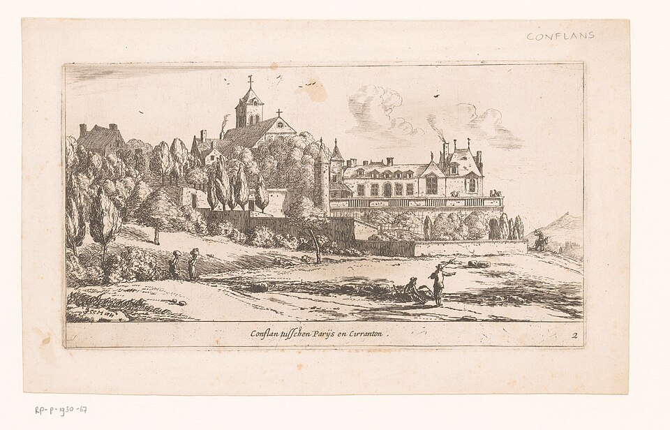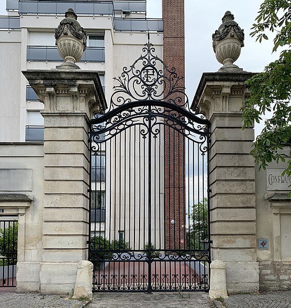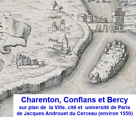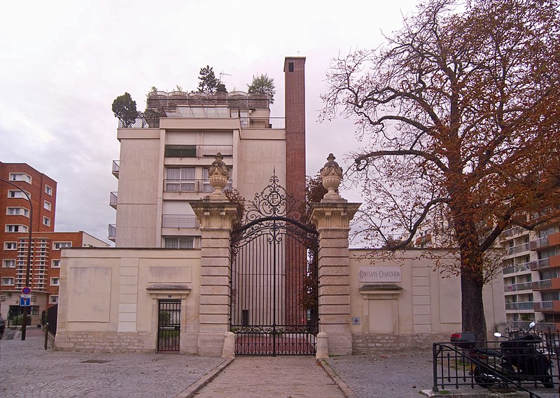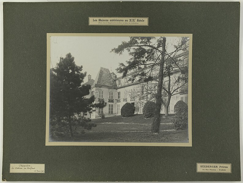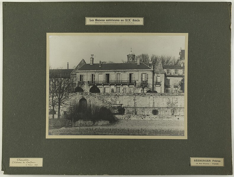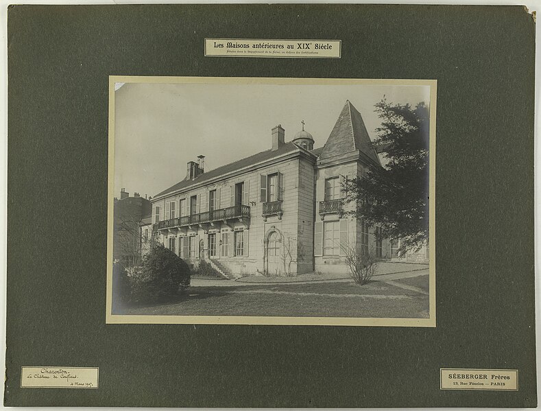 Le château de Conflans, aujourd'hui détruit, se trouvait sur l'actuelle commune de Charenton‑le‑Pont. Ses origines connues remontent à un hôtel possédé par Robert II comte d'Artois, hérité par sa fille Mahaut d'Artois en 1303 ; Mahaut fit agrandir ce logis à partir de 1314, ajoutant notamment une grande salle et une tour carrée crénelée flanquée de tourelles. En 1330 l'hôtel passa à Jeanne de France d'Artois, puis resta jusqu'à la fin du XVe siècle la propriété des ducs de Bourgogne ; à cette époque il était abandonné et en ruine. Au XVIe siècle le fief fut morcelé : une partie fut vendue en 1553 à Jean Gauchery, d'autres parcelles à Claude Dodieu et André Guillard, puis la maison seigneuriale fut acquise en 1568 par Nicolas Legendre, seigneur de Villeroy. Sous la famille de Villeroy d'importants travaux furent entrepris entre 1575 et 1583 : réparation et soutènement de la galerie basse de l'orangerie par Jacques Lefèvre, élévation de l'étage de la galerie des orangers en 1578 par Christophe Lambert avec des charpentiers et couvreurs parisiens, achèvement d'une petite galerie et d'un cabinet en 1579, surélévation des écuries en 1581 et construction du corps de logis entre cour et jardin en 1582 par Pierre Chapponet et Nicolas Conseil, ainsi que l'installation de bassins et fontaines par le sculpteur Mathieu Jacquet. Le décor de la galerie haute, de la fin du XVIe siècle au début du XVIIe siècle, fut achevé en 1603. Au bord de la Seine un pavillon carré fut élevé par l'architecte Louis Le Vau ; son plafond fut peint par Le Sueur pour la marquise de Senneçay entre 1645 et 1649. De 1673 à la Révolution le château servit de résidence d'été aux archevêques de Paris ; ils firent aménager jardins et terrasses par André Le Nôtre et, en 1676, l'ingénieur Georges Stiennon reconstruisit le moulin de Quinquengrogne pour monter l'eau destinée aux bassins. D'autres aménagements et réparations figurent encore : un contrefort de l'aile ouest daté de 1709, la reconstruction du portail d'entrée au nord par Pierre Desmaisons en 1777, la fabrique de jardin et la reconstruction du grand corps de logis par Desmaisons vers 1786, ainsi que la réfection de la chapelle octogonale entreprise en 1788 et achevée en 1824. Devenu bien national, le domaine fut vendu en trois lots entre 1792 et 1795 ; la partie orientale et la chapelle octogonale hébergèrent une succursale du séminaire Saint‑Nicolas‑du‑Chardonnet de 1871 à 1905, puis furent démolies en 1926, les boiseries étant transférées au musée Carnavalet. À la fin du XIXe siècle la percée de l'avenue de la Liberté en 1898 morcela le parc et modifia les abords ; une partie du parc fut aménagée en terrains de sport dans les années 1920, puis des immeubles HBM et des ensembles résidentiels furent édifiés dans les décennies suivantes. L'aile ouest, appartenant à la famille Hartmann de 1888 à 1967, comprenait une galerie ouest éclairée par des baies cintrées et construite sur une cave voûtée, transformée en appartements avant d'être finalement détruite vers 1960 après diverses affectations et ventes. Parmi les vestiges subsistent aujourd'hui le portail d'entrée au nord, restauré, et un grand escalier Renaissance qui donnait accès aux terrasses. Le château, tel qu'il se présentait jusqu'au début du XXe siècle, résultait majoritairement de la reconstruction menée par la famille Villeroy sur les vestiges du manoir du XIVe siècle, avec un corps principal donnant sur le parc, une chapelle et des ailes disposées autour d'une cour. Les jardins en terrasses comportaient un double parterre menant à un petit pavillon au bord de l'eau, une terrasse haute ouvrant sur un grand parterre avec bassin et la perspective sur le moulin de Charenton, ainsi qu'un bosquet agrémenté d'un jet d'eau en forme de pyramide. Le moulin dit de Quiquengrogne, acquis en 1600, fut reconstruit pour abriter une machine hydraulique permettant d'élever l'eau de la Seine vers les réservoirs alimentant le château et ses bassins.