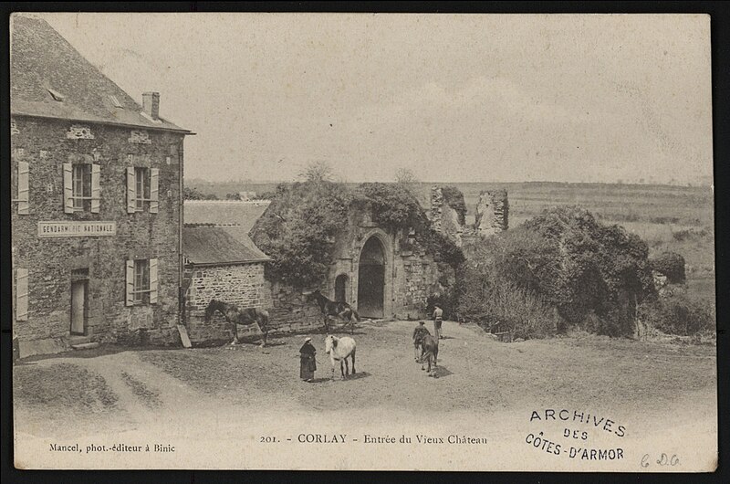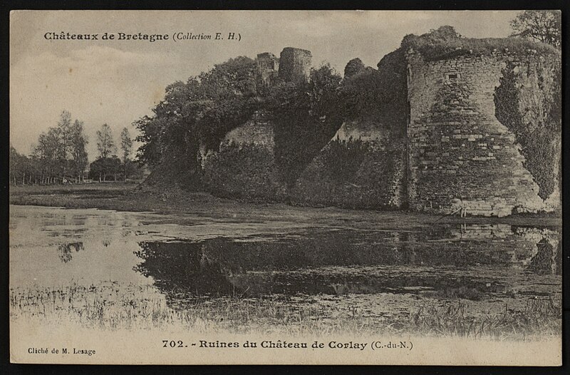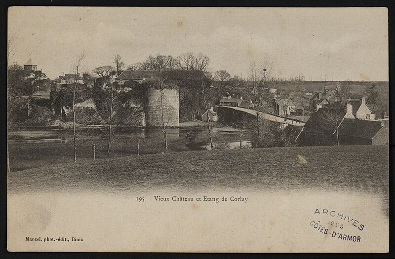 Les restes du château de Corlay se situent sur la commune de Corlay, dans le département des Côtes-d'Armor en Bretagne. Ils dominent à leur flanc nord l'étang des Douves et sont bordés au sud par la route départementale D 767. Les vestiges correspondent à un ancien château clos par de hauts murs percés de machicoulis et de canonières, doté de six grosses tours et de plusieurs corps de logis aujourd'hui en grande partie ruinés. On y reconnaît également les restes d'une chapelle et de galeries, ainsi que des douves et fossés ; l'ensemble était autrefois protégé par un pont-levis. Dans une déclaration faite au roi le 28 juin 1681, Anne de Rohan, princesse de Guémené, indiquait que le château, avec ses douves et fossés, contenait 137 cordes. Les ruines du château sont inscrites au titre des monuments historiques par arrêté du 30 mars 1926. Des sources et ressources en ligne, notamment la base Mérimée et des portails consacrés aux châteaux et aux monuments historiques, documentent ce site.