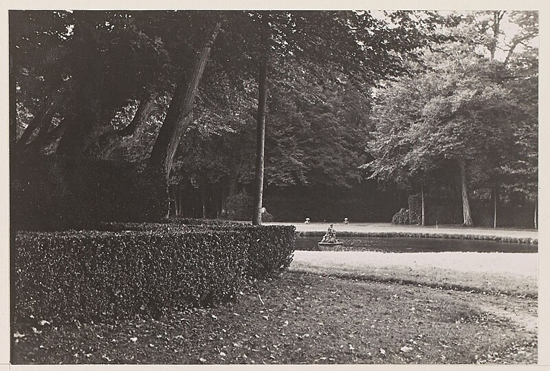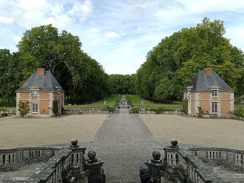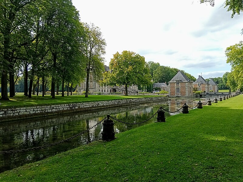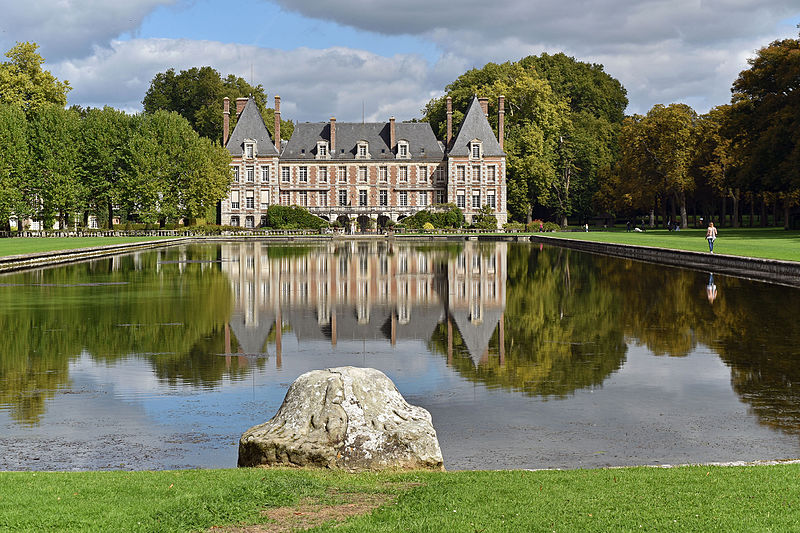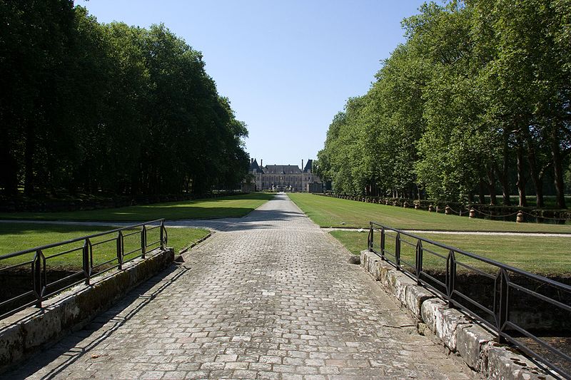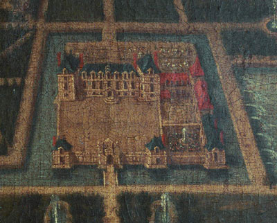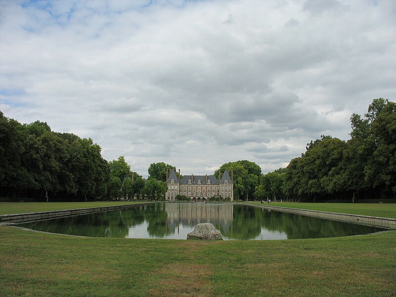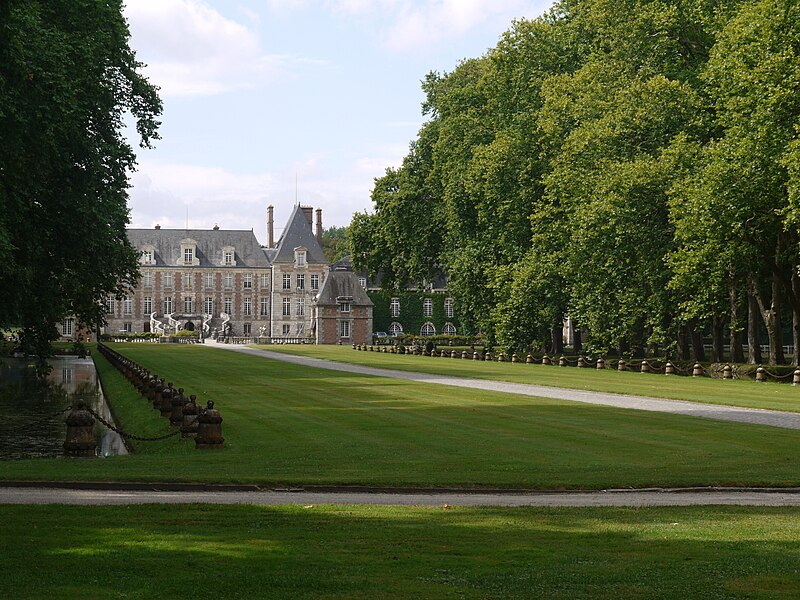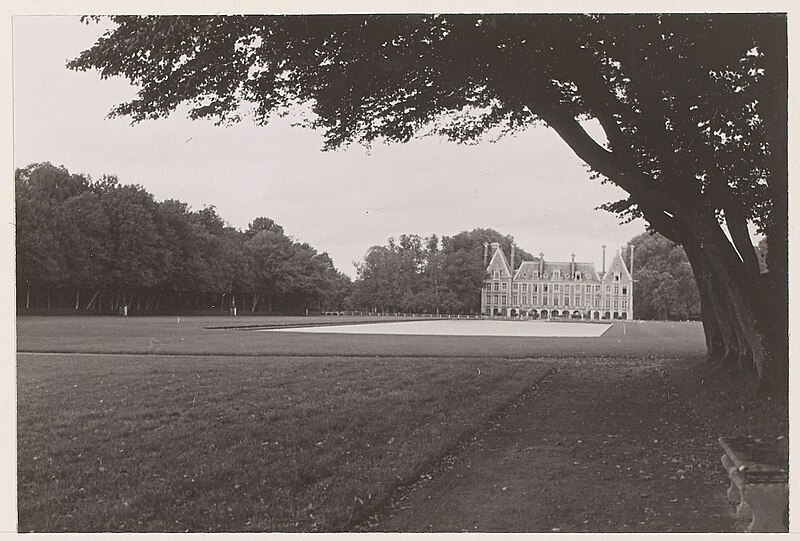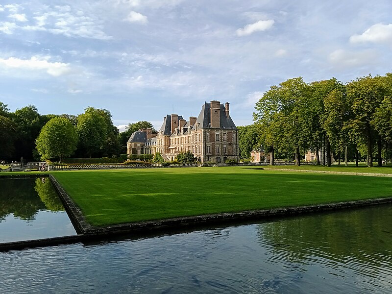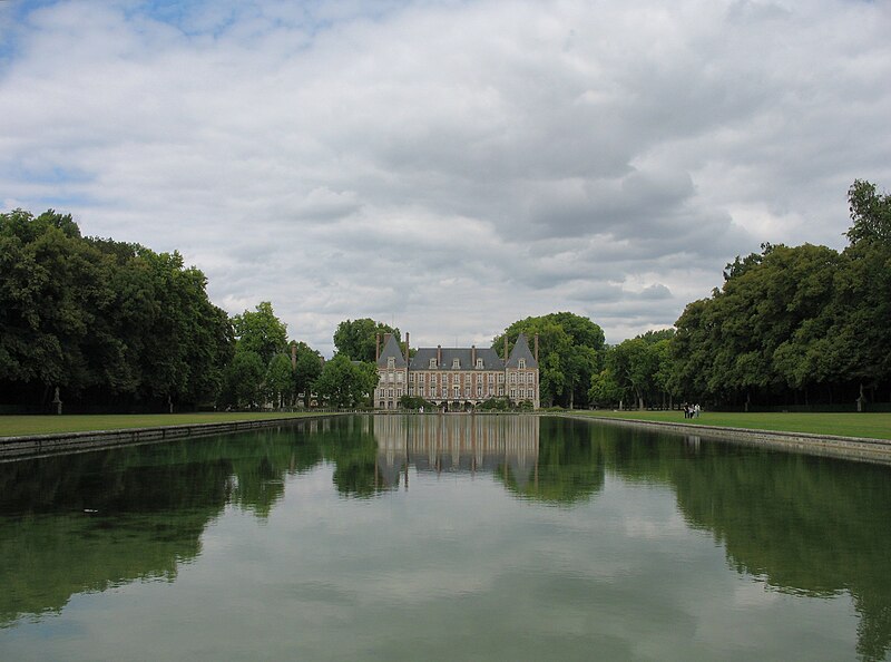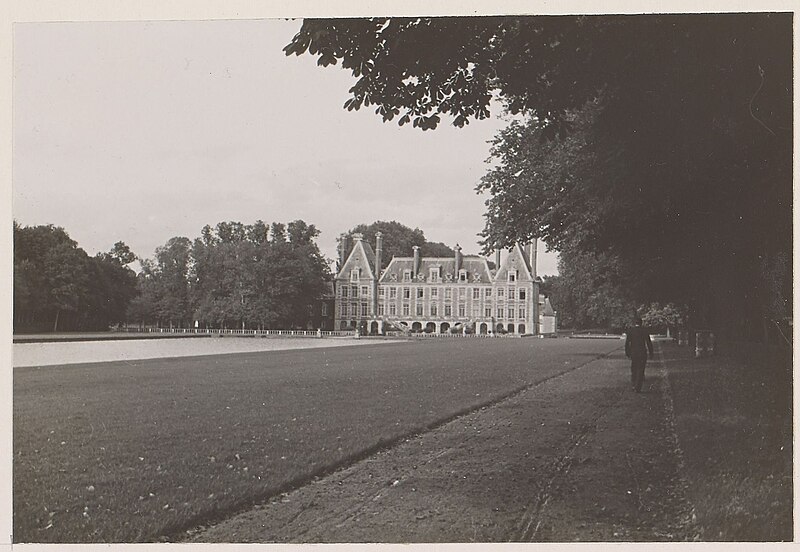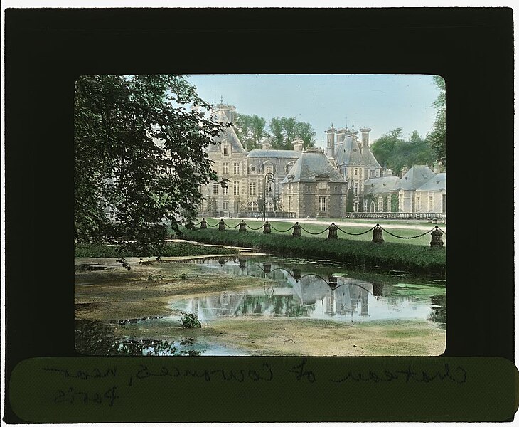 Les vues du domaine montrent le château côté cour et côté jardin, de nombreux bassins et fontaines, un jardin japonais, une allée bordée d'arbres prolongeant la perspective, le canal planté de platanes et les douves à la limite du parc.