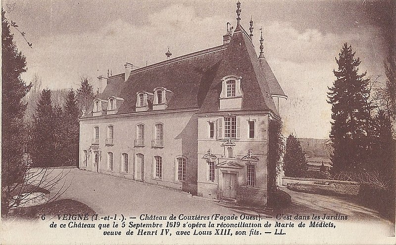 Le château de Couzières, situé sur la commune de Veigné en Indre-et-Loire, occupe le rebord du coteau à 77 mètres d'altitude et domine la rive droite de l'Indre, près du méandre qui accueille le chef-lieu communal. Une forteresse médiévale dite « Château Neuf » avait été édifiée sous Charles VII ; au début du XVIIe siècle Hercule de Rohan-Montbazon fit reconstruire le château, en conservant deux tours qui encadrent le corps de logis et en adossant un pavillon abritant une chapelle. L'édifice fut remanié au XVIIIe et au XIXe siècle ; plusieurs éléments d'architecture et de décor ont été protégés au titre des monuments historiques en 1950. Le 5 septembre 1619, grâce à la médiation du futur cardinal de Richelieu et du duc de Luynes, Marie de Médicis et Louis XIII se rencontrèrent à Couzières pour tenter une réconciliation et y séjournèrent pendant quatorze jours ; cette entrevue n'eut pas de résultats durables, même si le séjour fut apparemment détendu. Marie de Rohan, duchesse de Chevreuse et fille d'Hercule de Rohan, y séjourna fréquemment, notamment lors de ses exils après ses conspirations contre Richelieu puis Mazarin, et Hercule de Rohan y mourut le 17 octobre 1654. Le château, ses dépendances et ses terres furent vendus comme biens d'émigrés le 2 juillet 1796. Architectoniquement, la façade principale orientée est-sud-est, encadrée par deux tours à toitures coniques, présente un étage et un comble éclairé par une série de lucarnes ; les percements des baies datent du XVIIe siècle, la porte centrale est surmontée d'un fronton coiffé d'une niche pour statuette, et un petit pavillon en retour d'angle s'appuie sur la tour sud. Un bassin portant les armes de François Ier, de Claude de France et de Louise de Savoie, ainsi qu'une colonne vestige de fontaine, témoignent d'une construction du premier quart du XVIe siècle ; la cour d'honneur est limitée à l'ouest par les communs et au sud par une portion conservée des douves franchie par un pont dormant. À l'est du jardin, une grotte-fontaine ornée de pilastres ioniques et surmontée d'une balustrade date de la fin du XVIIe siècle ; dans le parc se trouvent par ailleurs plusieurs exsurgences et l'une des sources a été aménagée en grotte de style Renaissance. Un long bâtiment adossé au coteau, à haute charpente en carène de navire et parallèle au logis, servait de communs ; jusqu'en 1812 il était relié au corps principal par une aile nord aujourd'hui disparue. Plusieurs parties du château et de ses dépendances sont inscrites au titre des monuments historiques depuis 1950.