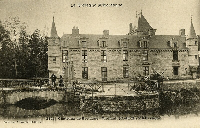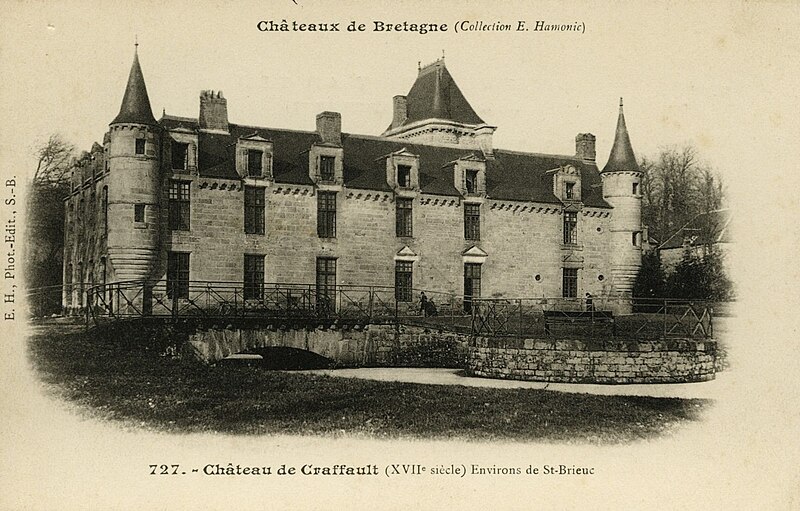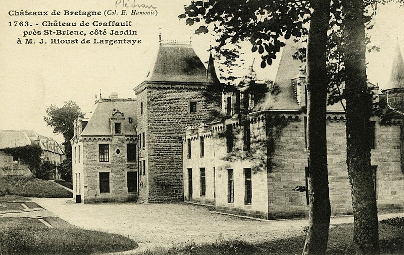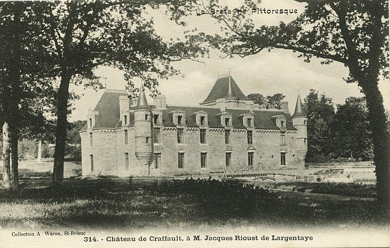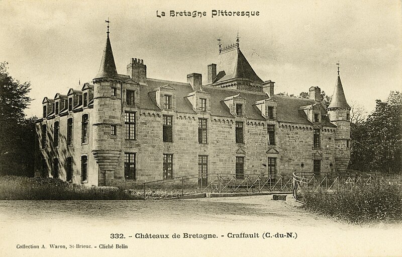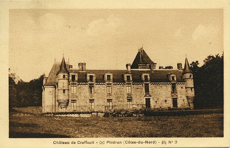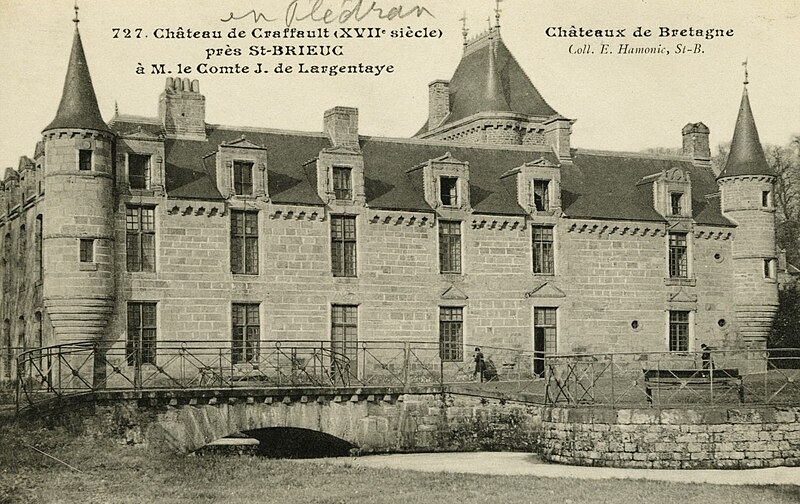 Le château de Craffault se situe sur la commune de Plédran, dans les Côtes-d'Armor en Bretagne. Il comprend un corps de logis dont la façade principale présente une partie droite datant du XVIe siècle et une partie gauche du XVIIe siècle, un pavillon abritant l'escalier principal probablement du XVe siècle, ainsi qu'une galerie, un pavillon et une aile au nord réalisés en 1902. D'importantes restaurations ont été menées entre 1899 et 1902 par l'architecte rennais Jean‑Baptiste Martenot pour le compte de J. de Largentaye ; l'entrepreneur Louis Sébilleau, de Saint‑Brieuc, a exécuté les travaux qui se sont achevés en 1902. Lors de cette campagne, l'édifice ancien a été partiellement démoli, des maçonneries et percements ont été repris et la distribution ainsi que le décor intérieur ont été entièrement refaits ; une nouvelle cuisine et un calorifère y ont également été installés. Des éléments de remploi provenant du château de Cotardais à Médréac ont été intégrés aux restaurations. Le château est partiellement inscrit au titre des monuments historiques par arrêté du 9 mai 1990 ; sont protégés le logis, les douves et les soubassements du châtelet d'entrée. Le monument est documenté par des cartes postales conservées aux Archives des Côtes‑d'Armor et à la Bibliothèque municipale de Brest, ainsi que par des notices d'inventaire (Inventaire Bretagne, Mérimée).