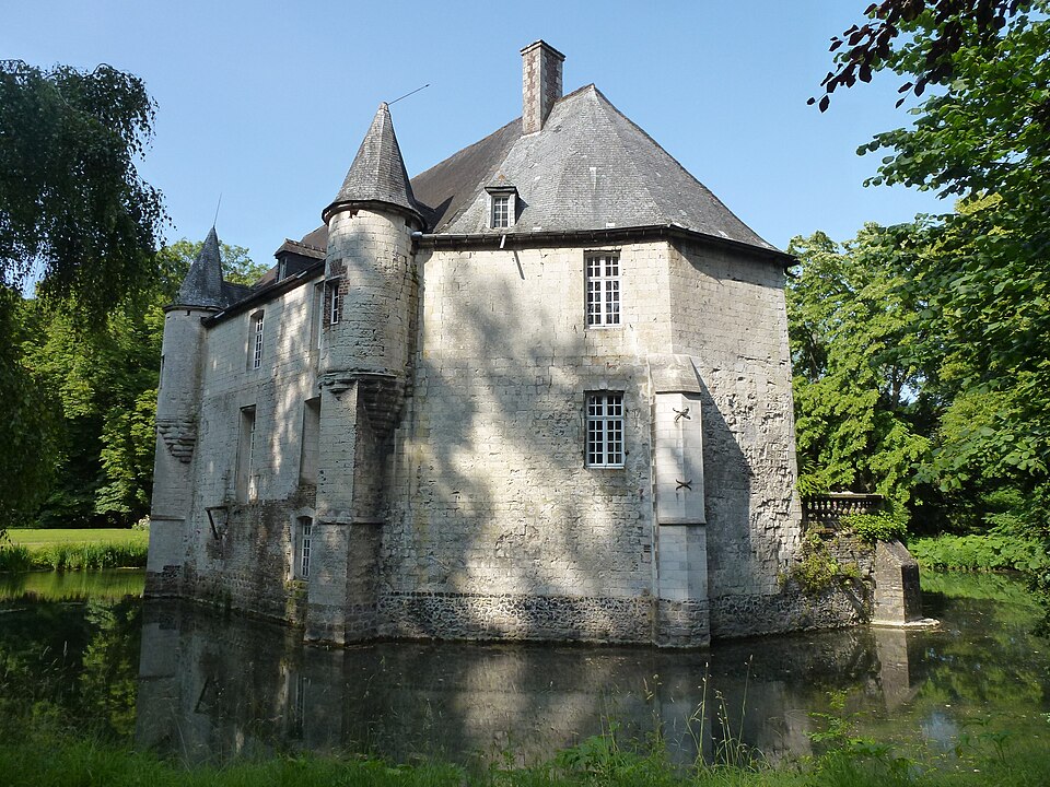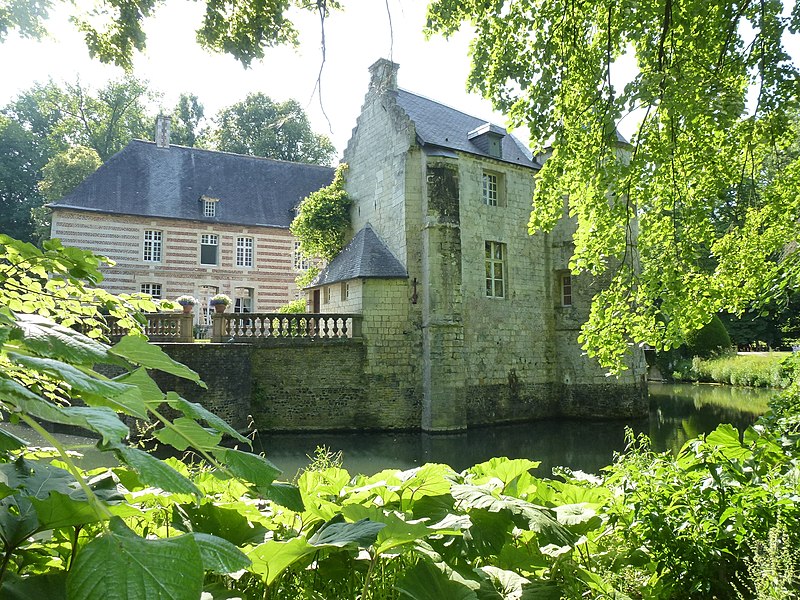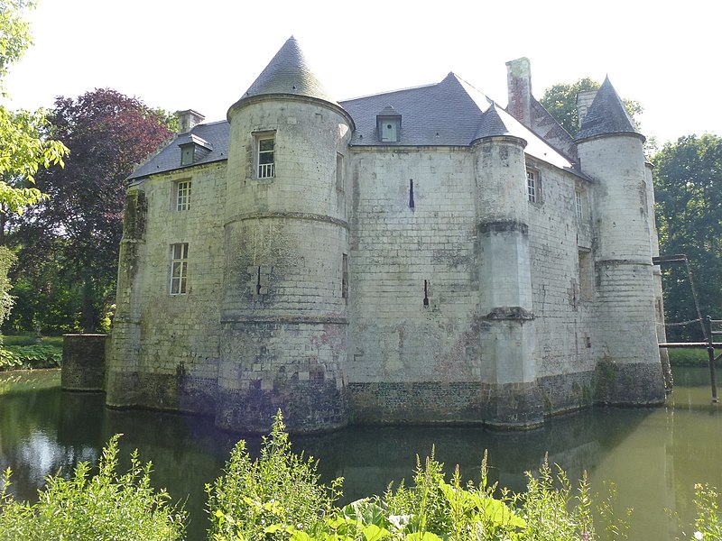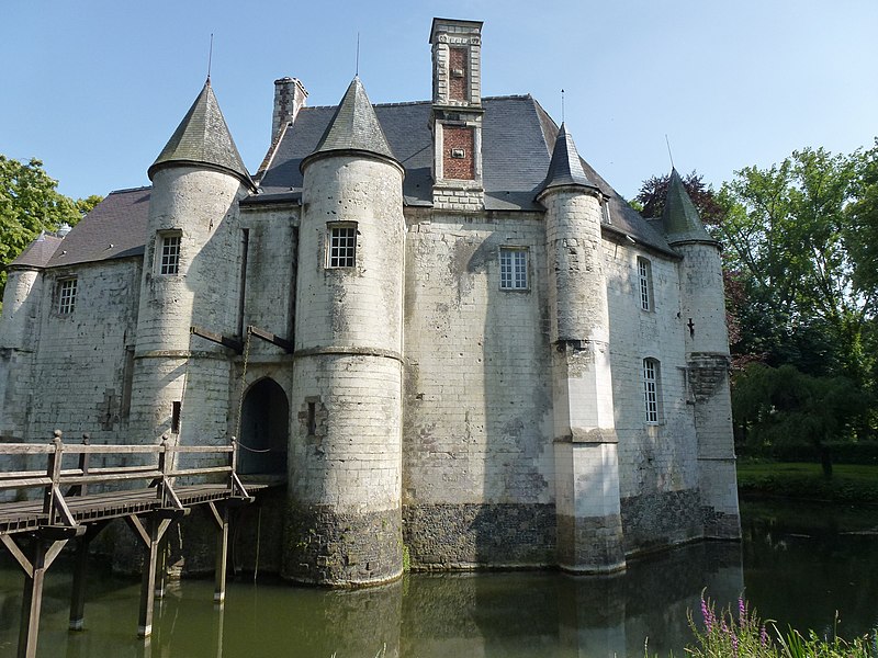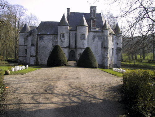 Le château de Créminil, situé à Estrée-Blanche (Pas-de-Calais, arrondissement de Béthune), est attesté depuis 1329. Petit édifice formant enceinte et conçu pour résister aux pilleurs et mercenaires, il présente un plan circulaire ramassé dont chaque angle est flanqué d'une tour, d'une tourelle ou d'un contrefort. Entouré d'une double douve en eau, il est accessible par un pont-levis dont le mécanisme est encore en place. La famille Le May fit construire le château en 1443 ; il fut ensuite restauré après les dégâts causés par des troupes au XVIe siècle. Les seigneurs qui se sont succédé comprennent la famille Le May, Hugues de Buleux (1540), Antoine de Vignacourt (1670) et la famille Le Merchier de 1687 à la Révolution. Durant la guerre de Succession d'Espagne et le siège de Lille en 1708, on rapporte que des colonnes d'armée se dirigèrent vers Estrée-Blanche et que le duc de Malborough aurait campé sur place. Au XVIIIe siècle, l'édifice fut adapté en château de plaisance : une ouverture au sud fut pratiquée, les façades percées et une terrasse aménagée surplombant la douve. L'intérieur subit des remaniements au XIXe siècle et la plupart des dispositions défensives disparurent, à l'exception des ouvertures de tir de la tour nord. Des bâtiments annexes, notamment une ferme et une maison, subsistent autour du domaine. Les douves, le château, le parc boisé et l'allée de tilleuls ont été inscrits le 27 septembre 1946, puis classés au titre des monuments historiques le 19 avril 2005. Le parc, qui comprend l'allée de tilleuls et le secteur boisé délimité par la rivière Laquette, est également inscrit au pré-inventaire des jardins remarquables. Des photographies présentent le côté ouest du château, la cour intérieure et l'entrée principale.
