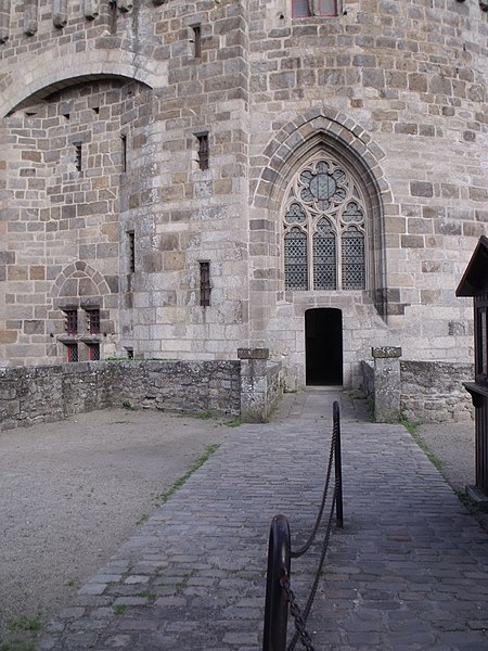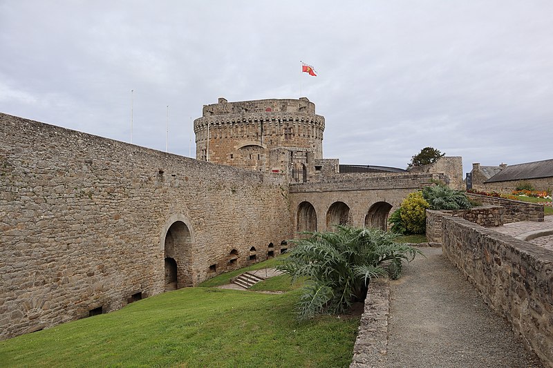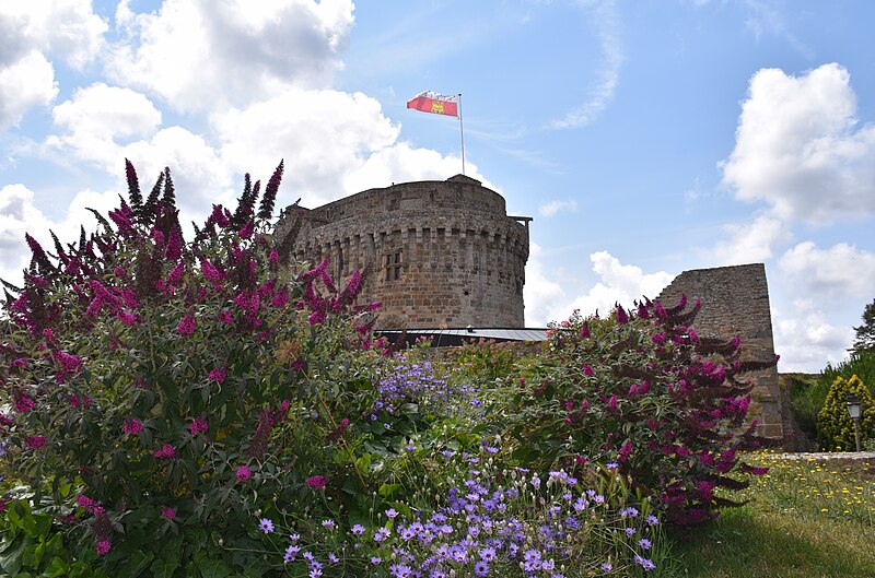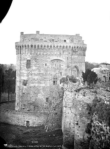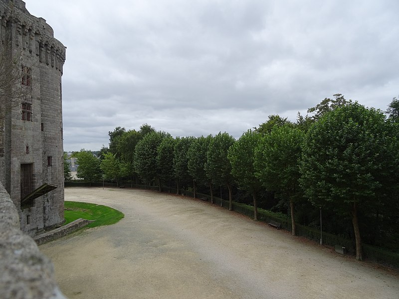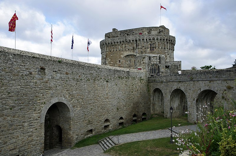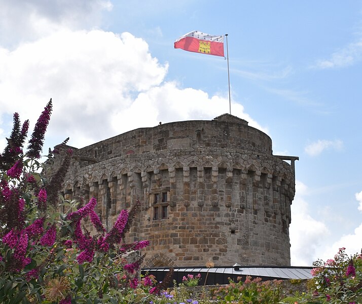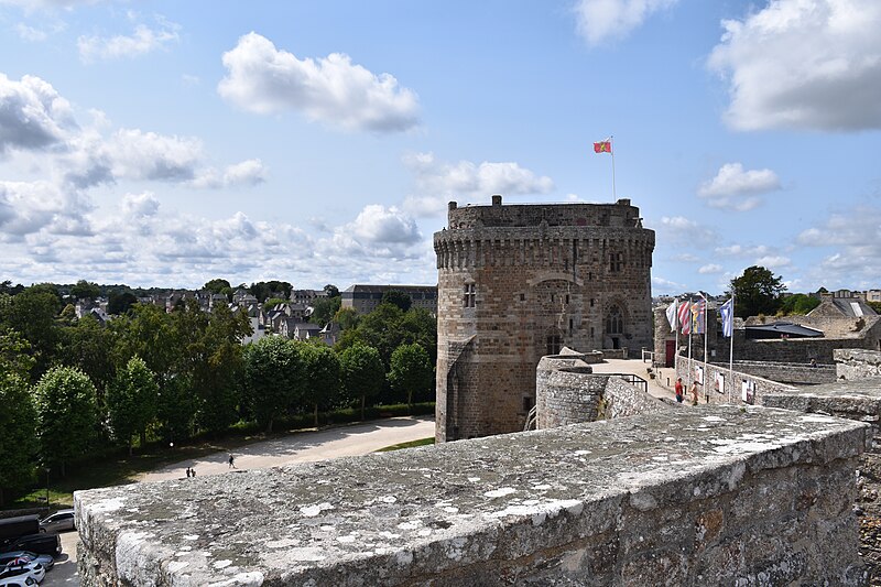 Le château de Dinan est un ancien château fort situé au sud de la ville de Dinan, dans les Côtes‑d'Armor, en Bretagne. Classé au titre des monuments historiques par arrêté du 12 juillet 1886, il a été construit au XIVe siècle sur l'emplacement d'une motte castrale plus ancienne. Cette motte, dite « vieil chastel » ou « Châteauganne », remontait au XIe siècle et se trouvait sur un promontoire au nord‑est de la ville ; elle fut détruite vers 1170 et n'en subsiste aujourd'hui que le toponyme. La tapisserie de Bayeux illustre l'expédition de 1064 et les prises successives de forteresses, dont Dinan, montrant notamment la reddition et des tentatives d'incendie de la palissade sommitale. Après la guerre de succession de Bretagne, Jean IV fit édifier à Dinan une tour maîtresse vers 1380, chantier conduit par le maître d'œuvre Étienne le Tur et achevé à la fin du siècle. La tour, formée de deux tours rondes accolées et d'un avant‑corps carré à l'ouest, culmine à plus de trente mètres et se distingue par un couronnement à mâchicoulis à quatre ressauts ; elle était à l'origine couverte d'ardoises. À la fin du XVe siècle fut élevée la tour Coëtquen, tour d'artillerie liée aux travaux de modernisation de l'enceinte, puis l'ensemble fut transformé au XVIe siècle par le duc de Mercœur. Sous son impulsion, la tour maîtresse fut reliée à la tour Coëtquen par une gaine dite « souterrain Mercœur », la porte du Guichet fut murée et une cour‑haute protégée par des structures en éperon fut aménagée, les embrasures étant alors orientées vers la ville. Délaissé au XVIIe siècle, le monument fit l'objet de rapports en 1693 et 1701 de l'ingénieur Siméon Garangeau, qui préconisa sa transformation en résidence puis en prison militaire. Pendant le XVIIIe siècle, des marins anglais y furent détenus en grand nombre ; la toiture fut remplacée par une terrasse et le chevet de la chapelle percé pour ouvrir une nouvelle entrée. Devenu prison de droit commun au XIXe siècle, il fut racheté par la ville au début du XXe siècle et accueillit un musée municipal à partir de 1908 ; les collections ont été retirées progressivement en 2015 pour être conservées en réserves. En 2014, la municipalité a lancé un vaste programme de restauration et de mise en valeur fondé sur d'importantes recherches historiques. L'ensemble est composite : la tour ducale du XIVe siècle, la porte du Guichet — ancien accès méridional de la ville — et la tour Coëtquen s'inscrivent dans l'enceinte urbaine du XIIIe siècle édifiée par les ducs de Bretagne. La tour‑palais de Dinan, par la complexité de son plan et la qualité de ses décors, figure parmi les grandes demeures princières de la fin du XIVe siècle et, à l'échelle de la Bretagne, témoigne du raffinement de la cour des Montfort aux côtés de monuments comme Nantes ou Suscinio. À l'origine elle comportait un sixième niveau et une toiture à double sommet d'ardoises, mentionnée en 1636. La distribution intérieure, sur cinq niveaux, reflète sa vocation résidentielle : cuisine, salle de banquet, chambre de parement avec chapelle, chambre de retrait et appartements privés. Ouvert au public tous les jours d'avril au 30 septembre, puis du mardi au dimanche d'octobre à décembre, le site a connu une fréquentation en hausse depuis 2013. Avec plus de 55 000 visiteurs en 2019, il est le monument le plus visité de la ville et le second château des Côtes‑d'Armor en nombre de visiteurs après le Fort‑la‑Latte. Les aménagements inaugurés le 9 juin 2019 ont rouvert au public le souterrain Mercœur, restitué l'emprise de la cour d'honneur et introduit une nouvelle scénographie axée sur l'art de la guerre au XVe siècle et la vie quotidienne dans les résidences princières, faisant largement appel à l'archéologie expérimentale. De juin à septembre, plusieurs visites thématiques sont proposées quotidiennement. Parmi les éléments exposés figurent notamment un vaisselier domestique des XIVe‑XVe siècles et des latrines ; le château a également servi de décor au film Du Guesclin (1948).