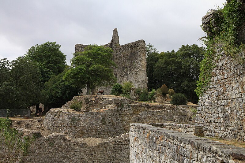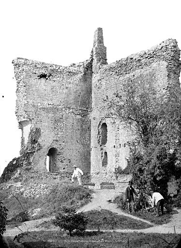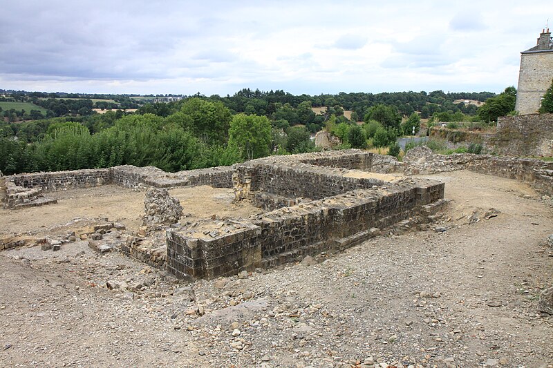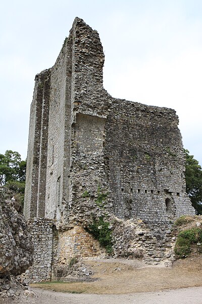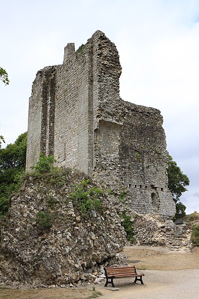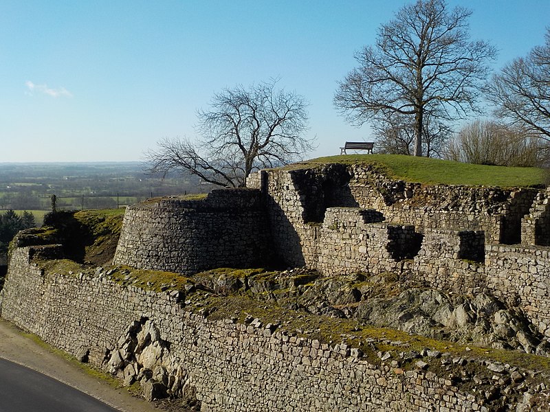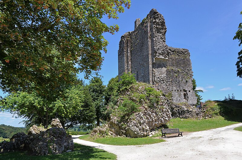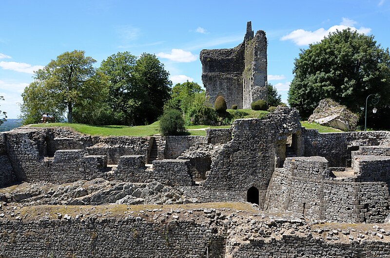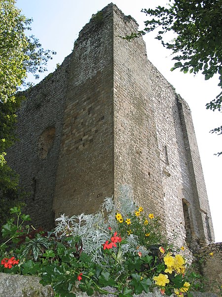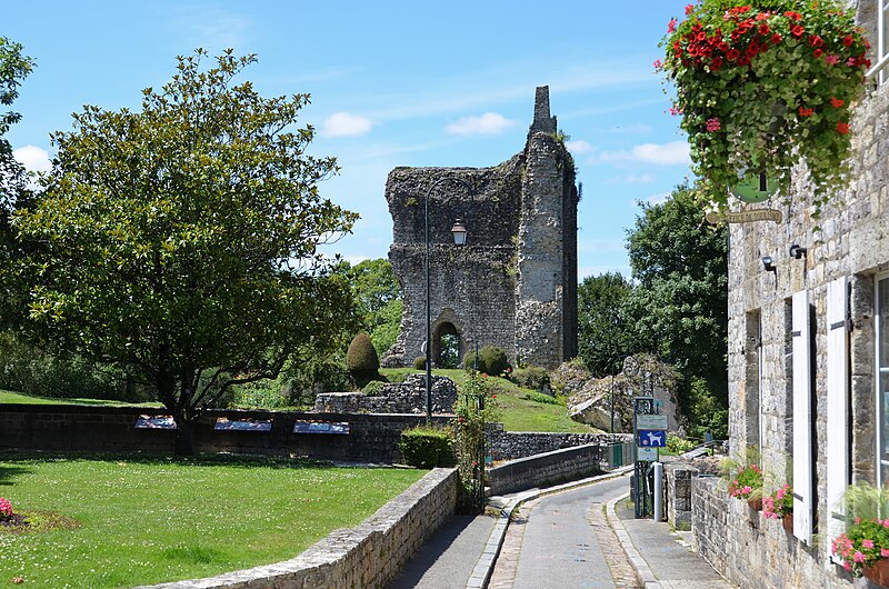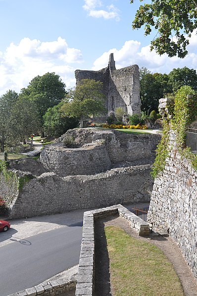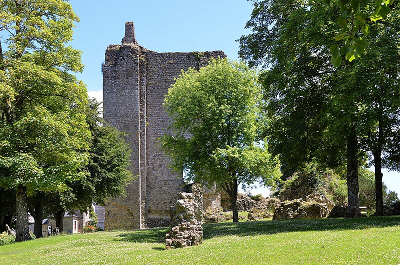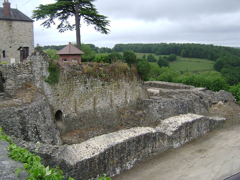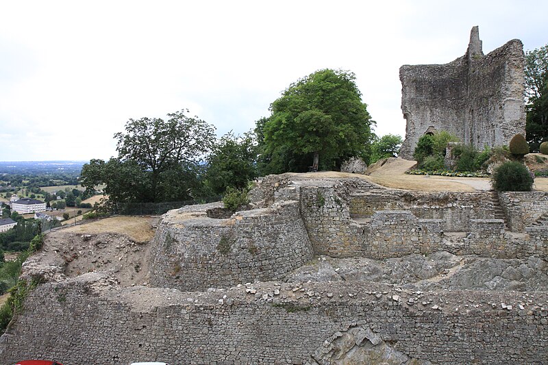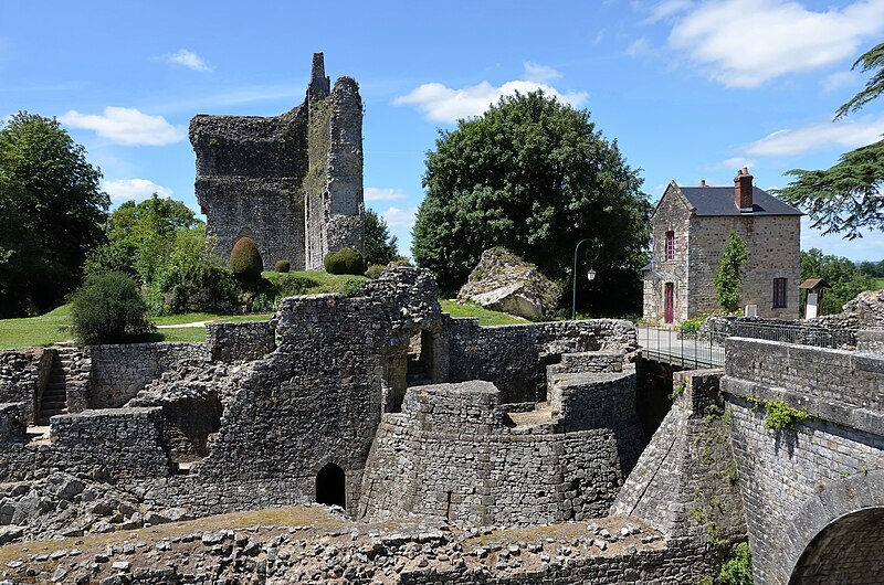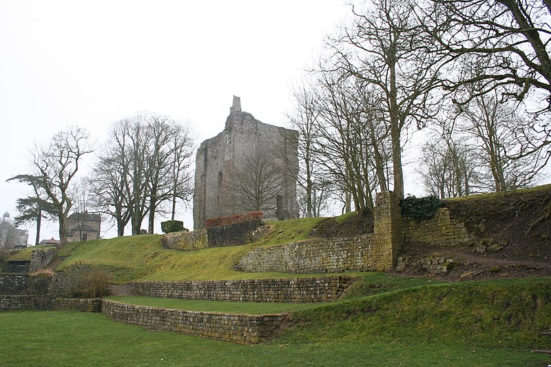 Le château de Domfront, aujourd'hui en ruine, occupe l'extrémité ouest d'une crête de grès dominant la cluse de la Varenne de plus de 70 mètres et commandant les marches méridionales du duché de Normandie. Ses vestiges se dressent sur le territoire de l'ancienne commune de Domfront, dans le département de l'Orne, au sein d'un parc public libre d'accès situé à 400 mètres au nord‑ouest de l'église Saint‑Julien. Au début du XIe siècle fut édifiée une première fortification principalement en bois, qui attira les populations voisines et favorisa la fondation de la ville. Le donjon, reconstruit vers 1120 et élevé en grand appareil roman, forma l'un des plus imposants de Normandie ; il subsiste aujourd'hui deux pans nord et est, conservés sur une hauteur de vingt‑huit mètres avec des murs d'environ trois mètres d'épaisseur. À proximité subsistent les restes d'une chapelle castrale de style roman, la chapelle priorale Saint‑Symphorien, ruinée probablement lors du démantèlement du château. Entre 1289 et 1304, Robert II d'Artois fit édifier les murailles, le pont‑levis et l'essentiel des casemates ; l'enceinte est comprend notamment deux tours du XIe siècle, un chemin casematé, deux tours polygonales formant la tête du pont‑levis et un fossé. Un tronçon du mur d'enceinte nord est conservé avec une tour, une poterne pourvue d'un mâchicoulis, une bretèche, un fossé et le rempart qui reliait l'ensemble à l'enceinte urbaine. Le château a été l'enjeu d'innombrables luttes : il a subi treize sièges au cours de son histoire, impliquant des acteurs tels que Geoffroy Martel, Guillaume le Conquérant, Henri Beauclerc, Philippe Auguste, des troupes bourguignonnes et anglaises, ainsi que des factions protestantes. Propriété de seigneurs normands puis des Plantagenêt, il fut lié à des personnages illustres — Aliénor d'Aquitaine y séjourna et y reçut Domfront en douaire, Aliénor de Castille y naquit, et Henri II y tint des assemblées et remania la place. En 1204, dans le cadre de l'annexion de la Normandie, Domfront passa aux mains de Philippe Auguste puis connut plusieurs changements de seigneurie entre familles royales et seigneuries locales. Des rénovations au XIVe siècle renforcèrent la forteresse, qui résista notamment aux attaques du duc de Bourgogne en 1412. Au cours des guerres de Religion, le donjon fut brièvement pris par des capitaines protestants puis repris après bombardement ; Gabriel Ier de Montgommery s'y rendit en 1574 et fut ensuite livré à la justice royale. Henri IV imposa des démolitions et Sully ordonna le démantèlement du château en 1608, démolition qui fut réalisée en 1610. Le site comporte, autour du donjon, les vestiges d'un logis et des casemates souterraines du XIIIe siècle, ainsi que les restes de l'enceinte de la citadelle flanquée de tours qui dominait le fossé séparant le château de la ville. Les ruines font l'objet de restaurations menées depuis 1984 par l'Association pour la restauration du château de Domfront. Les ruines du donjon sont classées au titre des monuments historiques (liste de 1875) et l'enceinte avec ses remparts, tours, bretèches, casemates et les chapelles Sainte‑Catherine et Saint‑Symphorien est protégée par arrêté du 18 février 1986 ; l'enceinte de la ville bénéficie d'un classement distinct par arrêté du 13 octobre 1988.