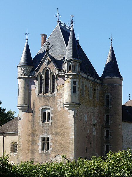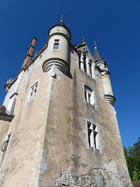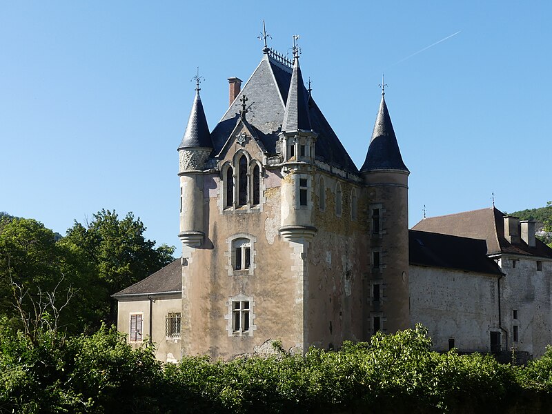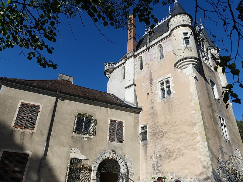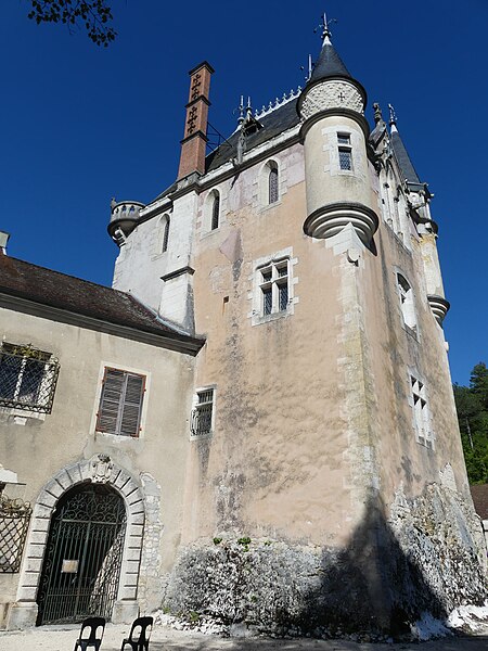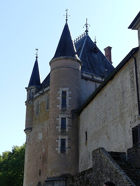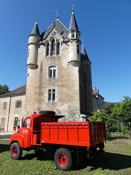 Le château de Dortan, situé à Dortan (Ain, Auvergne-Rhône-Alpes), est un manoir médiéval formé notamment d'un corps de logis nord daté des XVe–XVIe siècles et de deux grosses tours carrées. Il succède à un ancien château fort et appartint plus de 530 ans à la famille de Dortan, qui fit édifier la grosse tour nord au début du XIVe siècle; un différend sur cette construction fut arbitré en faveur des seigneurs de Dortan en 1339. En 1637, pendant les guerres de Franche-Comté, le château fut lié à un arrêt de confiscation et de démolition prononcé contre Louis de Dortan et son fils, puis donné et restitué peu après. La seigneurie resta liée aux Dortan avant d'être vendue en 1720 à Pierre Gaulthier; au XVIIIe siècle M. d'Uffelle, l'un des propriétaires, reçut la visite de Voltaire. L'édifice fut transformé au XVIIIe siècle en demeure de plaisance avec pièces de réception, jardin en terrasse et parc, puis restauré au XIXe siècle avec création de décors intérieurs et d'une chapelle néo-gothique par Louis Sainte‑Marie Perrin. En 1858 l'industriel Noël Le Mire fit reconstruire la tour sud, aménager la chapelle et poursuivre la restauration; le château passa ensuite aux familles Richoux et Roux. Lors du massacre de Dortan en 1944, les troupes allemandes y installèrent leur quartier général et des habitants furent détenus, torturés et exécutés. Après dix-huit années d’inoccupation, il fut acquis en 1973 par Marius Rollet. L'ensemble conserve un bâtiment de cuisines du XIVe siècle, une salle d'armes avec cheminée gothique, un jardin à la française et un parc abritant la source vauclusienne dite « source bleue »; il est inscrit au titre des monuments historiques, y compris ses parties souterraines, l'esplanade ouest, le jardin en terrasse sud, le parc, ses dépendances et le moulin-pompe (arrêté du 12 décembre 1997).