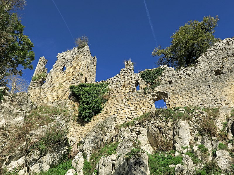 Le double donjon et la double enceinte encore lisibles témoignent d'une organisation défensive médiévale. Un bastion protégeait l'entrée en chicane du château, tandis que la deuxième enceinte, encore crénelée, conserve sur son tracé des vestiges d'un ancien chemin de ronde en bois et de meurtrières. Les deux donjons et leur dispositif de défense sont implantés sur l'emplacement le mieux protégé, dominant un à‑pic. L'ancienne chapelle, en ruines, se trouve en contrebas du bastion nord‑est ; elle comportait une nef unique voûtée en charpente, un chœur voûté en berceau et une abside en cul‑de‑four.