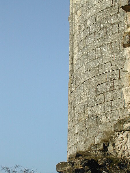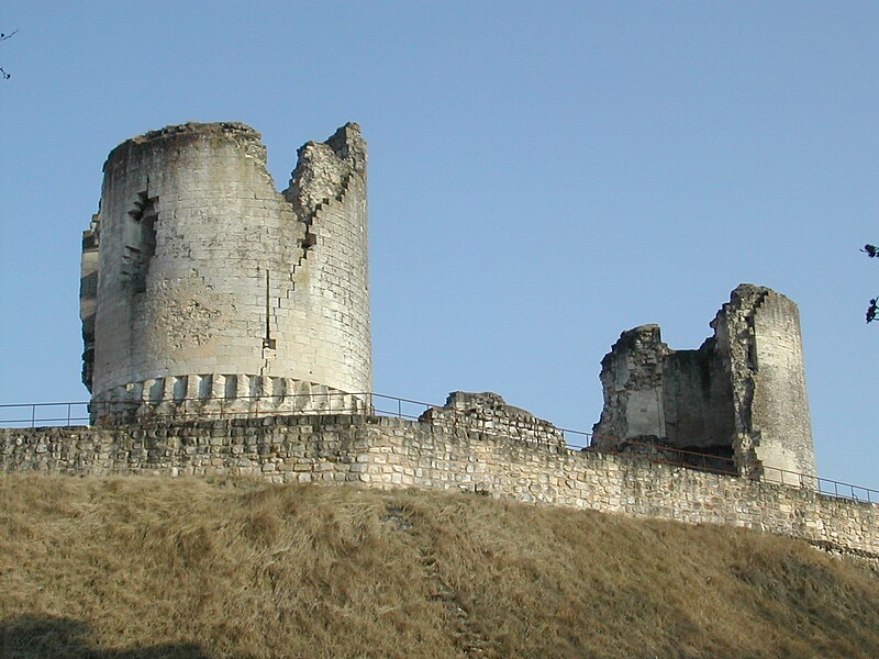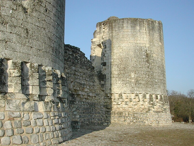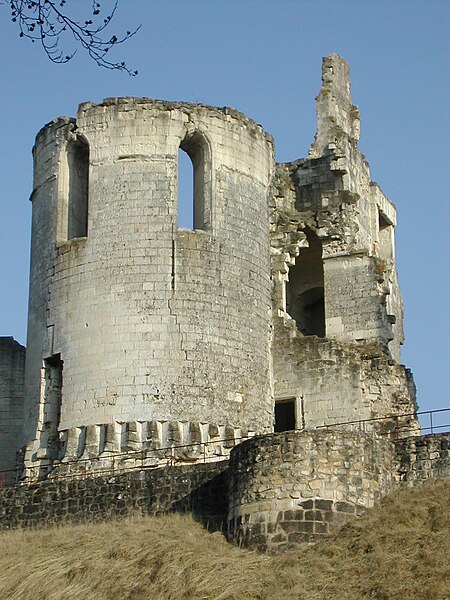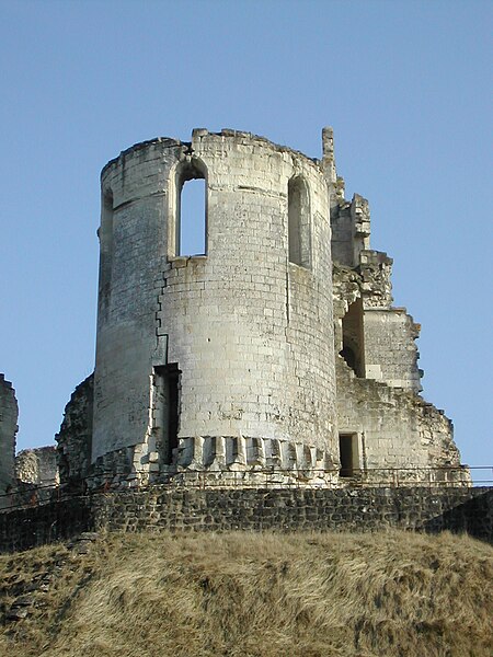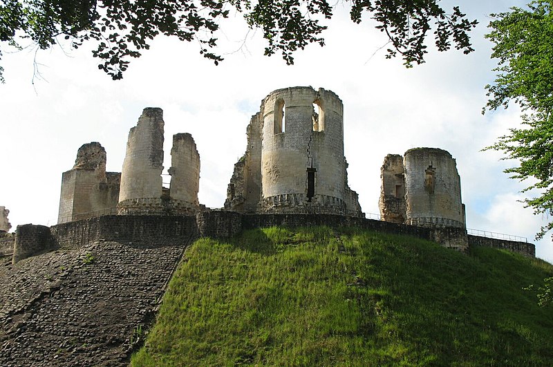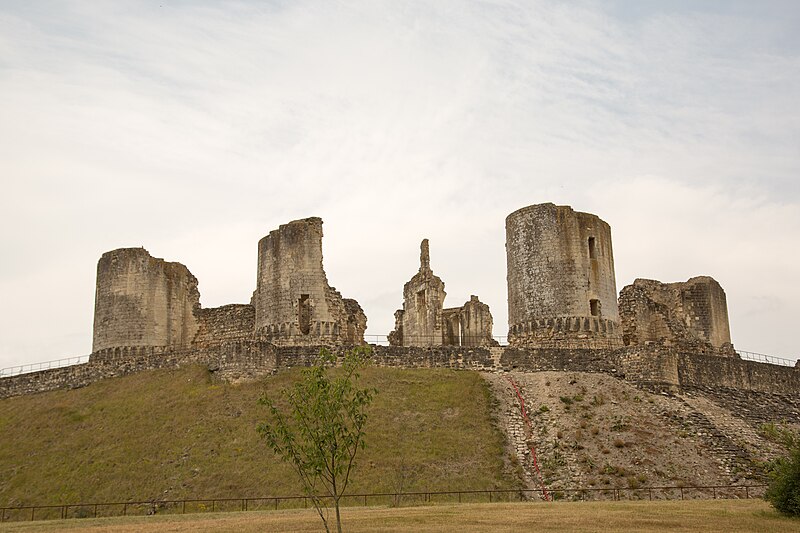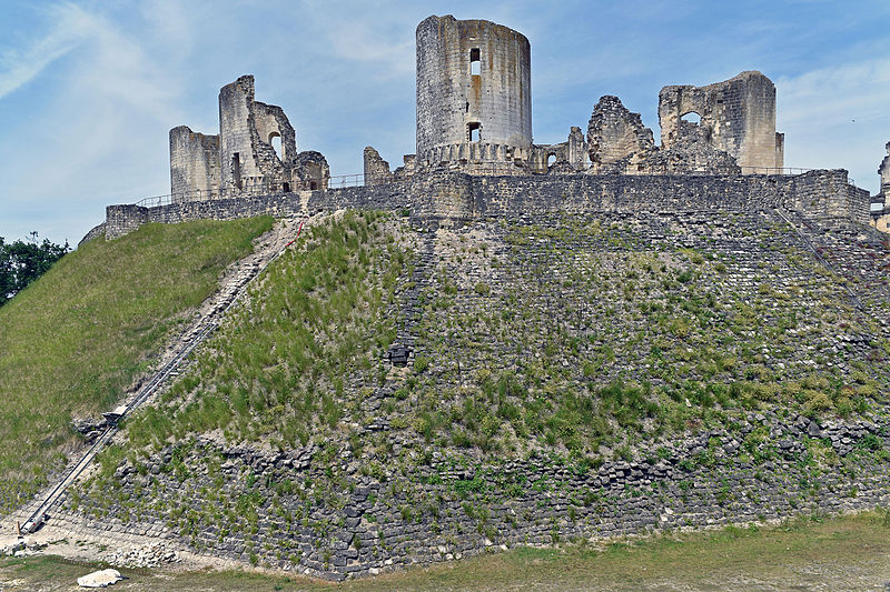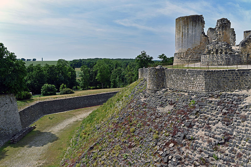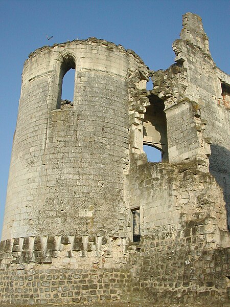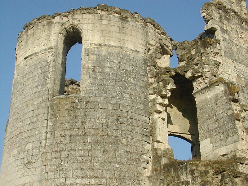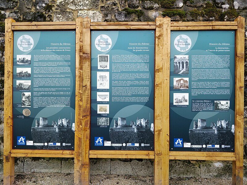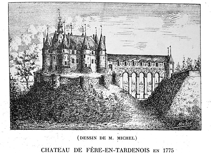 Situés sur la commune de Fère-en-Tardenois, à environ trois kilomètres au nord-nord-est du bourg, les ruines s'élèvent sur une haute motte artificielle dans le département de l'Aisne. Une place forte y est déjà mentionnée par Flodoard vers 958. La terre de Fère passe, à la fin du XIIe siècle, des archevêques de Reims à la maison de Dreux ; Robert II engage la construction d'une forteresse à partir de 1206, chantier qui se poursuit jusqu'au milieu du XIIIe siècle. Le château, qui a servi de modèle à de nombreux autres, est caractérisé par une enceinte irrégulière heptagonale flanquée de tours cylindriques. La courtine est percée d'une basse-cour et autour d'une cour heptagonale s'alignent sept grosses tours rondes aujourd'hui très ruinées. Ces tours reposent sur des assises particulières, composées de trois à cinq lits semblant former des « dents d'engrenage », et sont percées de hautes archères ; leurs étages étaient séparés au XIIIe siècle par des planchers, disposition remaniée à la Renaissance. L'enceinte est installée sur une motte semi-artificielle haute de 18 mètres, dont le glacis est revêtu de pavés de grès.