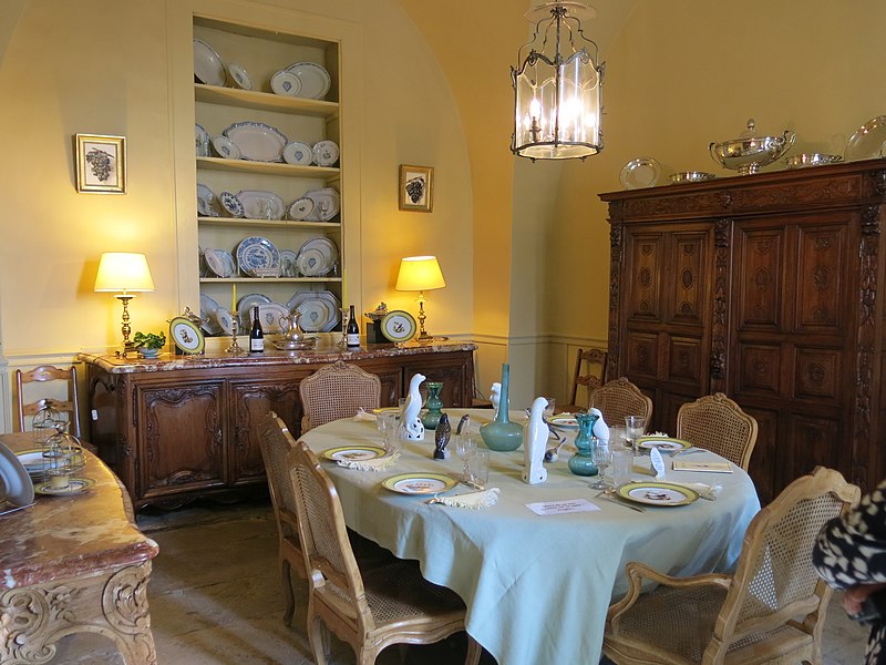 La composition intérieure s’appuie sur un escalier remarquable à clés pendantes qui s’élève sur trois étages sans soutien de pilier, démontrant une réelle virtuosité technique. Les murs de l’escalier et des salons sont décorés d’une suite de tapisseries des Flandres datées de 1670, représentant des scènes de la vie de Moïse ; les salons conservent des ensembles de mobilier Louis XV et Louis XVI, des portraits de famille, ainsi qu’une importante collection de porcelaines et de faïences, dont un service aux armes de la famille de Saizieu réalisé en 1872 par Émile Gallé. Le grand salon abrite un zograscope d’époque Louis XV ; la bibliothèque contient une série d’instruments scientifiques anciens. La chambre de l’Aigle présente un décor peint par Diane de Montbron en 1990 sur le thème de la campagne d’Égypte et rassemble des objets évoquant l’empereur Napoléon. Le château possède en outre une rare table à échantillons de marbres comportant 177 carreaux différents, issue de l’atelier des pierres dures des Gobelins.