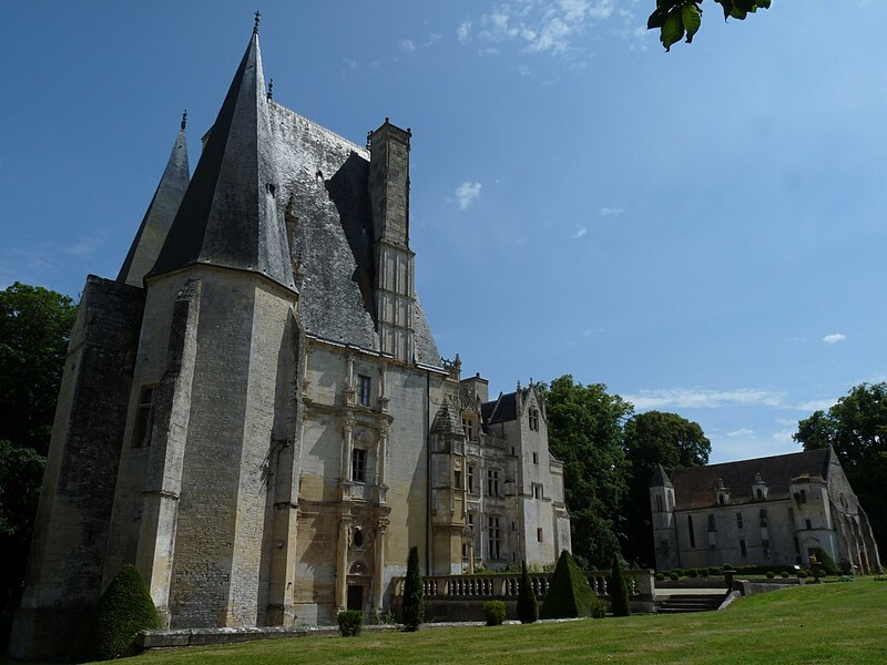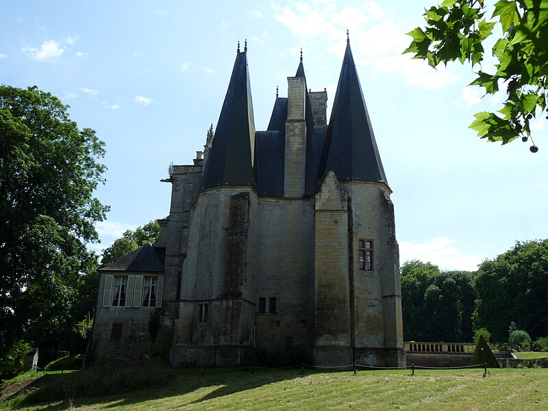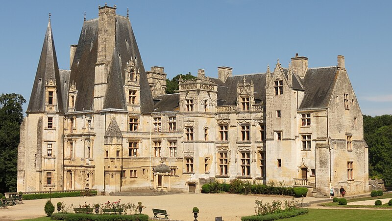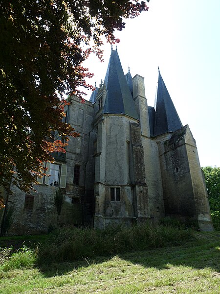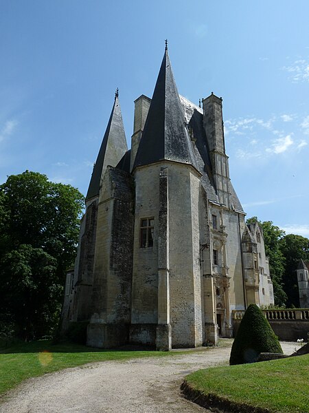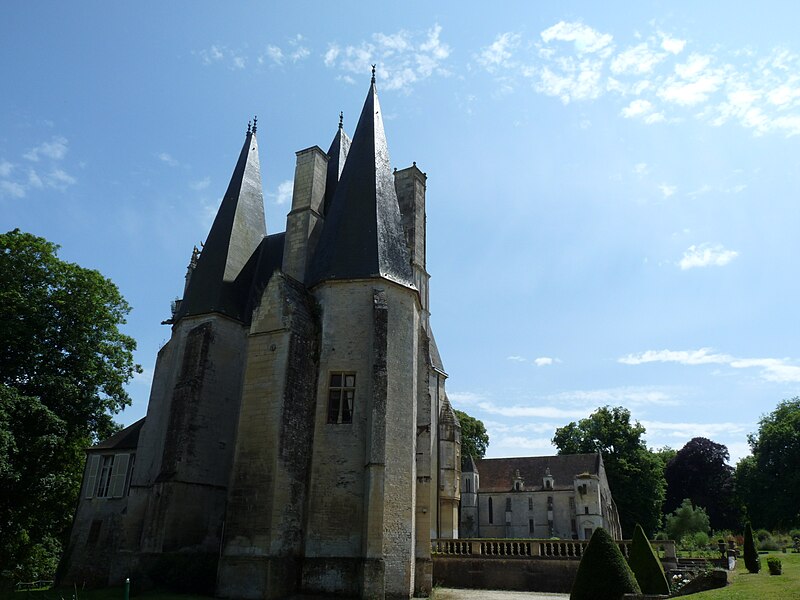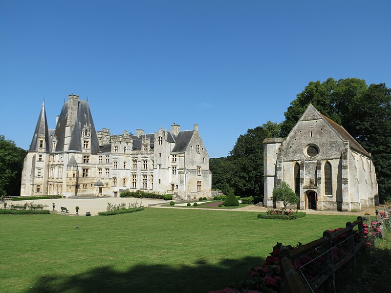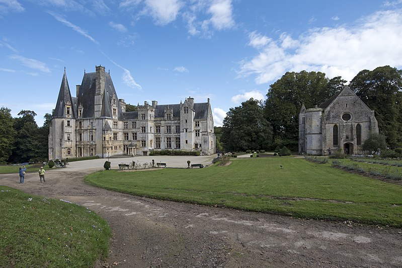 Le château de Fontaine-Henry, situé à Fontaine-Henry (Calvados, Normandie), est une demeure classée au titre des monuments historiques. Le site prend racine au début du second millénaire : une forteresse est attestée au XIe siècle et un nouvel édifice est élevé entre 1200 et 1220, dont subsistent la chapelle et des salles voûtées. Transmis par héritage depuis près de dix siècles et jamais vendu, le domaine a appartenu successivement à plusieurs familles, dont les Tilly, les d'Harcourt, les Morais, les Cornulier et enfin les d'Oilliamson, propriétaires actuels. Jeanne de Tilly apporta la seigneurie aux d'Harcourt par son mariage en 1374, et cette famille entreprit la reconstruction du château après la guerre de Cent Ans. Les principales campagnes de construction menées par Jean et Pierre d'Harcourt commencent vers 1480 et s'achèvent vers le milieu du XVIe siècle, conférant au château son aspect actuel. L'édifice se distingue par de nombreuses tours, une façade flamboyante richement décorée et des lucarnes ornées qui annoncent la transition entre gothique et Première Renaissance. La composition et l'abondance des ouvertures relèvent du style Louis XII et de la Première Renaissance, tandis que la seconde Renaissance se manifeste dans les parties achevées par Blaise Le Prestre. Le Prestre a notamment conçu un grand escalier droit et orné la façade ouest du gros pavillon d'une superposition régulière d'ordres et d'entablements inspirés de l'antique. Le gros pavillon quadrangulaire, coiffé de très hauts combles et dominé par une imposante cheminée, forme un pendant monumental aux façades Renaissance. L'ensemble, parfois qualifié d'écho des châteaux de la Loire en Normandie, reste un témoignage précieux de l'évolution du goût du gothique tardif au classicisme renaissant. La chapelle Notre-Dame-du-Val-Busnel, d'origine romane, est voûtée d'ogives depuis le XIIIe siècle et a été transformée au XVIe siècle pour créer deux niveaux de chapelle sous l'impulsion de Blaise Le Prestre. Son chevet conserve trois baies ogivales symbolisant la Trinité, et l'intérieur présente des stalles taillées dans la pierre ainsi que des éléments gothiques et Renaissance mêlés. À l'intérieur du château, les pièces forment aujourd'hui une enfilade au décor classique principalement composé de lambris, mais quelques décors anciens subsistent, comme le haut-relief représentant Judith et Holopherne qui surmonte une porte de l'escalier du pavillon de 1537. Le château, encore meublé et habité, renferme une importante collection de tableaux réunie pendant la Révolution par la famille Cornulier, parmi lesquels figurent des œuvres attribuées à Nicolas Mignard, Rubens, Le Corrège et Titien, ainsi qu'une collection de gravures de Van der Meulen. Un portrait réalisé par Hyacinthe Rigaud et un tableau de Nicolas Mignard représentant Louis XIV enfant figurent parmi les pièces remarquables. Au XIXe siècle, Henry de Carbonnel, marquis de Canisy, fit établir la galerie et la salle à manger et transforma les jardins en parc à l'anglaise ; ces aménagements furent ensuite hérités par la marquise de Cornulier puis par les d'Oilliamson. Au début du XXe siècle, le comte Pierre d'Oilliamson entreprit une restauration discrète, et le marquis Pierre-Apollinaire d'Oilliamson a depuis ouvert largement le domaine au tourisme avec un programme estival intitulé "Les enchantées". Le parc boisé, d'une superficie totale de 72 hectares répartie sur les communes de Fontaine-Henry, Bény-sur-Mer et Basly, comprend trois jardins historiques qui restituent l'évolution des jardins du Moyen Âge au XVIIIe siècle. Le jardin médiéval Notre-Dame, conçu selon les pratiques du XIIIe siècle, rassemble plantes médicinales, condimentaires, industrielles et ornementales autour d'un jardin de la Vierge; l'hortus conclusus, inspiré des XIVe–XVe siècles, propose un enclos méditatif avec fontaine et symboles religieux; la Gerbe du Parnasse, de style XVIIe siècle, relie la cour d'honneur au château et à la chapelle. Le parc est classé site naturel depuis l'arrêté du 24 août 1959. Le château, la terrasse avec son mur de soutènement, la chapelle et le puits ont été classés au titre des monuments historiques par arrêté du 22 novembre 2011, annulant en partie le classement antérieur de 1924.