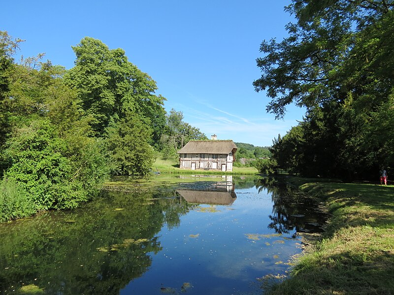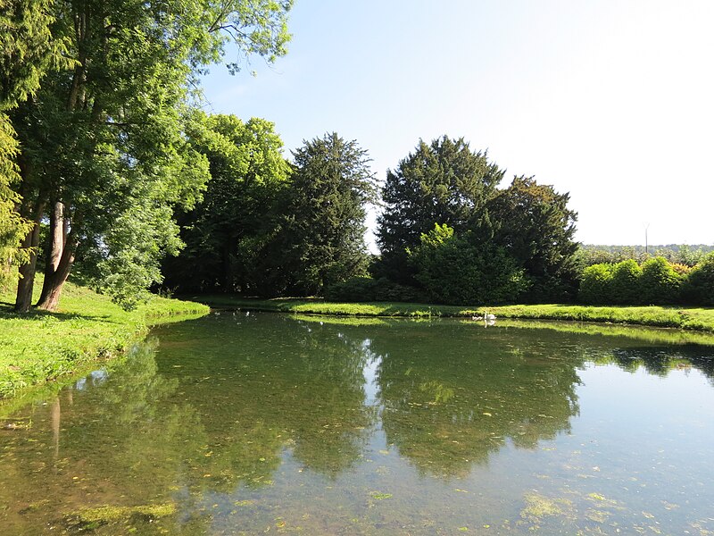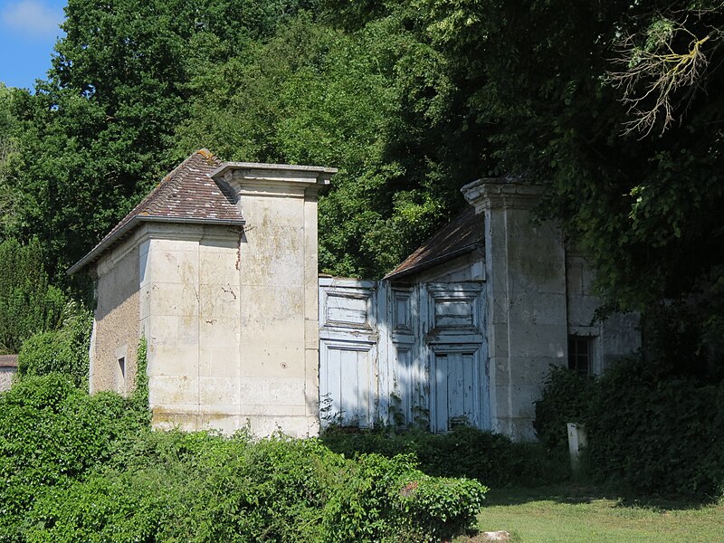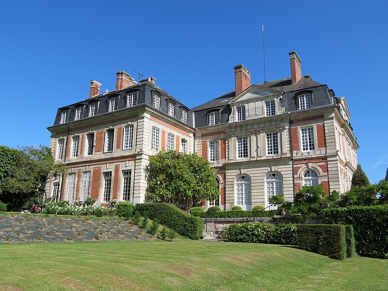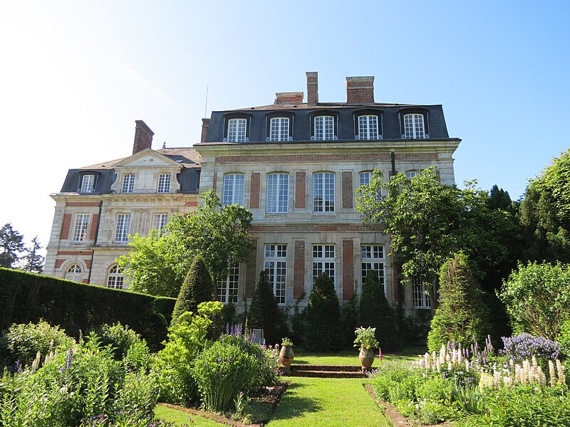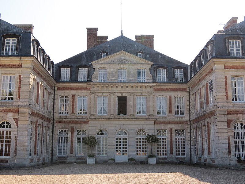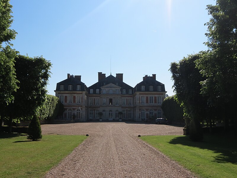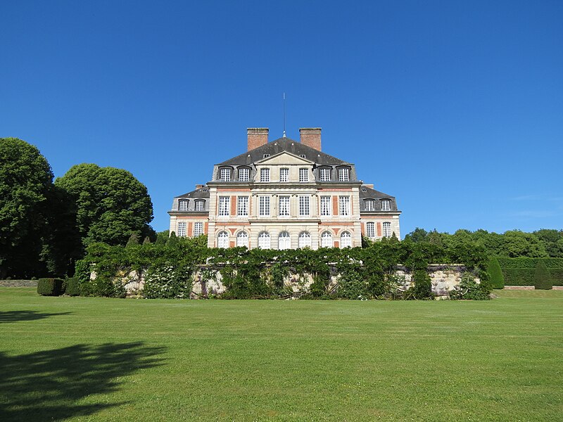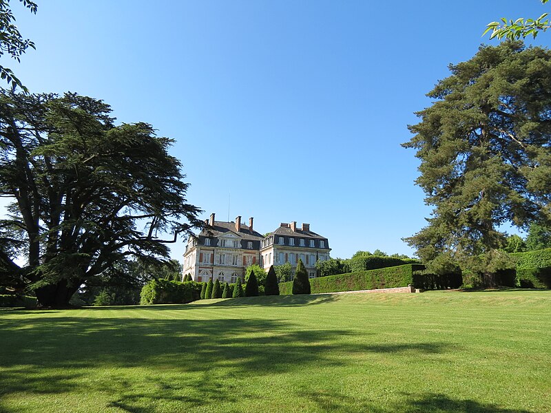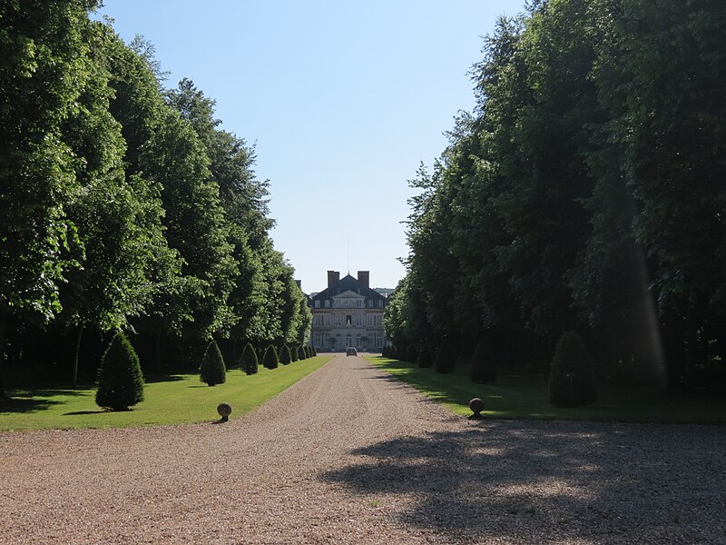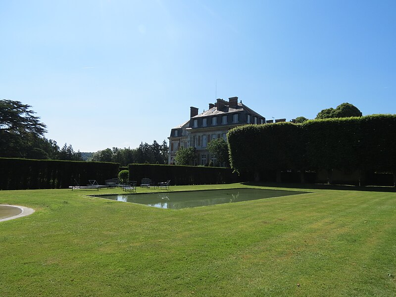 Histoire : le château a été construit entre 1764 et 1769 pour Alexandre Estienne d'Augny, fermier général, et le parc planté de 1764 à 1772. Alexandre d'Augny fit raser l'édifice antérieur et fit édifier l'ensemble des bâtiments du domaine, dont les communs, le manège, les pavillons de conciergerie et le presbytère. Après la Révolution, la propriété passa à Nicolas d'Augny puis à Joseph Pierre de Revilliasc et à Charles de Revilliasc ; la famille Revilliasc conserva le domaine jusqu'à une vente en 1858, suivie d'une revente en 1869. Le parc a connu des aménagements au XIXe siècle ; Victor Crombez y créa un étang et des cascades près de la chaumière. Dans les années 1960, le paysagiste anglais Russell Page a redessiné les abords du château en créant pentes douces, jardin d'eau, jardin de fleurs et en restructurant les terrasses, œuvre reprise et poursuivie dans les années 1980 par Louis Benech.