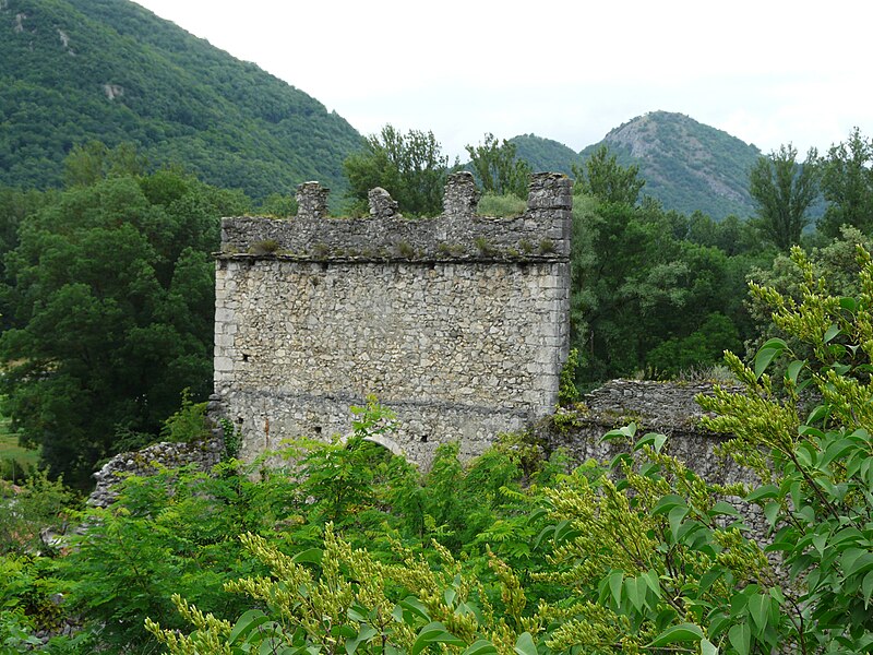 Le village dépendait de la châtellenie de Fronsac et possédait un château fort. Sa construction semble remonter à la fin du XIIIe ou au début du XIVe siècle. Les murailles, en moëllons irréguliers, sont renforcées par des chaînes de blocs de granit appareillés, et des blocs du même type encadrent les meurtrières. Au centre de la façade sud, un mur rectangulaire couronné d’un crénelage domine la courtine, qui se prolonge vers l’est pour aboutir à une poterne. Les autres pans de l’enceinte ont dû servir de carrière pour les habitants du village. Comme la plupart des fortifications pyrénéennes de l’époque, le château ne possédait pas de tour d’angle.