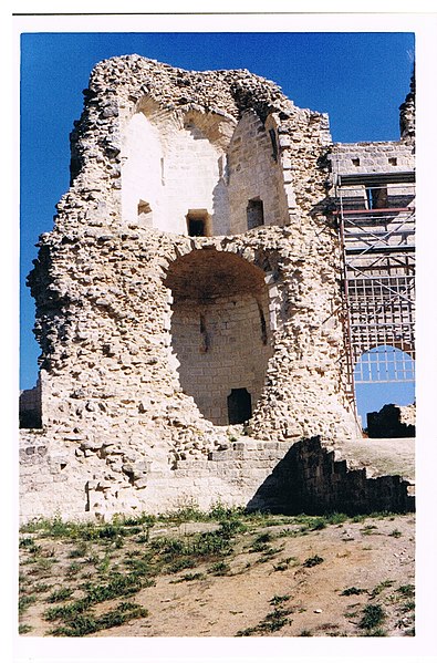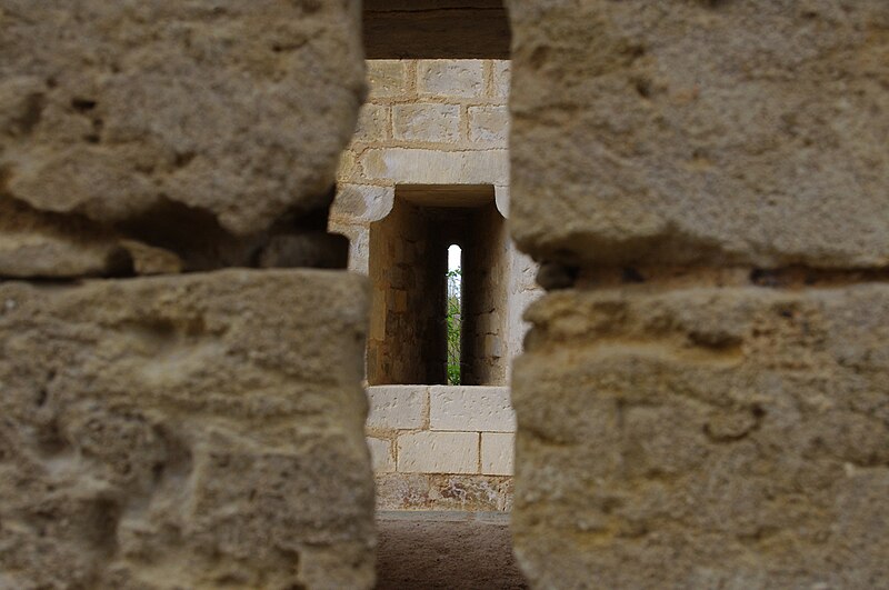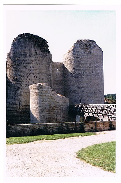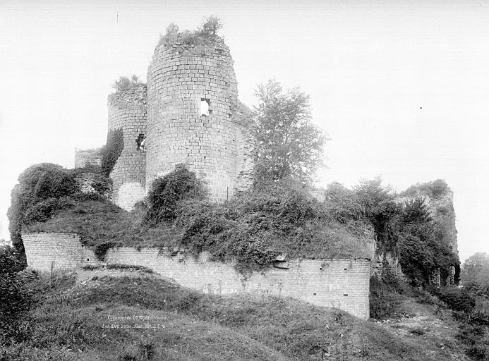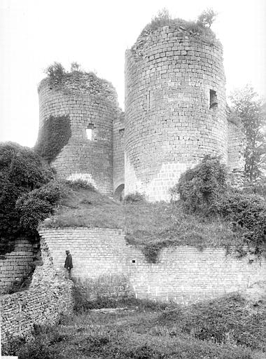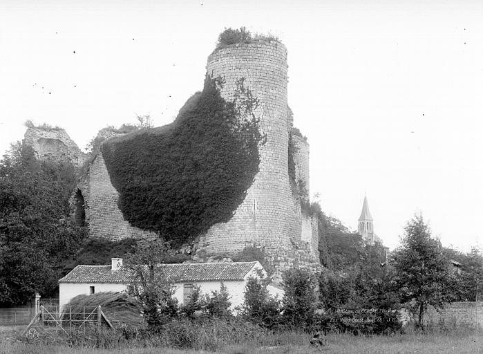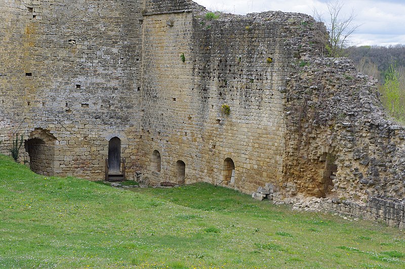 La tour du Moulin, à la pointe ouest, s’élève à 23 mètres pour 9 mètres de diamètre et comprend trois niveaux ; la salle circulaire du rez-de-chaussée, à vocation défensive, est munie de quatre archères et d’une voûte angevine à six nervures décoratives, le premier étage, d’usage résidentiel, possède une cheminée, une latrine et trois archères, tandis que l’étage sommital et l’escalier à vis sont détruits. La courtine nord, la plus endommagée, reliait la tour du Moulin à une tour d’angle disparue au nord-est et était elle aussi flanquée d’une tour demi-cylindrique aujourd’hui disparue ; au niveau de la cour, deux archères voûtées en plein cintre encadrent une poterne. La vaste cour intérieure contenait des bâtiments résidentiels et des structures domestiques — cuisines, puits, celliers, écuries et étables — adossés à la courtine orientale et à l’ouest, près de la tour du Moulin ; il ne subsiste de ces constructions, souvent en matériaux périssables, que des fondations et quelques arases.