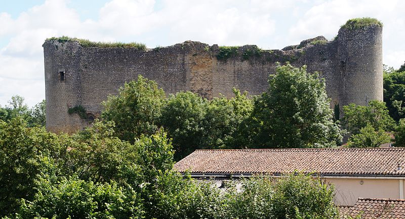 Le château occupe une plate-forme rocheuse triangulaire entourée d’un large fossé sec, au confluent de la Belle et de la Clouère, emplacement stratégique adapté à une forteresse médiévale. L’ensemble suit la forme du plateau et présente trois courtines élevées avec, à chaque angle, une tour circulaire ; la conception privilégiait la défense : châtelet d’entrée, courtines et tours exploitent les qualités naturelles du terrain pour rendre la place difficile à prendre. Le châtelet, à l’extrémité nord de la courtine orientale, mesurait à l’origine 45 mètres de longueur et 16 à 18 mètres de hauteur et comportait quatre tours circulaires, dont deux grandes en fer à cheval et deux plus petites avancées près du fossé ; seule subsiste aujourd’hui la tour sud. Les deux entrées étaient protégées par une herse, des vantaux, sans doute un assommoir et une vingtaine d’archères en étrier triangulaire ; les fouilles ont mis au jour les piles d’un pont dormant, ce qui laisse supposer l’existence d’un pont-levis.