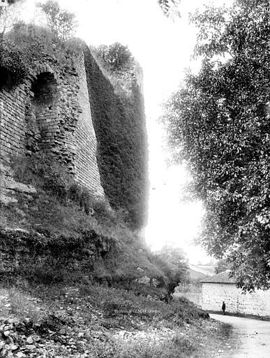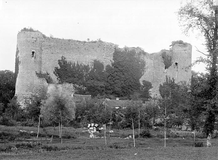 À l’extrémité sud, la tour de la basse-fosse, haute de 24 mètres pour 9,80 mètres de diamètre, comprend quatre niveaux ; le premier renferme la prison seigneuriale, une salle carrée à faible éclairage et dotée de latrines, le rez-de-chaussée de plan hexagonal possède cinq archères et une ouverture centrale permettant de descendre les prisonniers dans la basse-fosse, et le troisième niveau reproduit ce plan avec quatre archères, une cheminée ruinée et une latrine; il ne reste rien du quatrième niveau ni de l’escalier de desserte. La courtine sud, longue de 53 mètres et haute de 20 à 23 mètres, relie la tour de la basse-fosse à la tour du Moulin; son centre était flanqué d’une tour demi-cylindrique aujourd’hui disparue, elle comportait un escalier droit donnant accès à un chemin de ronde disparu, trois archères voûtées en plein cintre et une baie géminée avec corbeaux de hourdage, et son flanc ouest abrite un second accès piétonnier constitué d’un long couloir de 24 mètres protégé par cinq archères et trois portes.