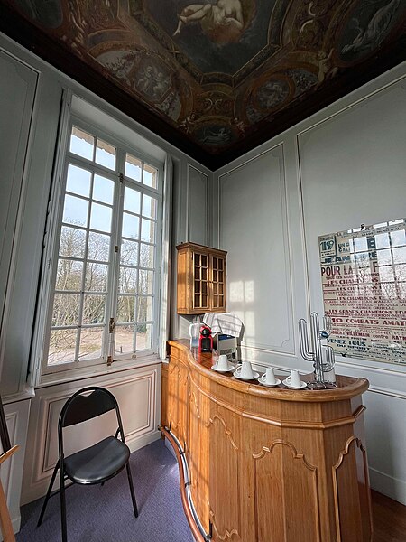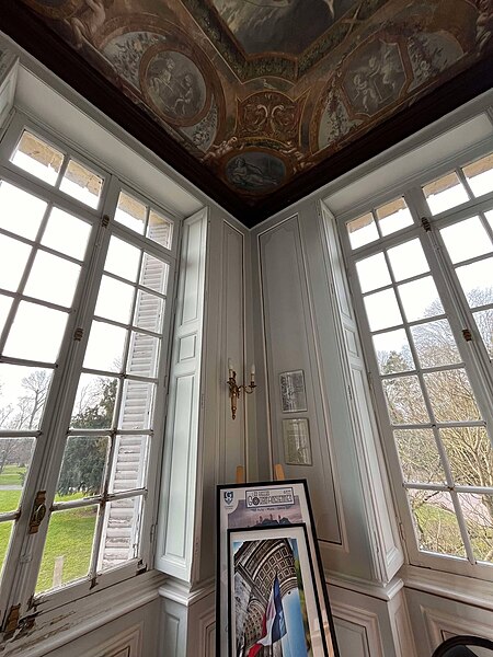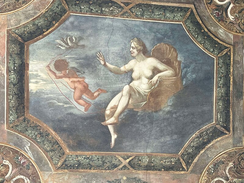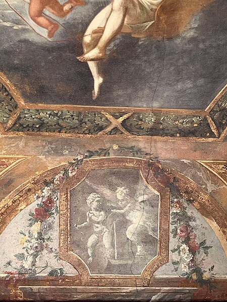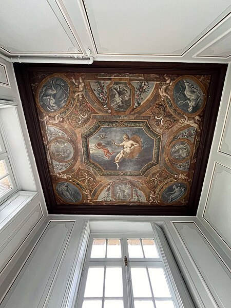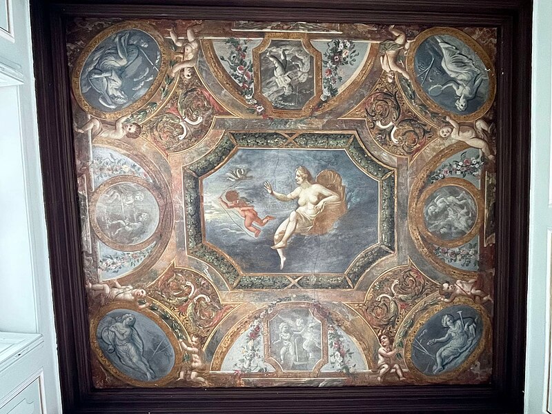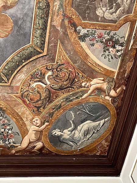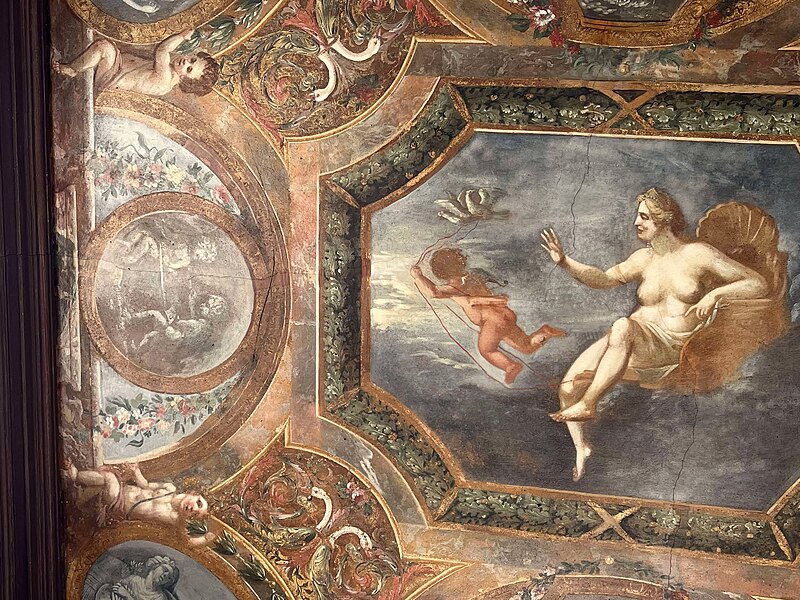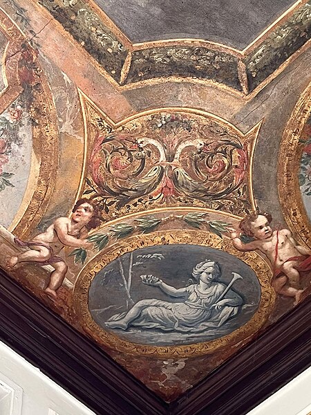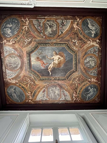 Les intérieurs ont été largement remaniés lors de l'installation des services municipaux à partir des années 1920. Cependant, au premier étage du pavillon sud-ouest, un petit cabinet conserve un plafond peint à la fin du XVIIe siècle représentant Vénus sur son char, entouré de quadri riportati, de rinceaux végétaux et de médaillons en grisaille, bien que ce décor ait apparemment été lourdement restauré.