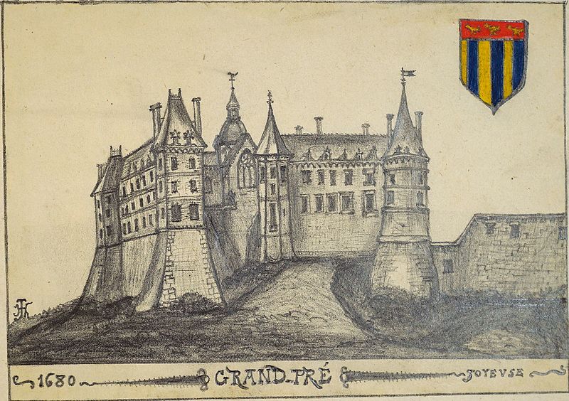 Le château de Grandpré, situé sur la commune de Grandpré dans les Ardennes, conserve des éléments d'une construction entreprise par la famille de Joyeuse à la fin du XVIe et au début du XVIIe siècle. Installé sur le versant nord de la vallée de l'Aire, il contrôlait la Trouée de Grandpré, un des rares passages à travers la forêt d'Argonne que le général Dumouriez a comparé aux Thermopyles lors des manœuvres précédant Valmy. L'élément le plus remarquable est la tour-porte dite de la Justice, placée le long d'une petite route en pente vers la colline. La porte s'inscrit dans des façades en briques rythmées par des chaînages harpés en calcaire local jaunâtre. Au centre, le porche est surmonté d'un fronton à volutes soutenu par deux colonnes torses posées sur des bases sculptées et ornées de feuillages, qui portent une corniche et un tableau nu flanqué de petites volutes. Au-dessus de la porte charretière, une large fenêtre à meneaux croisés éclaire l'étage. À la naissance du comble à toit à la française se distinguent trois bretèches, chacune portée par trois consoles et couronnée d'un fronton rehaussé de boules, de modillons et de volutes ; elles devaient défendre la porte charretière, les portes piétonnes latérales et la fenêtre. La grande arcade charretière en plein cintre est encadrée par deux portes piétonnes également en plein cintre, et l'ensemble de l'entrée, daté de 1618, relève d'un style Louis XIII baroque. Les deux pavillons qui encadrent la porte étaient des communs longs et étroits, percés de rares petites ouvertures et dotés, à chaque angle, d'une échauguette carrée reposant sur trois moulures en ressaut. La petitesse des fenêtres, la présence des bretèches et quelques petites canonnières témoignent d'une préoccupation défensive plutôt symbolique, destinée à prévenir coups de main ou vols et à permettre l'usage d'armes à feu individuelles. Les trois passages à travers la tour-porte sont surmontés d'élégantes arcatures à croisées d'ogives portées par des piliers ; côté cour, le triple portail subsiste tandis que trois lucarnes à fronton coupé remplacent les bretèches. Une forteresse féodale précédente se trouvait au nord de la ville, sur le site appelé Notre-Dame de Châtelet ou Châtel ; sa garnison ayant commis des exactions, le château primitif fut détruit en 1441 sur ordre de Charles VII. Les travaux de la reconstruction menés par les Joyeuse furent achevés par Claude de Joyeuse, dont le mausolée se trouve dans l'église Saint-Médard ; c'est à lui que l'on attribue la construction de la porte de la Justice. En 1791, le château devint la propriété du marquis de Sémonville ; en 1792 il hébergea pendant une dizaine de jours le général Dumouriez et subit ensuite des dégâts causés par l'armée prussienne et les émigrés. Restauré en 1796 par Charles-Louis Huguet de Sémonville, il fut le lieu en 1799 du mariage du général Joubert avec Félicité Françoise de Montholon-Sémonville. Un incendie nocturne du 13 novembre 1834 détruisit une grande partie de l'édifice, à l'exception de la Porte de la Justice et des dépendances ; le domaine fut vendu en 1839 et reconstruit par la famille Babled sur un plan réduit et simplifié. La Première Guerre mondiale causa de nouveau d'importants dommages ; le château fut relevé dans les années 1920, avec quelques simplifications stylistiques par rapport à la reconstruction du milieu du XIXe siècle. Les bâtiments actuels ont été classés au titre des monuments historiques en 1921.