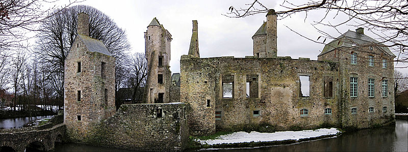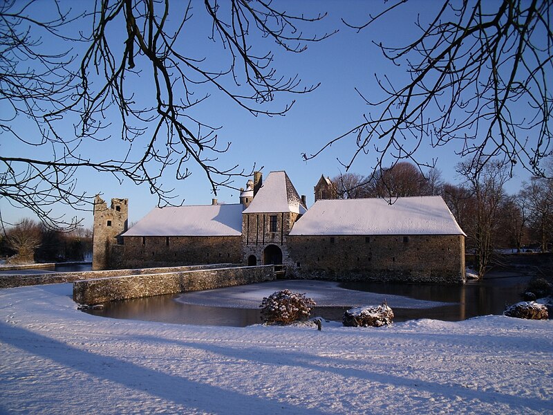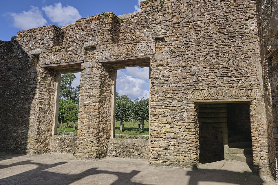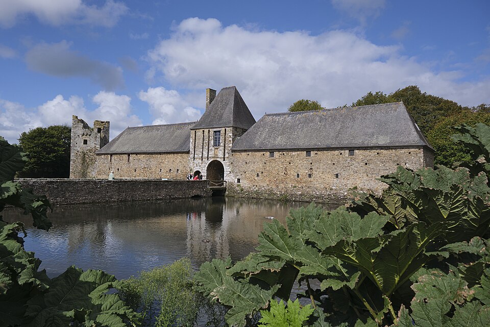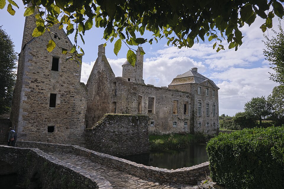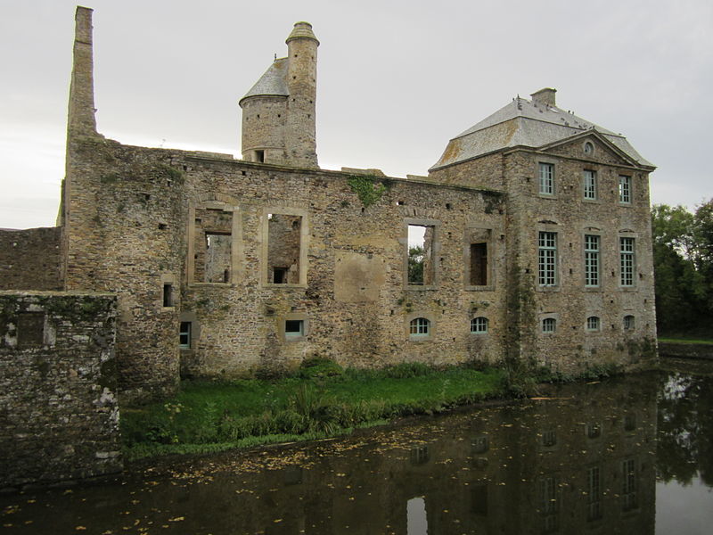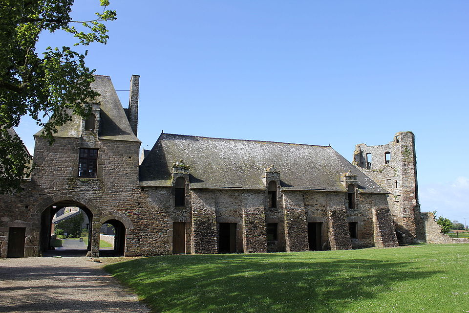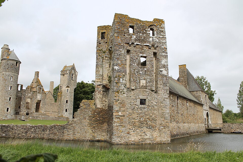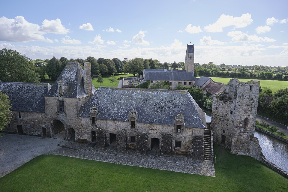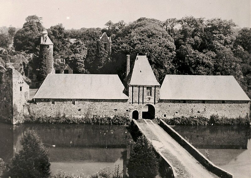 L'accès à la cour se faisait par une poterne équipée d'une porte piétonne et d'une porte charretière, chacune pourvue d'un pont-levis dont les rainures sont encore visibles ; à l'ouest, une tour d'angle, ancienne entrée du château, comporte une porte murée. Un petit pont à quatre arches franchissait les douves pour donner accès au jardin à la française qui s'étendait à l'arrière du château. Les communs, deux bâtiments rectangulaires du XVIe siècle encadrant la poterne, ont été conservés ; l'un abrite une exposition permanente sur l'histoire du site et ils servent encore pour des manifestations culturelles.
