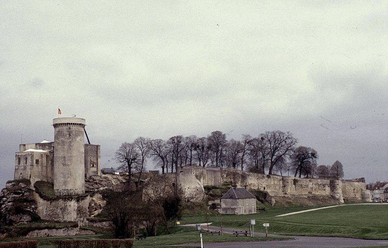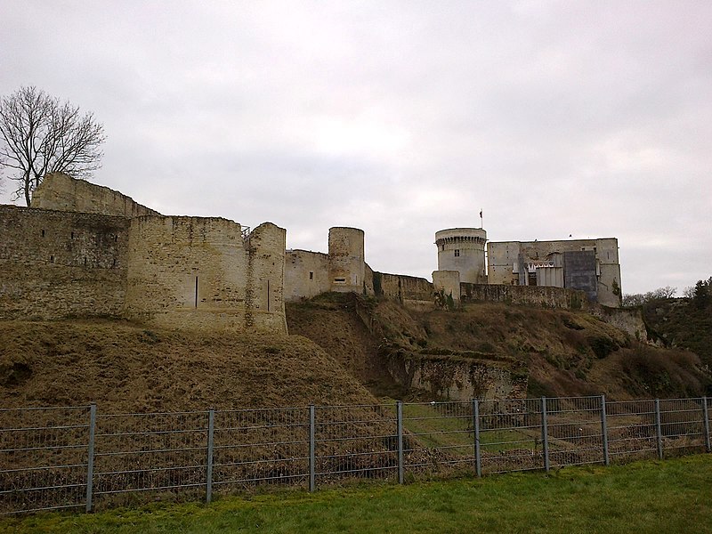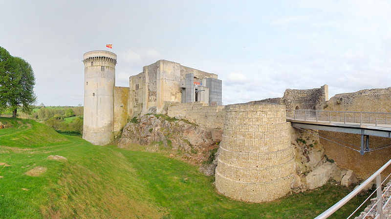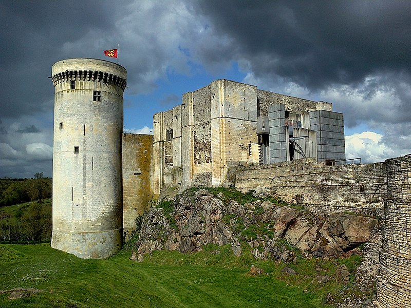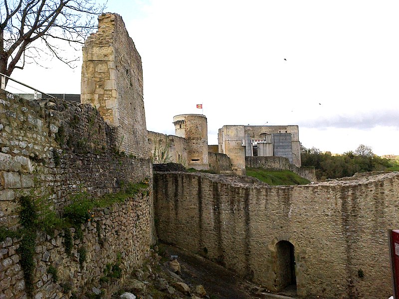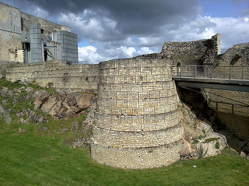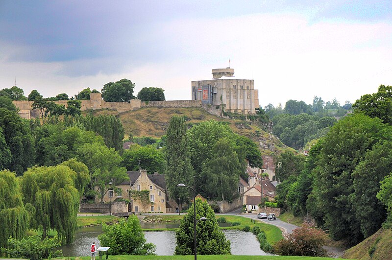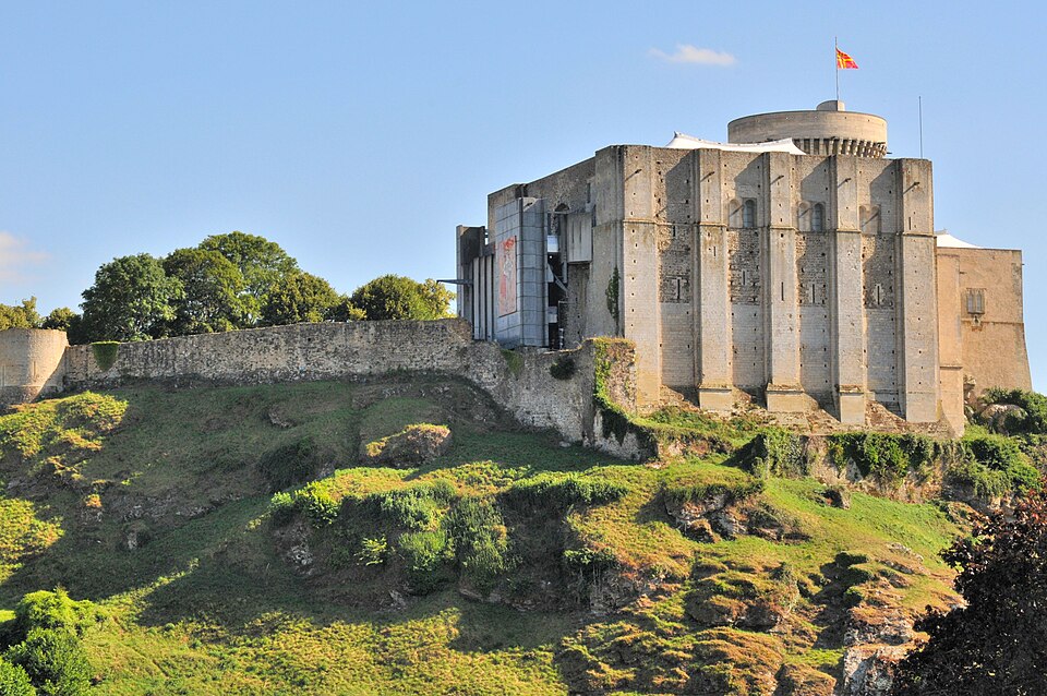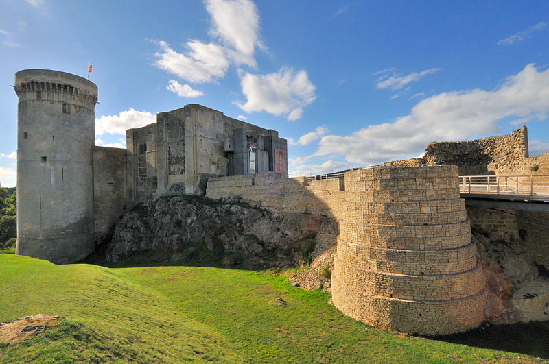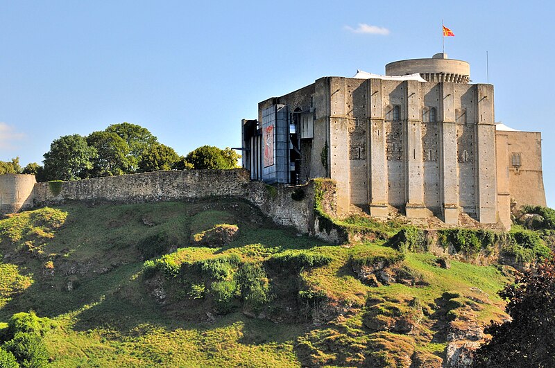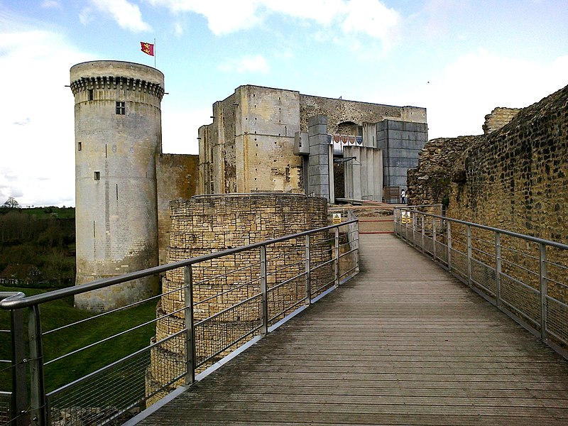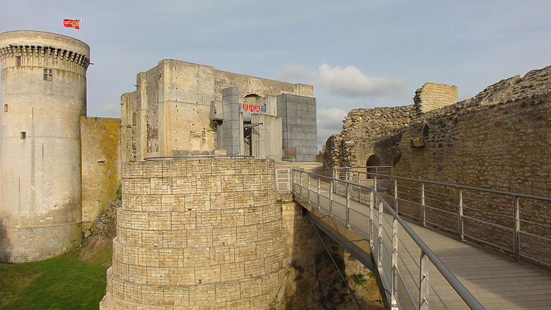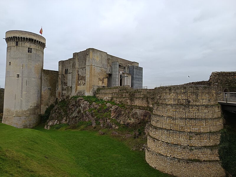 Le château Guillaume-le-Conquérant, perché sur un éperon schisteux dominant la cluse de l'Ante à Falaise (Calvados), est un ancien château fort célèbre comme lieu de naissance de Guillaume le Conquérant et comme résidence princière. Propriété de la commune, il est classé au titre des monuments historiques (liste de 1840). Les premières fortifications en pierre datent du Xe siècle ; les vestiges visibles relèvent surtout des XIIe, XIIIe et XVe siècles. Au XIe siècle une enceinte maçonnée fut établie, puis Henri Ier Beauclerc fit ériger vers 1123 un grand donjon-palais quadrangulaire de tradition anglo-normande. Ce grand donjon repose sur des fondations antérieures, mesure 26,60 m de long sur 22,80 m de large, s'élève à 22 m et présente des murs de 3,15 à 3,50 m d'épaisseur, des contreforts et un accès volontairement difficile. L'organisation intérieure combine fonctions résidentielles et défensives : la grande salle, la chambre seigneuriale et une chapelle palatiale dédiée à saint Prix occupaient l'étage ducale, l'étage supérieur abritait la garnison et la toiture servait de poste de guet. Un second donjon quadrangulaire, dit « petit donjon », ajouté au XIIe siècle, offre environ 14 m sur 10 m pour 14 m de hauteur ; il est davantage domestique, communique avec la grande salle et comporte de grandes baies, une cheminée ornée et une tourelle attenante dont la fonction reste incertaine. Vers 1207, après l'annexion de la Normandie par le roi de France, la tour Talbot, de plan circulaire et strictement défensive, fut élevée ; elle a 15 m de diamètre, 30 m de hauteur et des murs d'environ 4 m d'épaisseur. L'ensemble est complété par une enceinte du XIIIe siècle, d'environ 600 m de périmètre et flanquée d'une quinzaine de tours, précédée autrefois d'étangs défensifs ; l'esplanade accueillait autrefois la chapelle, le logis du gouverneur, des casernes, des ateliers et des écuries. Le château a servi de place forte, de prison d'État et de résidence ; il connut plusieurs sièges pendant la guerre de Cent Ans et les conflits ultérieurs. Abandonné au XVIIe siècle, il fut utilisé comme carrière de pierre et ses étages supérieurs furent arasés ; un collège occupa la basse-cour à partir de 1809 jusqu'à la destruction de certains bâtiments et de la chapelle romane Saint-Nicolas lors des combats de 1944. À partir de 1864 l'architecte Victor Ruprich-Robert mena des travaux de restauration qui contribuèrent à sauver les donjons. Des aménagements destinés au public furent réalisés entre 1987 et 1997 sous la conduite de Bruno Decaris, qui ajouta un avant-corps contemporain abritant un escalier et une réplique de pont-levis, choix ayant suscité des controverses et des procédures judiciaires. Depuis la fin des années 2000 l'enceinte a été restaurée pour restituer l'aspect défensif du site et, en 2013, une nouvelle scénographie a introduit des tablettes HistoPad et des lunettes stéréoscopiques HistoCam permettant de superposer reconstitutions médiévales et vues actuelles. Les donjons, lisibles dans leurs volumes et leurs dispositifs, témoignent des différentes étapes de l'architecture castrale et des usages successifs du lieu. Le château est aujourd'hui ouvert à la visite.