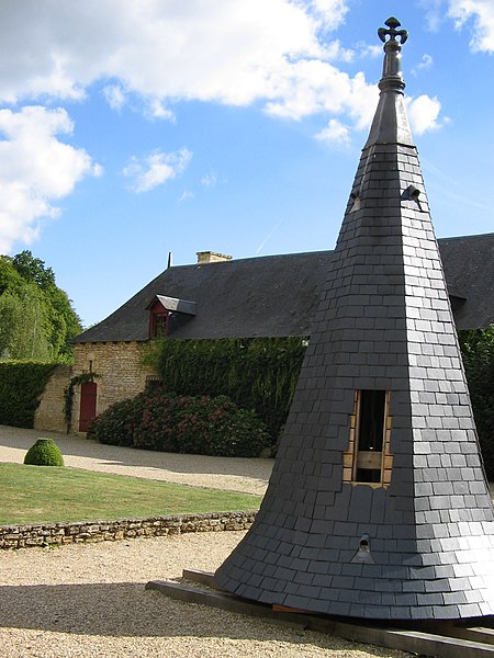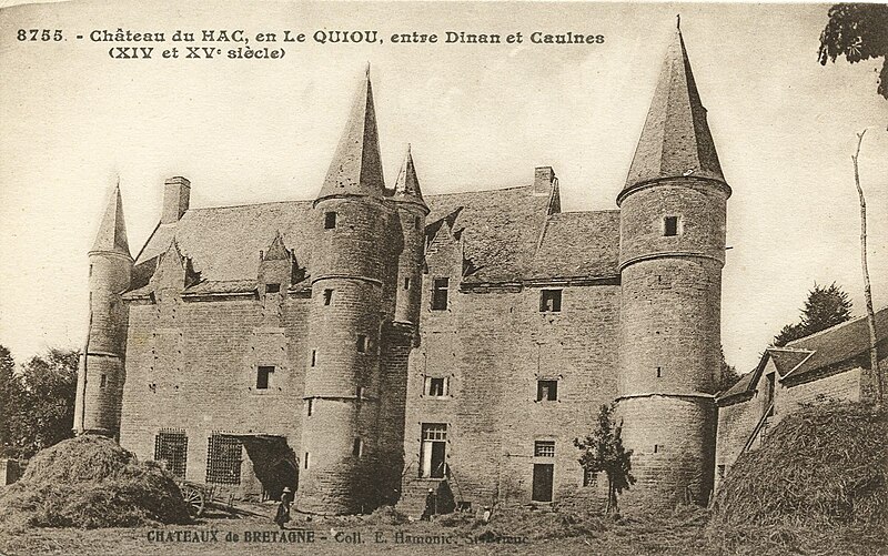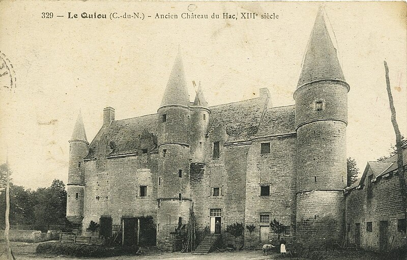 Le château du Hac, situé sur la commune du Quiou au sud de Dinan (Côtes-d'Armor), est un édifice du XVe siècle formé de deux corps de bâtiment d'époques différentes. Le grand logis occidental a été édifié pour Jean Hingant entre 1440 et 1448, tandis que la partie orientale repose sur les fondations d'un édifice antérieur, parfois décrit comme une « maison-tour » ou issu d'un manoir du XIVe siècle dont les vestiges subsistent. Construite en pierre de taille de calcaire des faluns, l'architecture a peu été modifiée en façade et conserve des dispositions intérieures de type français propres aux réalisations ducales, ainsi que des décors et éléments anciens de qualité. Le domaine a appartenu successivement à plusieurs familles, dont les Hingant, Tournemine et Rieux ; il fut vendu en 1686 à la famille de Lopriac puis en 1770 à Yves Reslou de la Tisonnais. Au cours du XVIIe siècle, des travaux importants ont touché la charpente et les fenêtres : la charpente du toit principal a été largement refaite à la fin du XVIIe siècle (années 1684-1686) et les baies du premier étage furent agrandies. Le logis a ensuite été transformé en métairie, et des photographies de la fin du XIXe siècle montrent des étages convertis en greniers avec de grandes fenêtres obturées ou réduites. Inscrit à l'Inventaire supplémentaire des monuments historiques en 1926, le château a fait l'objet d'une restauration importante conduite par la famille Paillard entre 1927 et 1936, intervention parfois jugée regrettable pour certaines parties de l'intérieur. Des jardins de style médiéval ont été créés au nord du logis entre 1980 et 1990. Ouvert au public depuis 1984, l'édifice a fait l'objet d'études et de diagnostics des peintures et du mobilier en 1997. Il a été classé au titre des monuments historiques en septembre 1993 et ses abords ont été inscrits en février 2012. Des travaux récents ont repris la restauration : en 2010 les façades ont été restaurées avec restitution des menuiseries et mise en valeur des vitraux, et la restauration intérieure — d'une surface déclarée de 699 m² — a porté sur la consolidation des planchers et des décors peints, sous la maîtrise d'un architecte en chef des Monuments historiques. Le château présente par ailleurs six tourelles, dont quatre de diamètres inégaux, qui participent à son profil caractéristique de l'âge d'or du duché de Bretagne.