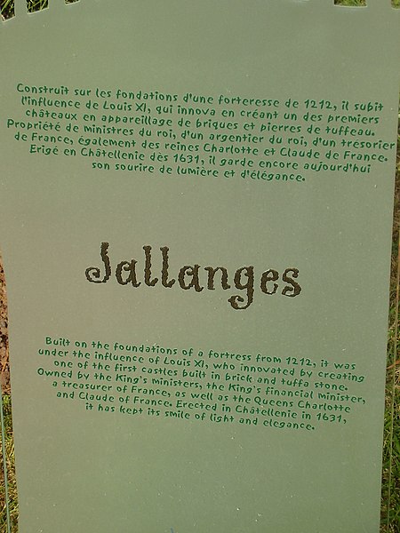 Le château de Jallanges, situé à Vernou-sur-Brenne sur le vignoble de Vouvray (Indre-et-Loire, Centre-Val de Loire), est un monument privé habité par ses propriétaires. Ancien fief relevant du château d'Amboise, il fut érigé en châtellenie en 1631. Construit sur les fondations d'une forteresse du XIe siècle, l'édifice actuel date de la fin du XVe siècle et fut agrandi au XVIe siècle. L'aile orientale des communs date de 1765 et fut remaniée vers 1850. Il est indiqué qu'il fut bâti en 1465 par Louis XI pour ses argentiers, qui y installa son argentier. Le château présente un appareil mêlant brique et pierre de taille caractéristique de l'époque. L'édifice comprend un corps de logis du XVe siècle éclairé par des lucarnes à gâbles garnis de crochets et amortis par des fleurons. La façade principale est flanquée d'une tour d'escalier polygonale, couronnée par un étage carré. Le bâtiment central fut prolongé au XVIe siècle à l'est et à l'ouest par deux constructions, et le bâtiment ouest fut relié à une aile de communs du XVIe siècle par un corps de logis. Cette aile comporte une large porte en arc surbaissé, encadrée de pilastres sculptés, ouverte dans un pavillon en saillie qui donne accès à la cour des communs, limitée à l'est par l'aile de 1765. Aux angles sud-est, nord-est et nord-ouest des communs subsistent des tourelles du XVIe siècle. À l'angle nord-ouest de la cour d'honneur se trouve une chapelle du XVIIe siècle. Une tour d'échauguette du XVIe siècle subsiste à la porte sud du parc. Le site comprend un parc planté de cèdres séculaires, une roseraie de plus de 2 000 rosiers répartis en 219 variétés, un jardin à la française de la Renaissance et une galerie dite "banneret" ornée de sept fresques en trompe-l'œil consacrées à la Loire et aux jardins de la Renaissance. Le château a appartenu successivement à René du Perray (1213), Jean Gaudin (1462), Thomas de Saint-Paul (1474), Robert le Hodan (1485), Nicolas Gaudin (argentier, 1503), puis à Jean Ruzé, Guillaume Barthélemy, Philibert Babou (1520), François de Blanchefort (1522), Michel de Bouillon (1552), Françoise Bertherault (1575), François de Bouillon (1617), Jean le Royer (1629), Denis le Royer (1640), Jean de Mons (1643), René Peyrat (1648), Françoise d'Esperonnet (1663), Nicolas Lefebvre (1672), Claude Lefebvre de La Faluère (1696), Claude-Pierre Lefebvre (1732), Claude-Pierre Lefebvre de La Faluère (1748) et Pierre-Claude Lefebvre de La Faluère, avant d'être vendu comme bien national le 28 avril 1798. L'édifice est inscrit au titre des monuments historiques depuis le 22 juin 1946. Propriété privée et habitée, il a été racheté en 1984 par la famille Ferry-Balin, restauré et ouvert à la visite la même année.