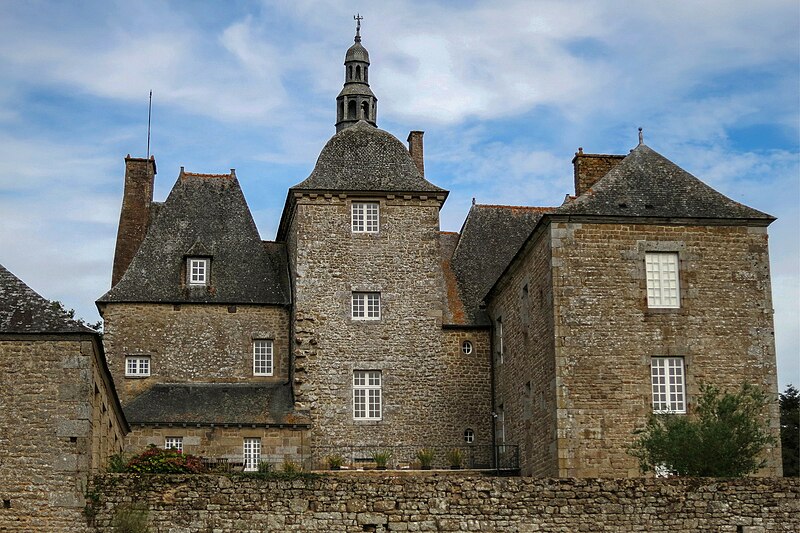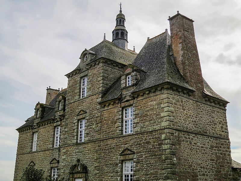 Construite en granit, la demeure repose sur un soubassement qui la surélève par rapport à la cour d'honneur côté est. Un escalier à doubles volées en U conduit à la porte d'entrée percée dans un haut corps central coiffé d'un toit en carène à quatre pans, lui-même surmonté d'un double lanternon. Deux pavillons de longueurs inégales forment les ailes. Les fenêtres sont surmontées de frontons triangulaires, tandis que les lucarnes en arc-de-cercle percent la toiture. Les chaînes d'angle et les encadrements des ouvertures présentent un bossage à chanfrein. La cour est bordée d'une balustrade en surplomb sur le parc. La façade ouest se compose de plusieurs corps de bâtiment sans décor.