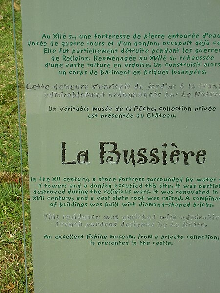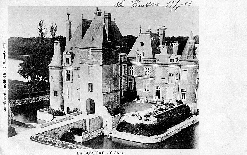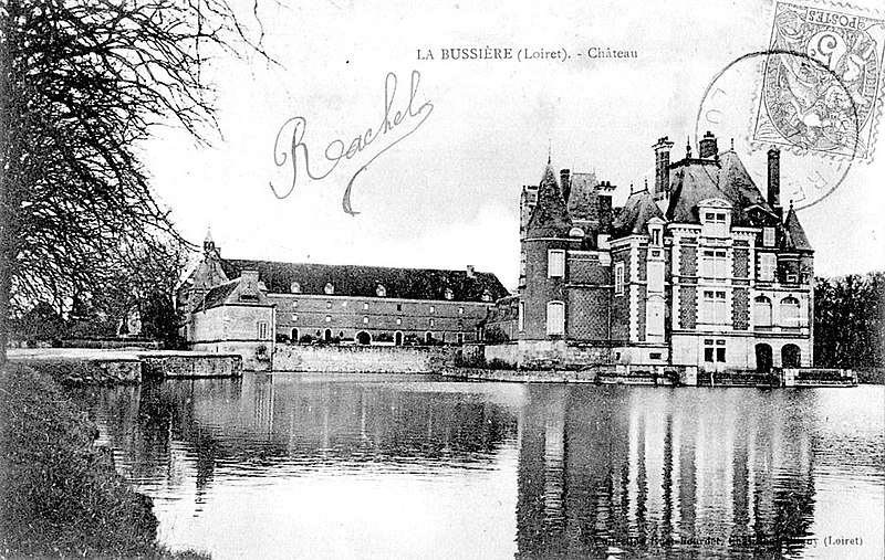 Le château de La Bussière, situé dans le Loiret, s’élève au bord d’un vaste étang qui a longtemps servi de vivier pour la seigneurie. Le plus ancien propriétaire connu est Étienne de Feins, cité en 1204, et la forme générale du plan du château, avec ses tours aux quatre angles, renvoie à son organisation médiévale. Le corps de logis, d’origine médiévale, a été reconstruit vers le milieu du XVIe siècle ; de cette campagne subsistent les trois premiers niveaux du châtelet d’entrée. Les destructions provoquées par les Protestants pendant les guerres de Religion entraînèrent une nouvelle campagne de travaux vers 1600 portant à la fois sur l’habitation et les communs. Sous la famille du Tillet, aux XVIe et XVIIe siècles, les principaux bâtiments furent remaniés et les communs reconstruits ; Jean II du Tillet rassembla et agrandit les terres, créant un parc d’environ 60 hectares. Pour faire face aux progrès de l’artillerie, des aménagements défensifs furent réalisés à la fin du Moyen Âge et à la Renaissance : murs épaissis, voûtes maçonnées et ouvertures de tir subsistent sur certains vestiges. Au début du XVIIIe siècle, une façade du corps de logis fut transformée et deux pavillons d’entrée, assortis d’une grille, marquèrent l’accès au jardin. Le parc fut réorganisé et l’étang recreusé et régularisé sur un plan rectangulaire d’environ six hectares, tandis que des allées rectilignes dessinaient la perspective du domaine. Le XIXe siècle apporta d’importantes transformations intérieures et l’adjonction d’un bâtiment côté étang accueillant lingerie, véranda, vestibule et salon de billard ; les douves entourant les communs furent asséchées. La tour dite Alphonse fut élevée en 1853–1854 par l’architecte Pacault, et des travaux de restauration et de décoration furent conduits au cours du siècle par l’architecte Arthur Froelicher. En 1912, René-Édouard André intervint pour réaménager le parc et le potager, remplaçant le jardin à l’anglaise par une composition à la française plus strictement cadrée. La famille de Chasseval acquit le domaine au début du XIXe siècle et le conserva pendant plus d’un siècle, en réalisant successifs aménagements et restaurations. Henri et Geneviève de Chasseval ouvrirent le château au public le 22 avril 1962, y installèrent une importante collection consacrée à la pêche en eau douce et aménagèrent des aquariums dans les caves. Le musée présente l’évolution des pratiques et du matériel de pêche — cannes, moulinets, appâts et mouches artificielles — ainsi que des objets ethnographiques et artistiques liés au poisson. Parmi les pièces remarquables figure un cœlacanthe conservé depuis sa capture en 1976, exposé en aquarium de formol, ainsi que des fossiles et de nombreuses représentations du poisson dans l’art. La collection comprend également estampes japonaises, hameçons océaniens, vitrines des Expositions universelles et pièces inspirées par Bernard Palissy. Le potager, organisé selon un plan caractéristique du XVIIIe siècle en six grands carrés autour d’une allée centrale bordée d’arbres palissés, conserve des serres du XIXe siècle et des aménagements contemporains ; il est entretenu par une équipe permanente et a reçu le label Jardin remarquable en 2004. Des essais de permaculture ont été lancés en 2014 pour diversifier les modes de culture. Après 2012, les propriétaires Bertrand et Laure Bommelaer ont entrepris des travaux de restauration des toitures et charpentes, soutenus par des aides publiques et des mécénats privés. Le château est inscrit aux Monuments historiques depuis 1993 et classé depuis 1995. Aujourd’hui le site associe la visite du château et de ses collections sur la pêche, la promenade dans le parc et le potager, des salles de réception et des chambres d’hôtes aménagées dans les bâtiments.