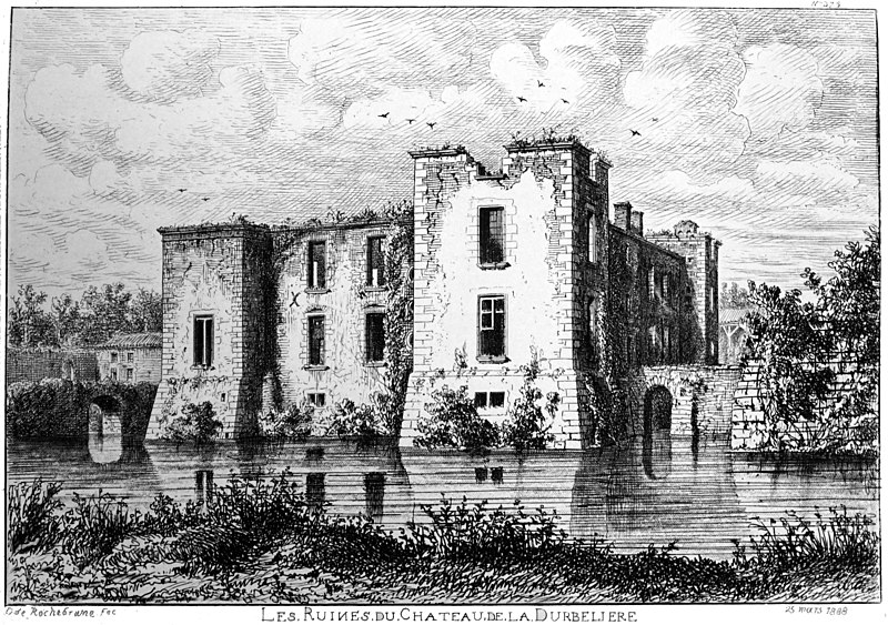 La propriété de la Durbelière se situe à Saint-Aubin-de-Baubigné, commune associée à Mauléon, dans les Deux-Sèvres. Le premier château a été édifié à la fin du XVe siècle et remanié au début du XVIIe siècle puis au XVIIIe siècle. Il a été transmis à la famille du Vergier de la Rochejaquelin et a été le lieu de naissance d'Henri de La Rochejaquelein en 1772, général de l'armée catholique et royale pendant les guerres de Vendée. Le château fut incendié à cinq reprises entre 1793 et 1794 et se trouve aujourd'hui en ruines. Les vestiges avaient été inscrits le 26 octobre 1927 ; les communs et les sols ont été inscrits le 15 octobre 1993, puis l'ensemble a été classé monument historique le 8 janvier 1996, ainsi que les douves, le pigeonnier, les murs de clôture et l'étang. Depuis le 8 septembre 2023, le site appartient à la commune de Mauléon et il est entretenu et animé par l'association La Durbelière. Parmi les vestiges subsistent les douves et les communs, dont le pigeonnier, qui se dégradent progressivement. Le château comporte des souterrains qui, selon la légende, communiquaient avec l'église de Saint-Aubin-de-Baubigné ; ces galeries ont été condamnées. Une maquette reconstituant l'aspect du château avant sa destruction est conservée à la mairie de Saint-Aubin-de-Baubigné. Des documents et images historiques présentent notamment des vues du XIXe siècle, la tour et les douves, ainsi que l'entrée du domaine.