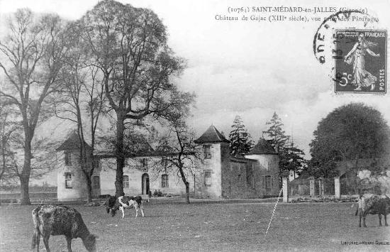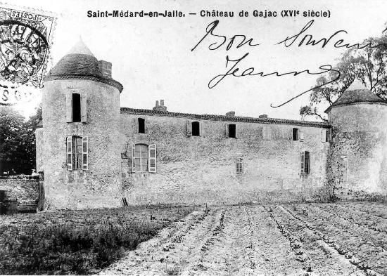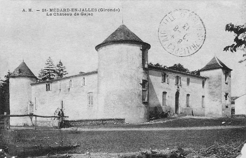 Le château de Gajac, ou château de la Mothe-Gajac, se situe à Saint-Médard-en-Jalles (Gironde), près de l'intersection de l'avenue Descartes et de la rue Charles-Daumel. Édifié au XIVe ou au XVe siècle, il a été acquis au milieu du XVIe siècle par Pierre Eyquem (Ayquem) de Montaigne, oncle de l'écrivain, et est resté dans la famille jusqu'à la Révolution. Le château, de plan quadrangulaire, est flanqué de quatre tours d'angle — trois rondes et une carrée qui abrite la chapelle — et entouré de douves en eau sur trois côtés ; un petit pont enjambe le fossé ouest et l'entrée principale se situe au centre de la face est, accessible autrefois par une allée devenue la rue Alfred de Musset. Modifié aux XVIIe et XVIIIe siècles, il fut attaqué pendant les guerres de Religion et vendu comme bien national pendant la Révolution après que ses propriétaires aient été portés sur la liste des émigrés. Le docteur Arnaud Alcide Castaing nota en 1946 que les adjonctions du XVIIIe siècle avaient changé l'aspect du château, mais que les effondrements dus aux bombardements d'avril-mai 1944 avaient mis au jour des murailles médiévales et révélé, entre deux murs doublés, une voûte formant une galerie au rez-de-chaussée et un chemin de ronde donnant accès au premier étage des tours. Selon cette description, chaque tour comportait au rez-de-chaussée une pièce voûtée en pierre et, au-dessus, une pièce couverte d'une charpente en bois. En 2015, la tour carrée présentait une couverture à quatre pans surmontée d'un motif en forme d'oiseau aux ailes déployées, la tour nord-ouest une couverture conique récente, la tour sud-ouest une toiture à neuf secteurs et la tour sud-est restait découverte ; une couverture distincte à quatre pans couronne l'entrée. La chapelle, placée à l'extrémité des bâtiments et accessible par une petite cour fermée, était jugée en bon état et ornée de plusieurs tableaux lors d'une visite du vicaire général Camiran en 1787, qui recommanda le renouvellement de la permission d'usage. Implanté peut-être sur une motte castrale, l'ensemble occupe une position qui permettait de surveiller la rive droite de la Jalle près du grand chemin de Bordeaux à Lacanau ; la première mention du site remonte à 1289, mais le bâtiment actuel a été reconstruit après la guerre de Cent Ans. Le monument a changé de mains à plusieurs reprises : il apparaît successivement lié à des familles et seigneurs nommés dans les sources des XIVe au XVIe siècles, puis est acquis par Mme de Basterot en 1786 avant d'être confisqué et vendu comme bien national à la Révolution. En 1943, un blockhaus fut construit devant le château. Classé progressivement, il a d'abord vu ses façades et toitures inscrites en 1988 (à l'exclusion des toitures des tours), puis la totalité du château, y compris le pont, la terrasse et l'emprise des douves, a été inscrite aux monuments historiques par arrêté de 2013, qui a abrogé l'arrêté de 1988. Aujourd'hui, bien que peu mis en valeur et enserré par des lotissements et un centre commercial, il demeure l'un des rares châteaux forts subsistants dans la région bordelaise.