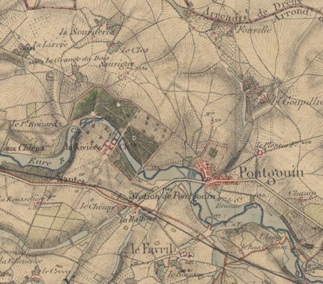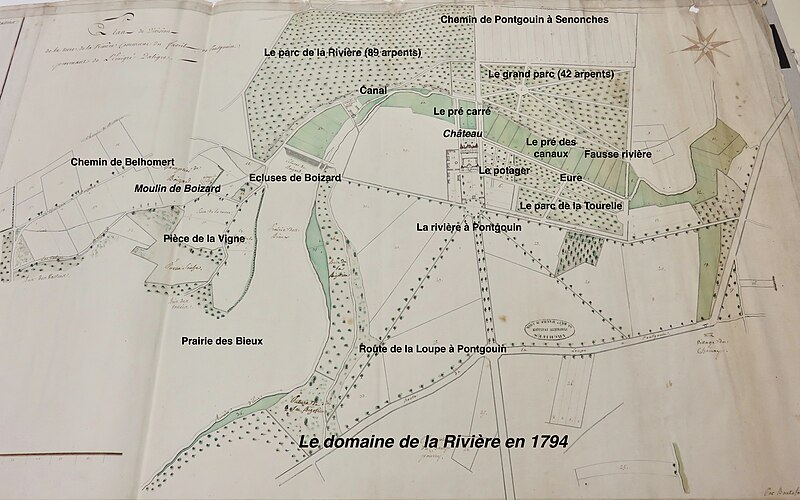 Le château de la Rivière, à Pontgouin (Eure-et-Loir), a été élevé au début du XVIIe siècle et est resté pendant trois siècles la propriété de la famille d'Aligre, jusqu'au décès en 1926 de Marie Charlotte de Préaulx, marquise d'Aligre. La seigneurie fut acquise par Raoul d'Aligre ; son fils Étienne, devenu garde des sceaux en 1624 puis démis en 1626 sur ordre de Richelieu, s'exila à La Rivière où il acheva la construction du corps central. L'édifice conserve une allure encore médiévale et a été bâti avec des matériaux locaux traditionnels ; les entourages de fenêtres, jambages et linteaux du rez-de-chaussée alternent brique et grison. Des inscriptions datées, 1628 sur la tour d'angle ouest et 1629 sur le pavillon du pont-levis, permettent de situer chronologiquement les parties occidentales. Le plan associe un corps de logis principal prolongé par deux ailes, des pavillons étroits adossés à des tours cylindriques et de grosses tours aux angles extérieurs. Le château s'élève au fond d'une vaste cour d'honneur entourée de longs communs symétriques, couverts de toitures en croupe et éclairés par des lucarnes en briques à fronton triangulaire. L'accès conserve une première porte en grison et brique et une porte piétonne latérale ; plus en avant se trouve le châtelet d'entrée encadré de dépendances et précédé de douves sèches, les ponts-levis ayant aujourd'hui disparu. Le pigeonnier, construit au XVIIe siècle, comporte 940 boulins, en lien avec l'étendue des terres détenues alors par la famille. Les pièces sont majoritairement traversantes au rez-de-chaussée comme à l'étage, et les combles sont éclairés par des lucarnes. Côté parc, le château repose sur une plate-forme qui s'ouvre sur un parterre formé de quatre carrés visibles sur le plan de 1794. L'Eure a été canalisée par un système de canaux en partie en terre permettant d'alimenter le moulin de la Rivière et de créer les écluses de Boizard, aménagements liés au grand projet d'alimentation en eau des jardins de Versailles. Étienne III d'Aligre poursuivit l'embellissement et fit creuser des canaux importants à partir de 1637 ; des maîtres maçons comme Pierre Hébert réalisèrent pavillons, tours et dépendances, la façade atteignant 66 mètres de long. Aux XVIIIe et XIXe siècles le parc fut agrandi et réorganisé en plusieurs enclos — le parc de l'Étoile, le parc de la Rivière et la Tourelle, cette dernière réduite ensuite en champs et conservant une glacière — tandis que la Révolution entraîna la séquestration, la cartographie et la mise en vente de lots du domaine avant sa restitution en 1795. Le château fut parfois délaissé au XIXe siècle au profit du château des Vaux, sur la même commune. Hors de la famille d'Aligre depuis 1926, la propriété fut acquise en 1928 puis revendue en 1929 à Maurice Mizraki qui entreprit des restaurations ; pendant la Seconde Guerre mondiale le château accueillit temporairement une école de jeunes filles. De 1954 à 2009, la Rivière appartint à la famille du producteur Albert Courtine ; en 2009 Édouard de Vitry acheta le domaine et lança d'importants travaux de restauration des façades, toitures, douves, ponts et jardins, avec le dégagement d'environ quarante hectares. Le château a été inscrit au titre des monuments historiques le 23 décembre 1987 ; la protection a été étendue en 2013 aux façades et toitures des communs, au pigeonnier, au pavillon et au portail d'entrée, aux douves sèches et murs de soutènement, à la tour sud-est, à la plate-forme et à l'ensemble du terrain décoratif dans la configuration de 1794, incluant canal, ponts, allées plantées, cours, jardins, parc et murs de clôture. L'édifice a conservé sa physionomie générale et peu de modifications majeures ont altéré sa composition d'origine. Des visites guidées présentent deux pièces intérieures, le grand salon et ses boiseries, ainsi que le pigeonnier, et une promenade libre dans le parc est proposée depuis le bar de la Rivière près du moulin et des écluses de Boizard.