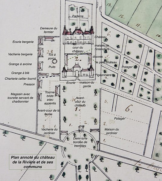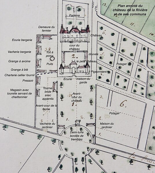 Les façades et toitures du château ; les boiseries du XVIIe siècle du salon ; le pigeonnier ; le pavillon d'entrée ; le portail d'entrée ; les façades et toitures des communs de l'aile sud-ouest (cad. C 34, 33) : inscription par arrêté du 23 décembre 1987 - Les murs de soutènement des douves sèches, les douves sèches, les façades et toitures des communs de l'aile Sud-Est, les façades et toitures de la tour Sud-Est, la plate-forme du château, le canal, les ponts et ponceaux, les allées plantées, les sols des cours, enfin les jardins, le parc et ses murs de clôture dans sa configuration de 1794 (cad. C 34, 36 à 38, 91, lieudit Château de la Rivière, 39, 40, lieudit le Pré Quarré, 41, 42, lieudit la Vigne, 44, lieudit le parc de l'Etoile, 45 ,46, lieudit le pré du canal, 47, lieudit la Futaie) : inscription par arrêté du 18 avril 2013