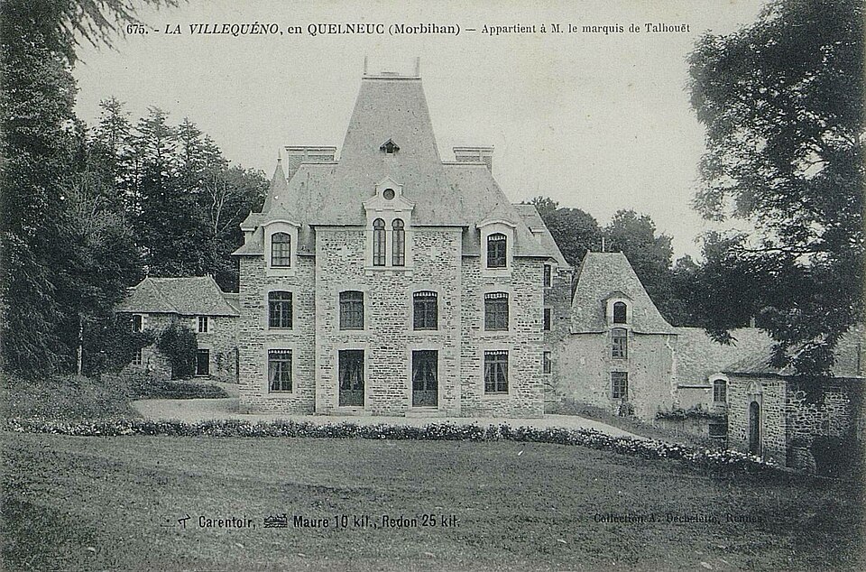 Siège d'une seigneurie connue depuis le XIVe siècle, le domaine de la Ville-Quéno a conservé, au fil du temps, plusieurs états d'édifices. Resté dans une même famille depuis le XVIe siècle, il serait doté d'un vieux manoir remplacé en 1720 par Jean de Talhouët, puis modifié en 1780 sans être achevé. Dans les années 1890, l'architecte angevin Auguste Beignet a recomposé le château actuel en respectant les caractéristiques stylistiques de l'ensemble et en incorporant les éléments subsistants des XVIIe et XVIIIe siècles ; la distribution du logis reste tributaire de celle de l'ancien bâtiment. L'entrée principale, au nord, ouvre sur un vestibule qui abrite l'escalier d'honneur monumental. Le grand salon du rez-de-chaussée a conservé ses boiseries des XVIIe et XVIIIe siècles, tandis que la salle à manger présente un décor de boiseries et de tapisseries du XIXe siècle. Au-delà de l'allée d'arrivée se trouvent les bâtiments de la ferme et, au bord de l'allée, l'ancien verger potager datant du XVIIe siècle. Le moulin à eau du XIXe siècle a conservé l'ensemble de ses machines et son système d'eau. Un parc paysager, dessiné par Busigny en 1893-1894, complète la recomposition du domaine. Cette réorganisation illustre les courants pittoresque, rationaliste et régionaliste : le caractère classique des constructions des XVIIe et XVIIIe siècles est maintenu par un ordonnancement régulier et un équilibre des masses, tandis que l'organisation spatiale et certains choix esthétiques rappellent la fonction originelle du bâtiment et une tradition constructive régionale marquée par une forte volonté pittoresque. Le château est partiellement inscrit au titre des monuments historiques (arrêté du 12 février 2007) ; sont protégés le logis avec ses façades et toitures, l'escalier et sa cage, le salon et la salle à manger, ainsi que les façades et toitures des communs du XVIIe siècle attenants, l'ermitage, l'orangerie, le chenil, les bâtiments de la ferme (maison d'habitation, étable et maison à four) y compris le sol de l'ancien verger et ses murs de clôture, et le moulin de la Fosse en totalité avec l'étang et l'ensemble du système d'eau.