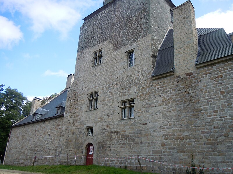Le château de la Villeneuve-Jacquelot, situé à Quistinic au lieu-dit du même nom, est classé au titre des monuments historiques par arrêté du 28 septembre 1970. Partiellement construit au XIIe siècle, le manoir a été édifié vers 1510 par le seigneur de La Villeneuve sur l'emplacement de l'ancien château qu'il transforma en bâtiment de plaisance. Les premières preuves écrites, datées de 1411, établissent que le château était le siège de la seigneurie de la Villeneuve, dont la juridiction couvrait alors 27 paroisses et comprenait les droits de haute, moyenne et basse justice. La famille de Villeneuve s'éteint probablement au XVIe siècle; le domaine passe ensuite, par mariage ou achat, à la famille Cybouault, puis à Louise Cybouault qui épouse vers 1647 Louis de Jacquelot de La Motte, conseiller du roi au parlement de Bretagne en 1644. Une chapelle dédiée à Notre‑Dame‑du‑Cloître est édifiée non loin du château en 1638. Parmi les éléments conservés de différentes époques figurent la grosse tour carrée arrière, attribuée au XIIe siècle, des archères dans le mur nord, les cheminées de deux pièces de l'ouest et la partie ouest de la façade méridionale datées du XIIIe siècle. Du XVIe siècle subsistent les armoiries qui ornent la porte d'entrée en anse de panier, l'accolade décorée de choux frisés de la porte, la tour contenant l'escalier — présenté comme le premier escalier droit monumental construit en Bretagne —, les portes en bois et la cheminée remaniée de la salle d'honneur. La partie orientale du logis et une petite aile ouest, adossée à la tour, relèvent du XVIIe siècle. Le château a été témoin d'événements historiques tels que la guerre de Succession de Bretagne au XIVe siècle, la conspiration de Pontcallec (1718-1720) et la Chouannerie (1792-1804). De 1644 à 1789, il fut la demeure de conseillers au Parlement de Bretagne. Le manoir et la chapelle deviennent la propriété de la famille Magon de La Vieuxville en 1950. Deux films ont été tournés dans le manoir : Chouans ! en 1988 et Marion du Faouët en 1997. Depuis 2009, l'Association La Renaissance Jacquelot restaure le monument et organise des visites. Le 1er décembre 2013, un incendie déclaré dans les combles détruit la toiture et le plancher, ravage deux tours et brûle du mobilier; l'incendie est maîtrisé en fin d'après-midi. Après d'importants travaux, la toiture a été rétablie en 2018 avec une charpente en chêne et des ardoises de Commana. Le château présente un plan rectangulaire, une tour semi‑circulaire en saillie à droite de la façade sur cour et une grosse tour carrée en œuvre sur la façade postérieure. Les ouvertures sont dotées de fenêtres à meneaux et les portes sont encadrées d'accolades. Sa principale singularité architecturale est l'escalier voûté sur croisées d'ogives en granit, enchâssé vers 1510 dans une vaste tour vraisemblablement plus ancienne. L'escalier comprend des volées droites qui s'enroulent autour d'un noyau carré massif de deux mètres de côté, avec des paliers pavés de grandes dalles et surmontés de voûtes d'ogives nervurées dont les quartiers retombent sur des culots. La voûte qui part de la salle d'honneur est soutenue par des arcs-doubleaux et s'appuie le long des murs sur des arcs‑formerets reposant sur des chapiteaux en fin granit sculptés de sujets variés : joueur de biniou, visage trifrons, buste de gentilhomme, esclave supportant le chapiteau, animaux (ours, lion, serpent) et créatures hybrides. Au rez-de-chaussée se trouve une cheminée monumentale; la cage d'escalier, voûtée, et la façade arrière prolongée par la grosse tour carrée contribuent au caractère du bâtiment.